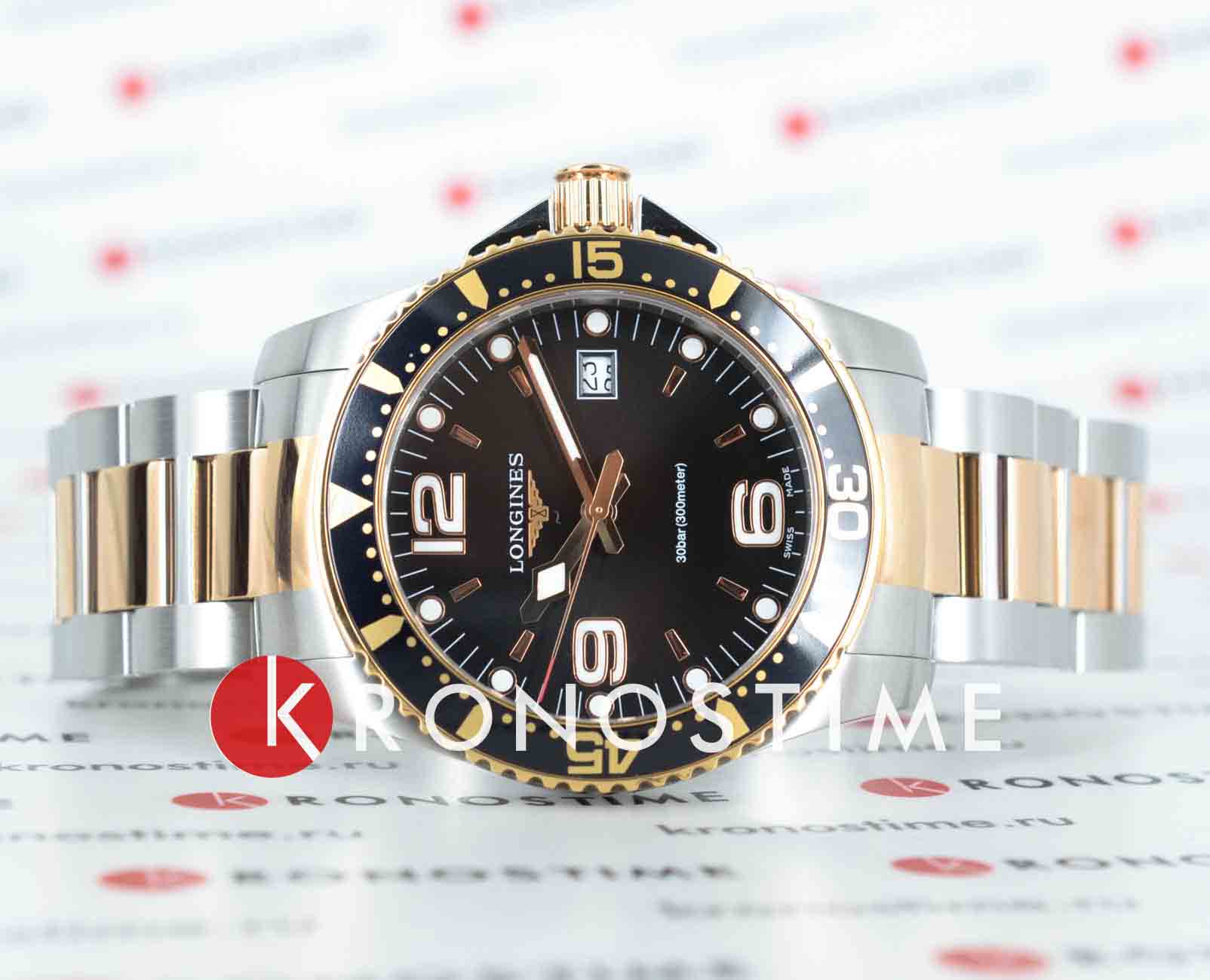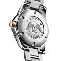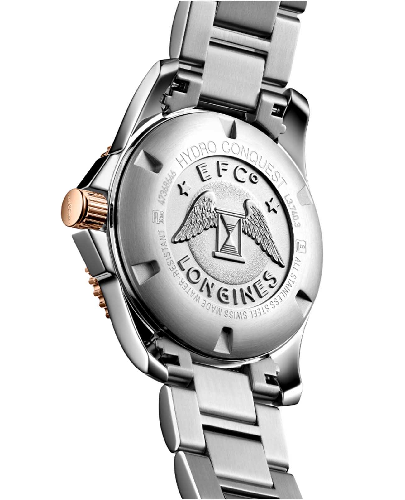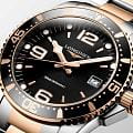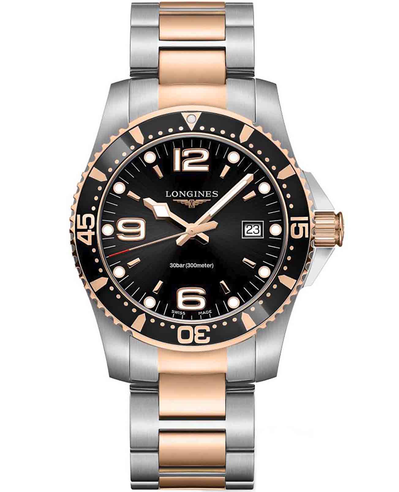 Longines L3.740.3.58.7 – это стильные швейцарские часы с кварцевым механизмом, которые сочетают в себе надежность, функциональность и современный дизайн. Корпус диаметром 41 мм выполнен из нержавеющей стали. Важной деталью является вращающийся стальной безельБезельВнешний ободок, закрепляющий стекло. В спортивных часах так называется поворотное кольцо с делениями на циферблате, выполняет роль таймера – замеряет отрезки времени на шкале. Неподвижный безель – элемент декора. Однонаправленно вращающийся безель на дайверских часах позволяет фиксировать моменты погружения и выныривания на поверхность., изготовленный из комбинации нержавеющей стали с розово-золотистым PVD-покрытиемPVDУльтратонкое покрытие наносится в технике вакуумного напыления, сочетает в себе нитрид титана особой прочности со слоем золота или оксида хрома. Несёт в себе декоративную или защитную функцию.. А центральный ряд звеньев браслета украшен элегантным PVD-покрытиемPVDУльтратонкое покрытие наносится в технике вакуумного напыления, сочетает в себе нитрид титана особой прочности со слоем золота или оксида хрома. Несёт в себе декоративную или защитную функцию. цвета розового золота. Часы оснащены сапфировым стекломСапфировое стеклоПрочный и надёжный материал из кристалла сапфира синтетического происхождения, характеризующийся особой твёрдостью и устойчивостью к царапинам и повреждениям. с антибликовым покрытиемАнтибликовое покрытиеСлой оксида металла в 0,13-0,3 микрон, благодаря которому стекло часов не бликует и не отражает свет. Антибликовое покрытие уменьшает отражение света в 10 раз, обеспечивая отличную читаемость показателей циферблата., устойчивым к царапинам и обеспечивающим отличную видимость циферблата при любом освещении. На черном циферблате находятся индикатор даты и функция EOLEOLПредставляет собой систему, уведомляющую владельца часов о необходимости замены элемента питания. За 2 недели до полного разряда батарейки секундная стрелка перестаёт ходить чётко и начинает перепрыгивать на 3-4 деления., позволяющая своевременно определить разряд батарейки. Завинчивающиеся задняя крышка и заводная головка повышают уровень водостойкости до 30 бар (300 метров), что делает часы подходящими для плавания и занятий водными видами спорта. Внутри корпуса установлен швейцарский калибр L157.3 на базе ETA 255.112, отличающийся высокой точностью и надежностью.