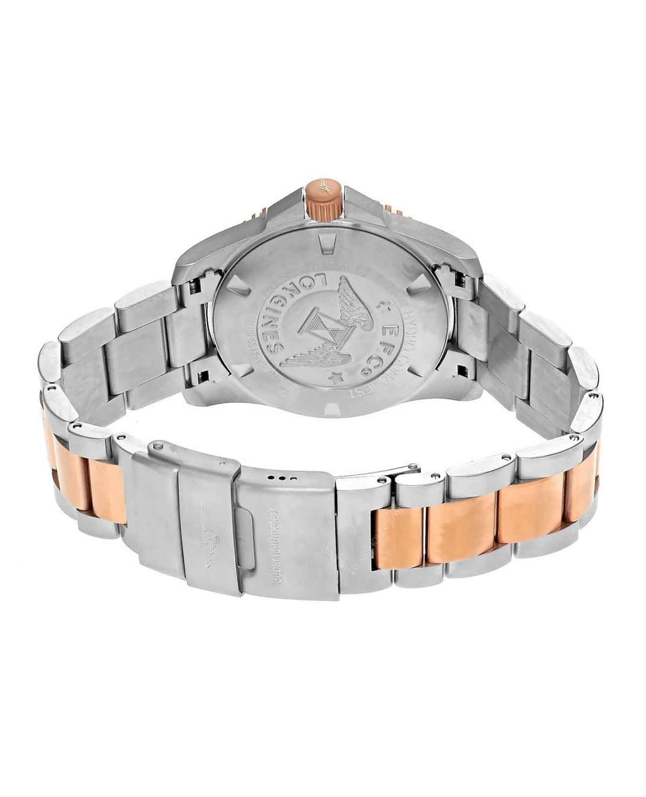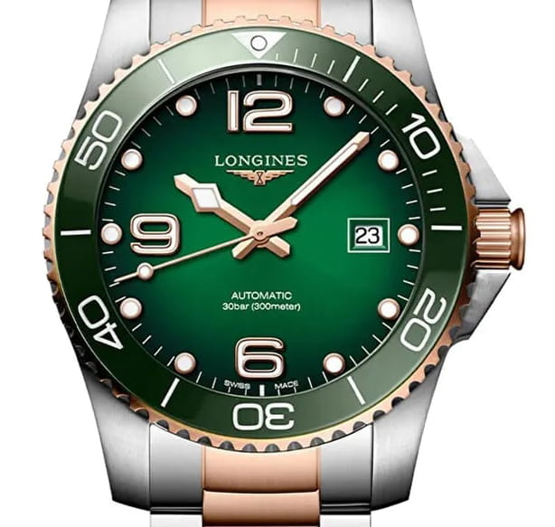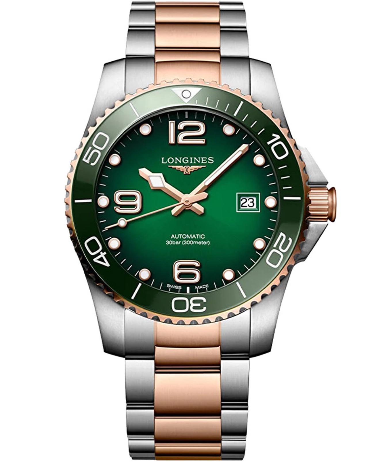 Мужские механические швейцарские часы с автоподзаводом Longines HydroConquest L3.781.3.08.7. Корпус часов изготовлен из нержавеющей стали. Сапфировое стеклоСапфировое стеклоПрочный и надёжный материал из кристалла сапфира синтетического происхождения, характеризующийся особой твёрдостью и устойчивостью к царапинам и повреждениям. с антибликовым покрытием, устойчивое к мелким механическим повреждениям. Стрелки и метки с люминесцентным покрытиемЛюминесцентное покрытиеПозволяет считывать показания времени в темноте. Производители наносят на стрелки, часовые индексы, безель или поверхность циферблата светонакопительный состав, дающий холодное свечение.. Вращающийся стальной безельБезельВнешний ободок, закрепляющий стекло. В спортивных часах так называется поворотное кольцо с делениями на циферблате, выполняет роль таймера – замеряет отрезки времени на шкале. Неподвижный безель – элемент декора. Однонаправленно вращающийся безель на дайверских часах позволяет фиксировать моменты погружения и выныривания на поверхность. с люминесцентным покрытиемЛюминесцентное покрытиеПозволяет считывать показания времени в темноте. Производители наносят на стрелки, часовые индексы, безель или поверхность циферблата светонакопительный состав, дающий холодное свечение. Superluminova из нержавеющей стали и керамики, защищенный от царапин, никогда не изнашивается и не выцветает. Окошко даты находится в положении 3 часа. Класс водозащиты: 300 метров, позволит плавать, нырять и заниматься другими водными видами спорта. Стальной браслет с частичным PVD-покрытиемPVDУльтратонкое покрытие наносится в технике вакуумного напыления, сочетает в себе нитрид титана особой прочности со слоем золота или оксида хрома. Несёт в себе декоративную или защитную функцию. на раскладной застёжкеРаскладная застёжкаТакой тип застёжки используется только на браслетах из металла. Она никогда не раскрывается полностью, происходит разделение на 2 и более частей. Раскладывающая застёжка снизит вероятность потери часов к минимуму. с удлинением для дайверов.