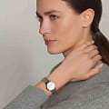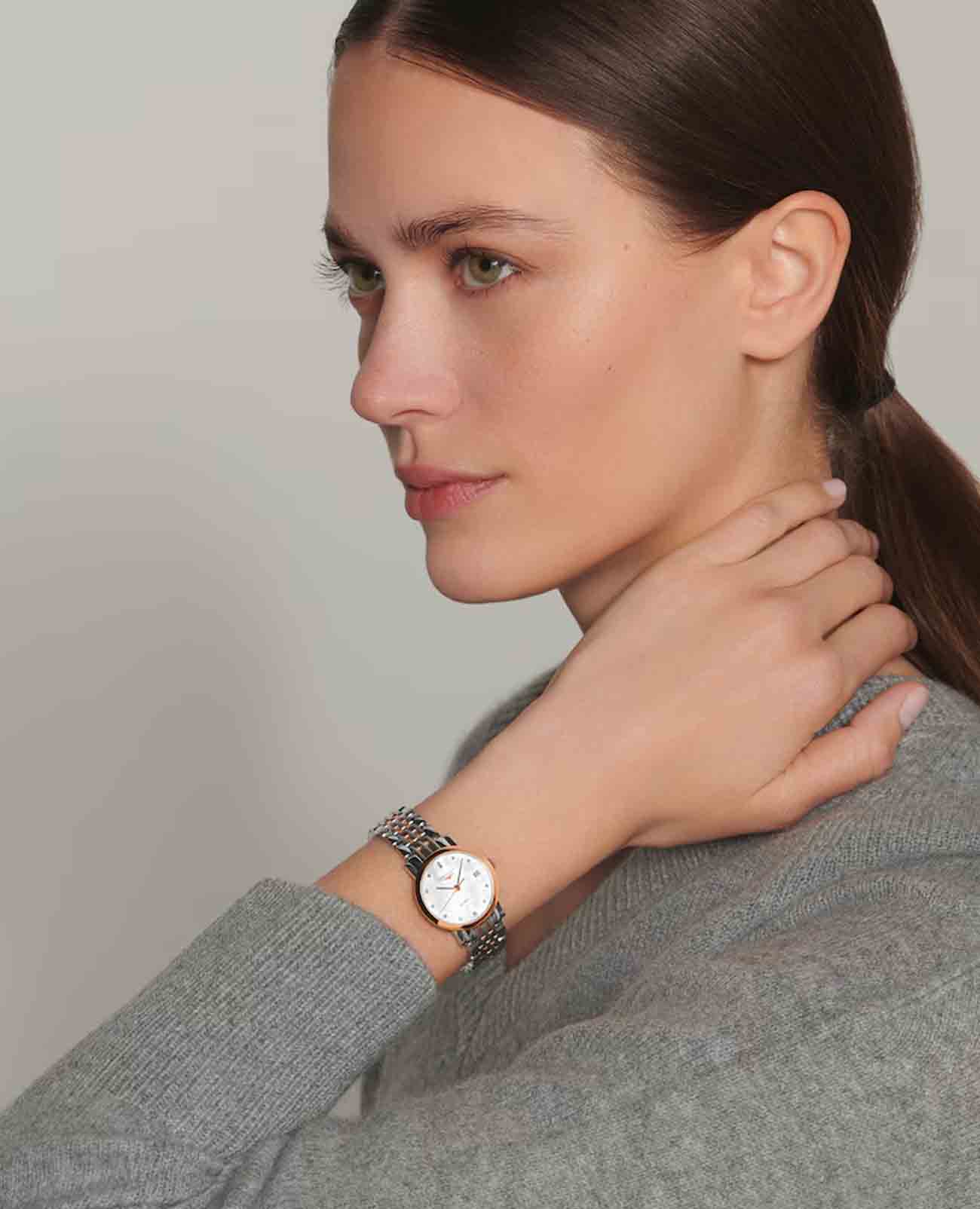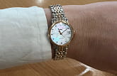 , что придает им неповторимый шарм и утонченность. Бриллиантовые индексы из 13 камней, общим весом в 0,029 карата, элегантно обрамляют перламутровый циферблат, создавая завораживающий эффект.