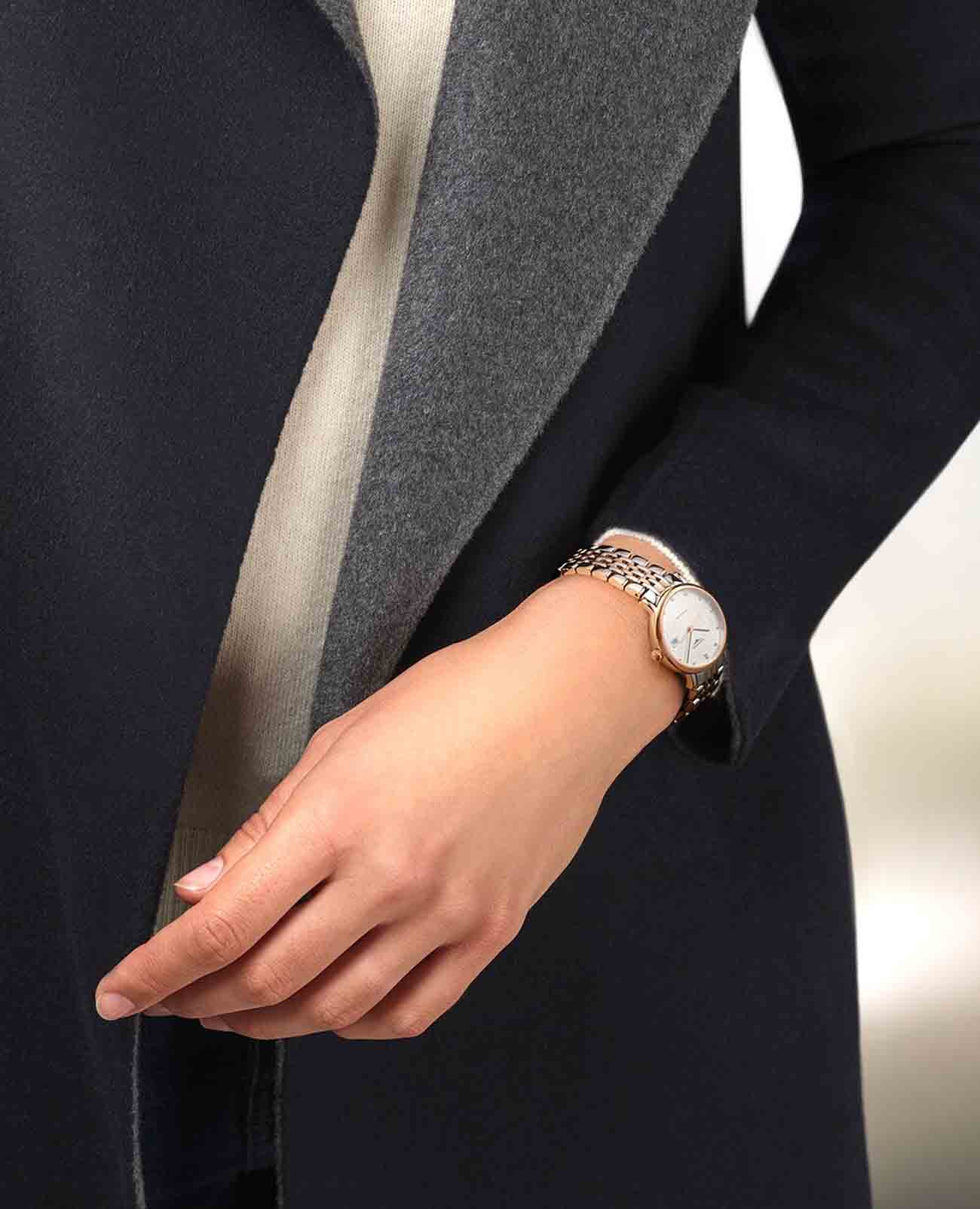 . Швейцарский автоматический калибр L592 имеет 45-часовой резерв хода, понаблюдать за работой механизма можно благодаря прозрачной задней крышке. Браслет из стали и 18-ти каратного розового золота18-каратное золотоОбозначение по каратной системе пробирования, оно показывает, сколько драгоценного металла содержится в изделии. 18 карат - в составе 75% чистого золота, соответствует 750 пробе.