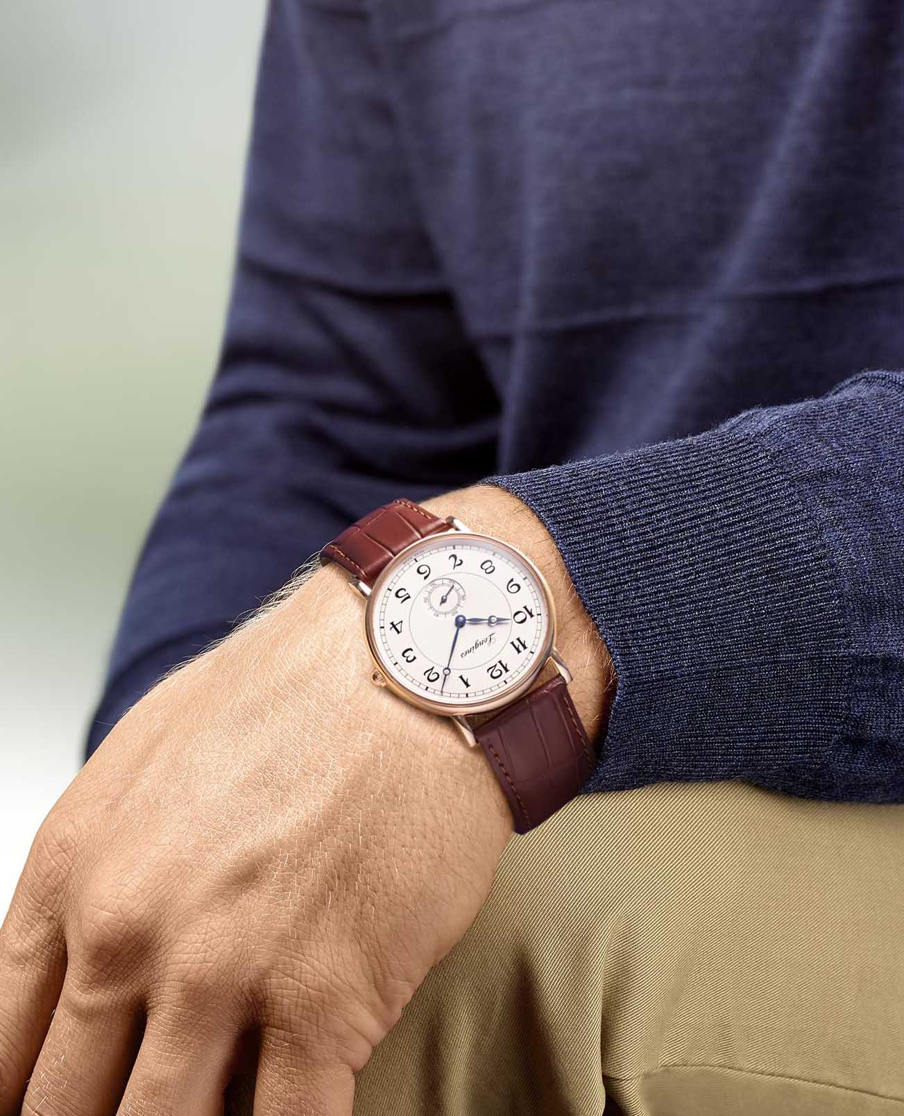 Аксессуар идеально подойдет деловому образу: ремешок из натуральной кожи аллигатора, ретро-стрелки Breguet, изящные линии. Швейцарский автоматический механизм L609 отличается резервом хода на 42 часа, прозрачная задняя крышка позволяет наслаждаться неспешными движениями деталей. Корпус изготовлен из 18-ти каратного розового золота18-каратное золотоОбозначение по каратной системе пробирования, оно показывает, сколько драгоценного металла содержится в изделии. 18 карат - в составе 75% чистого золота, соответствует 750 пробе.