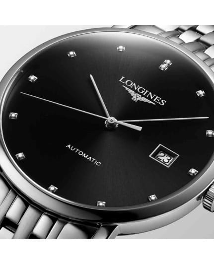 Изысканные мужские часы Longines Elegant Collection L4.910.4.59.6 — это воплощение спокойной роскоши и вечного стиля. Все элементы циферблата подчеркивают элегантность и классический вкус модели. Корпус часов изготовлен из нержавеющей стали, диаметром 39 мм. Защиту циферблата обеспечивает прочное сапфировое стеклоСапфировое стеклоПрочный и надёжный материал из кристалла сапфира синтетического происхождения, характеризующийся особой твёрдостью и устойчивостью к царапинам и повреждениям. с антибликовым покрытиемАнтибликовое покрытиеСлой оксида металла в 0,13-0,3 микрон, благодаря которому стекло часов не бликует и не отражает свет. Антибликовое покрытие уменьшает отражение света в 10 раз, обеспечивая отличную читаемость показателей циферблата. гарантирующее четкость показаний. Циферблат украшен 13 бриллиантами Top Wesselton VS-SI общим весом 0,032 карата. Автоматический механизм L888 обеспечивает высокую точность и простоту использования. Водостойкость до 30 метров позволит плавать, нырять и заниматься другими водными видами спорта. Изысканный браслет выполнен из нержавеющей стали на застёжке-бабочке с кнопкамиЗастёжка "бабочка"Такой вид застёжки дополняется предохранителями, помогающими избежать случайного раскрытия браслета. Обладают изящным исполнением. , обеспечивающей комфортное ношение и надёжную фиксацию на запястье. Окошко даты в положении 3 часа. Коллекция The Elegant Collection сочетает в себе классическую элегантность и современный подход к дизайну, делая эти часы универсальным аксессуаром — как для торжественных случаев, так и для повседневной жизни.