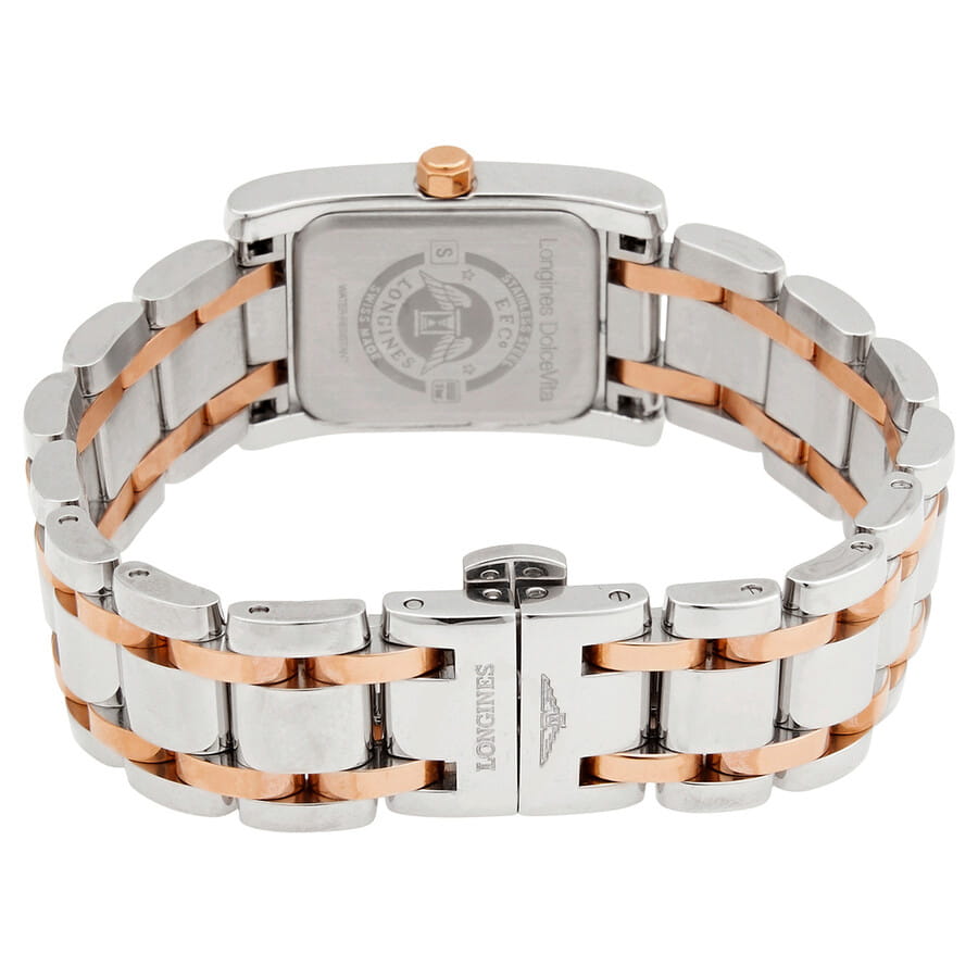 Женские швейцарские часы с бриллиантами Longines DolceVita L5.155.5.89.7, кварцевый механизм с высокой точностью. Сапфировое стеклоСапфировое стеклоПрочный и надёжный материал из кристалла сапфира синтетического происхождения, характеризующийся особой твёрдостью и устойчивостью к царапинам и повреждениям. устойчивое к появлению царапин, обладающее высокой прозрачностью. Класс водозащиты: 30 метров, позволит защитить корпус от случайных брызг или капель дождя. Браслет из нержавеющей стали со звеньями из розового золота. Фиксированный безель из нержавеющей стали с кольцом из розового золота и бриллиантами. Белый перламутровый циферблат с черными стрелками и бриллиантовыми часовыми метками. Застёжка бабочка с кнопкамиЗастёжка "бабочка"Такой вид застёжки дополняется предохранителями, помогающими избежать случайного раскрытия браслета. Обладают изящным исполнением. .
