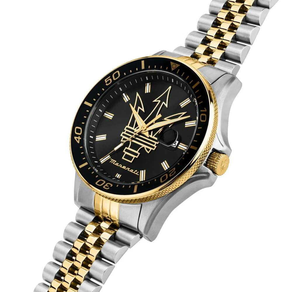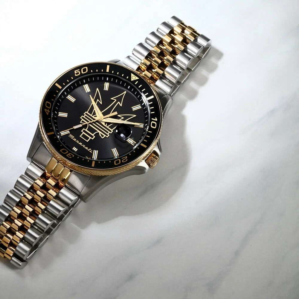 Модель Maserati Sfida R8853140009 — воплощение стиля и функциональности для современных мужчин, ценящих качество и элегантность. Корпус диаметром 44 мм выполнен из нержавеющей стали, обеспечивая прочность и долговечность. Минеральное стеклоМинеральное стеклоМинеральное стекло представляет собой искусственно выращенный минерал кварца. Такое стекло отличается особой устойчивостью к повреждениям и царапинам. Уступает по некоторым качествам сапфировому стеклу. надежно защищает синий циферблат с изящными рисками, придавая часам утонченный вид. Благодаря водостойкости до 100 метров (10 АТМ), эти часы станут вашим надежным спутником в любых условиях, будь то деловая встреча или активный отдых. Люминесцентное покрытиеЛюминесцентное покрытиеПозволяет считывать показания времени в темноте. Производители наносят на стрелки, часовые индексы, безель или поверхность циферблата светонакопительный состав, дающий холодное свечение. на стрелках и метках обеспечивает отличную видимость в темноте. Завершающий штрих — стальной браслет на застёжке-бабочке с кнопкамиЗастёжка "бабочка"Такой вид застёжки дополняется предохранителями, помогающими избежать случайного раскрытия браслета. Обладают изящным исполнением. , который подчеркивает общий стиль, обеспечивая комфорт и надежность в носке. Вращающийся стальной безельБезельВнешний ободок, закрепляющий стекло. В спортивных часах так называется поворотное кольцо с делениями на циферблате, выполняет роль таймера – замеряет отрезки времени на шкале. Неподвижный безель – элемент декора. Однонаправленно вращающийся безель на дайверских часах позволяет фиксировать моменты погружения и выныривания на поверхность. с PVD-покрытиемPVDУльтратонкое покрытие наносится в технике вакуумного напыления, сочетает в себе нитрид титана особой прочности со слоем золота или оксида хрома. Несёт в себе декоративную или защитную функцию.. Циферблат выполнен по технологии Sunray (солнечные лучи) и украшен фирменным логотипом «Maserati». Метки в виде штрихов. Окошко даты с увеличительным стеклом находится в положении 3 часа.