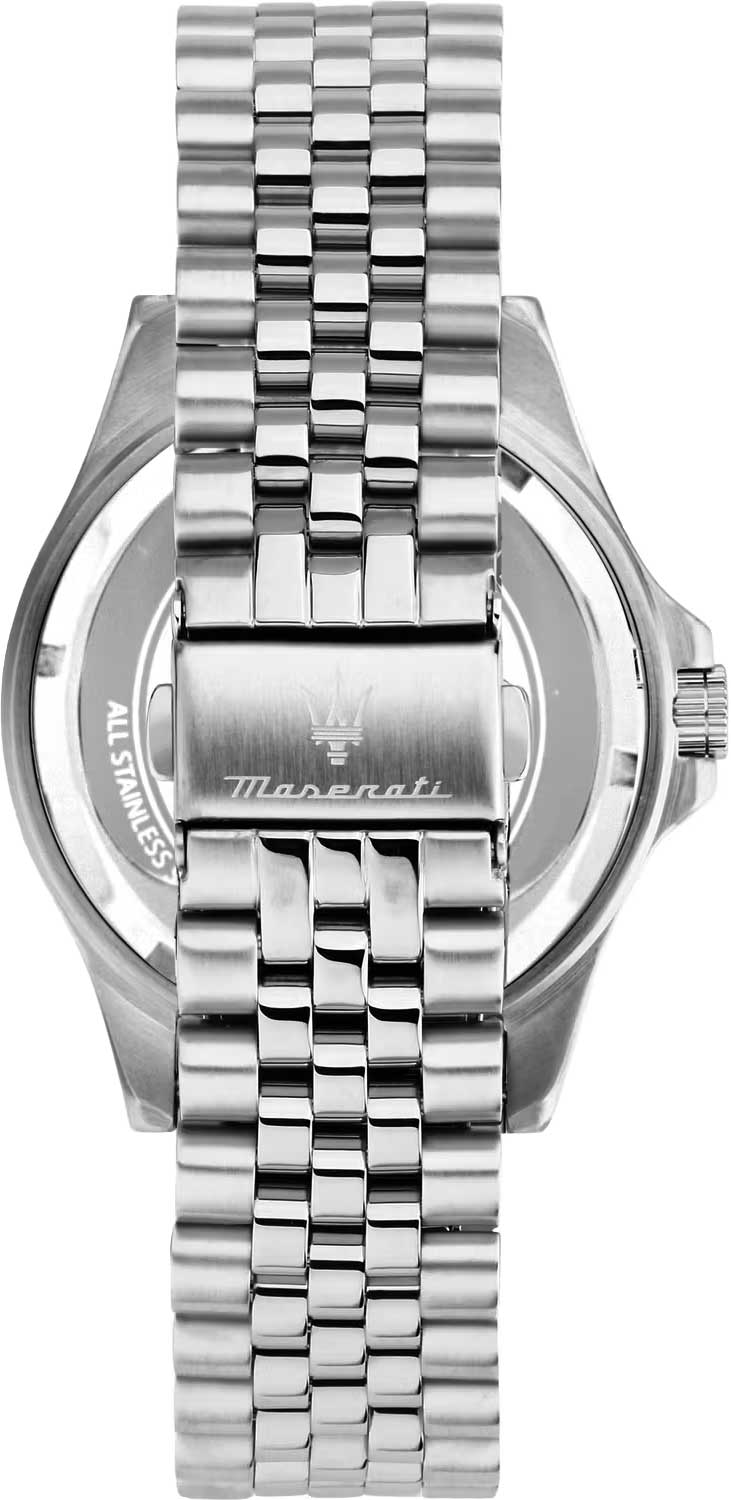 Модель Maserati Sfida R8853140010 — воплощение стиля и функциональности для современных мужчин, ценящих качество и элегантность. Корпус диаметром 44 мм выполнен из нержавеющей стали, обеспечивая прочность и долговечность. Минеральное стеклоМинеральное стеклоМинеральное стекло представляет собой искусственно выращенный минерал кварца. Такое стекло отличается особой устойчивостью к повреждениям и царапинам. Уступает по некоторым качествам сапфировому стеклу. надежно защищает синий циферблат с изящными рисками, придавая часам утонченный вид. Благодаря водостойкости до 100 метров (10 АТМ), эти часы станут вашим надежным спутником в любых условиях, будь то деловая встреча или активный отдых. Люминесцентное покрытиеЛюминесцентное покрытиеПозволяет считывать показания времени в темноте. Производители наносят на стрелки, часовые индексы, безель или поверхность циферблата светонакопительный состав, дающий холодное свечение. на стрелках и метках обеспечивает отличную видимость в темноте. Завершающий штрих — стальной браслет с раскладной застёжкойРаскладная застёжкаТакой тип застёжки используется только на браслетах из металла. Она никогда не раскрывается полностью, происходит разделение на 2 и более частей. Раскладывающая застёжка снизит вероятность потери часов к минимуму., который подчеркивает общий стиль, обеспечивая комфорт и надежность в носке. Вращающийся стальной безельБезельВнешний ободок, закрепляющий стекло. В спортивных часах так называется поворотное кольцо с делениями на циферблате, выполняет роль таймера – замеряет отрезки времени на шкале. Неподвижный безель – элемент декора. Однонаправленно вращающийся безель на дайверских часах позволяет фиксировать моменты погружения и выныривания на поверхность. с IP-покрытиемIP-покрытиеМетод ионного напыления. Демонстрирует повышенную устойчивость к истиранию, окислению и химическим веществам. Под воздействием высокого давления и температуры около 1500°C молекулы металла надёжно соединяются с частицами корпуса часов.. Циферблат выполнен по технологии Sunray (солнечные лучи) и украшен фирменным логотипом «Maserati». Метки в виде штрихов. Окошко даты с увеличительным стеклом находится в положении 3 часа.