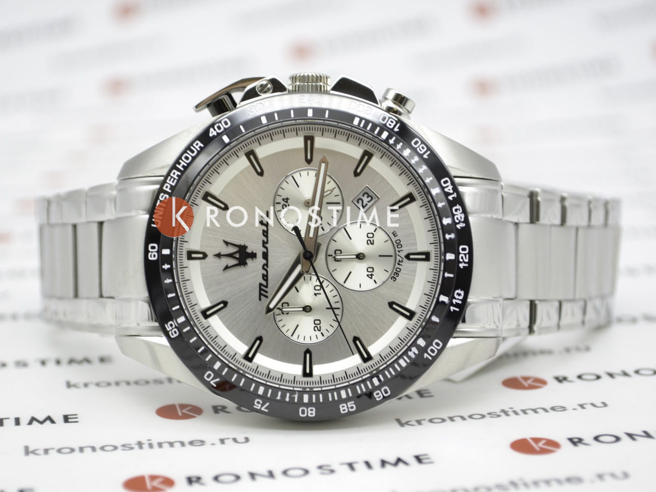 Мужские наручные часы-хронографХронографФункция позволяет измерять отрезки времени с особой точностью: часы, минуты, секунды. Верным признаком хронографа является наличие на циферблате 3 дополнительных окошек-счётчиков. Maserati R8873650002, кварцевый механизм (автоматический калибр) с высокой точностью. Минеральное стеклоМинеральное стеклоМинеральное стекло представляет собой искусственно выращенный минерал кварца. Такое стекло отличается особой устойчивостью к повреждениям и царапинам. Уступает по некоторым качествам сапфировому стеклу. устойчивое к появлению царапин, обладающее высокой прозрачностью. Стрелки и метки с люминесцентным покрытиемЛюминесцентное покрытиеПозволяет считывать показания времени в темноте. Производители наносят на стрелки, часовые индексы, безель или поверхность циферблата светонакопительный состав, дающий холодное свечение.. Класс водозащиты: 100 метров, позволит плавать, нырять и заниматься другими водными видами спорта.БезельБезельВнешний ободок, закрепляющий стекло. В спортивных часах так называется поворотное кольцо с делениями на циферблате, выполняет роль таймера – замеряет отрезки времени на шкале. Неподвижный безель – элемент декора. Однонаправленно вращающийся безель на дайверских часах позволяет фиксировать моменты погружения и выныривания на поверхность. изготовлен из нержавеющей стали с PVD-покрытиемPVDУльтратонкое покрытие наносится в технике вакуумного напыления, сочетает в себе нитрид титана особой прочности со слоем золота или оксида хрома. Несёт в себе декоративную или защитную функцию.. Браслет с раскладной застёжкойРаскладная застёжкаТакой тип застёжки используется только на браслетах из металла. Она никогда не раскрывается полностью, происходит разделение на 2 и более частей. Раскладывающая застёжка снизит вероятность потери часов к минимуму. и с PVD-покрытиемPVDУльтратонкое покрытие наносится в технике вакуумного напыления, сочетает в себе нитрид титана особой прочности со слоем золота или оксида хрома. Несёт в себе декоративную или защитную функцию..