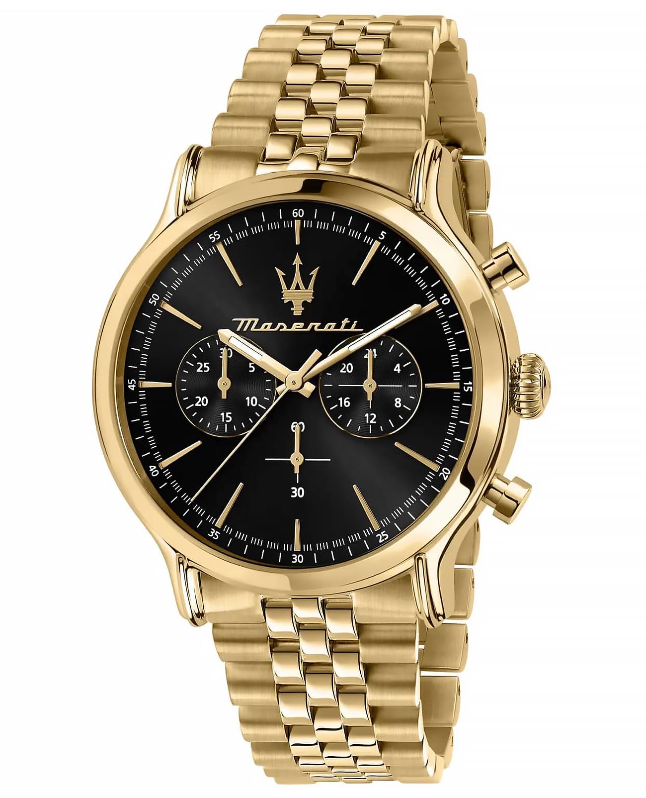Мужские итальянские часы-хронографХронографФункция позволяет измерять отрезки времени с особой точностью: часы, минуты, секунды. Верным признаком хронографа является наличие на циферблате 3 дополнительных окошек-счётчиков. Maserati Epoca R8873618023, кварцевый механизм с высокой точностью. Минеральное стеклоМинеральное стеклоМинеральное стекло представляет собой искусственно выращенный минерал кварца. Такое стекло отличается особой устойчивостью к повреждениям и царапинам. Уступает по некоторым качествам сапфировому стеклу. устойчивое к появлению царапин и износу. Класс водозащиты: 100 метров, позволит плавать, нырять и заниматься другими водными видами спорта. Корпус и браслет часов изготовлен из стали с PVD-покрытиемPVDУльтратонкое покрытие наносится в технике вакуумного напыления, сочетает в себе нитрид титана особой прочности со слоем золота или оксида хрома. Несёт в себе декоративную или защитную функцию.. Люминесцентная подсветкаЛюминесцентное покрытиеПозволяет считывать показания времени в темноте. Производители наносят на стрелки, часовые индексы, безель или поверхность циферблата светонакопительный состав, дающий холодное свечение. стрелок.