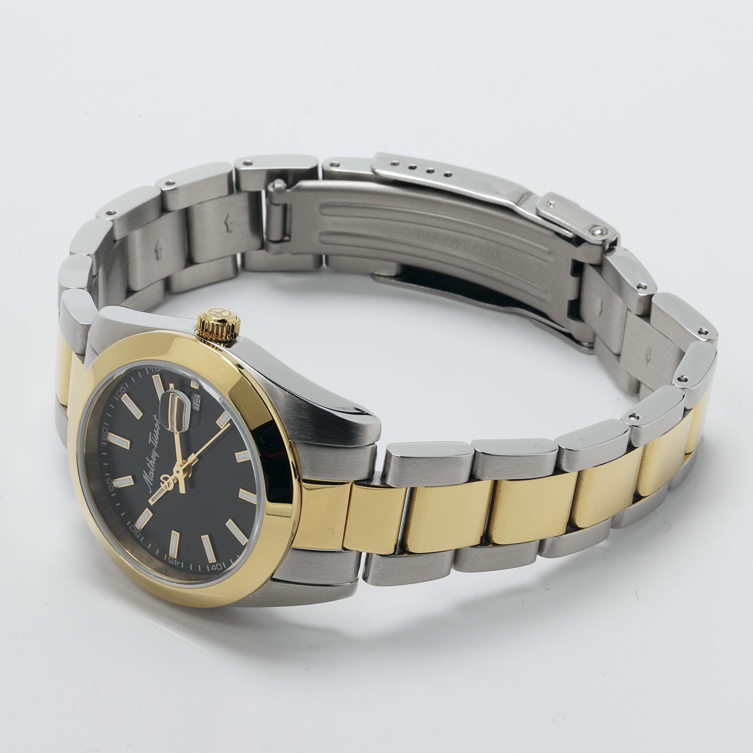 Женские кварцевые часы Mathey-Tissot Mathy D450BN — это стильное сочетание элегантности и современного дизайна. Изящный корпус выполнен из нержавеющей стали, диаметром 30 мм, что придаст образу женственности и романтизма. Изысканный циферблат с метками в виде штрихов придает модели особый блеск. Циферблат защищен минеральным стекломМинеральное стеклоМинеральное стекло представляет собой искусственно выращенный минерал кварца. Такое стекло отличается особой устойчивостью к повреждениям и царапинам. Уступает по некоторым качествам сапфировому стеклу., обеспечивающий устойчивость к царапинам. Стрелки и метки с люминесцентным покрытиемЛюминесцентное покрытиеПозволяет считывать показания времени в темноте. Производители наносят на стрелки, часовые индексы, безель или поверхность циферблата светонакопительный состав, дающий холодное свечение.. БезельБезельВнешний ободок, закрепляющий стекло. В спортивных часах так называется поворотное кольцо с делениями на циферблате, выполняет роль таймера – замеряет отрезки времени на шкале. Неподвижный безель – элемент декора. Однонаправленно вращающийся безель на дайверских часах позволяет фиксировать моменты погружения и выныривания на поверхность. с PVD-покрытиемPVDУльтратонкое покрытие наносится в технике вакуумного напыления, сочетает в себе нитрид титана особой прочности со слоем золота или оксида хрома. Несёт в себе декоративную или защитную функцию. золотистого цвета. Окошко даты находится в положении 3 часа. Часы оснащены надежным кварцевым механизмом. Стальной браслет с частичным PVD-покрытиемPVDУльтратонкое покрытие наносится в технике вакуумного напыления, сочетает в себе нитрид титана особой прочности со слоем золота или оксида хрома. Несёт в себе декоративную или защитную функцию. на раскладной застёжке с фиксаторомРаскладная застёжкаТакой тип застёжки используется только на браслетах из металла. Она никогда не раскрывается полностью, происходит разделение на 2 и более частей. Раскладывающая застёжка снизит вероятность потери часов к минимуму., гарантирует комфортное и безопасное ношение. Класс водозащиты: 50 метров позволит защитить корпус от случайных брызг или капель дождя. Mathey-Tissot — отличный выбор для тех, кто ценит утонченность и качество.