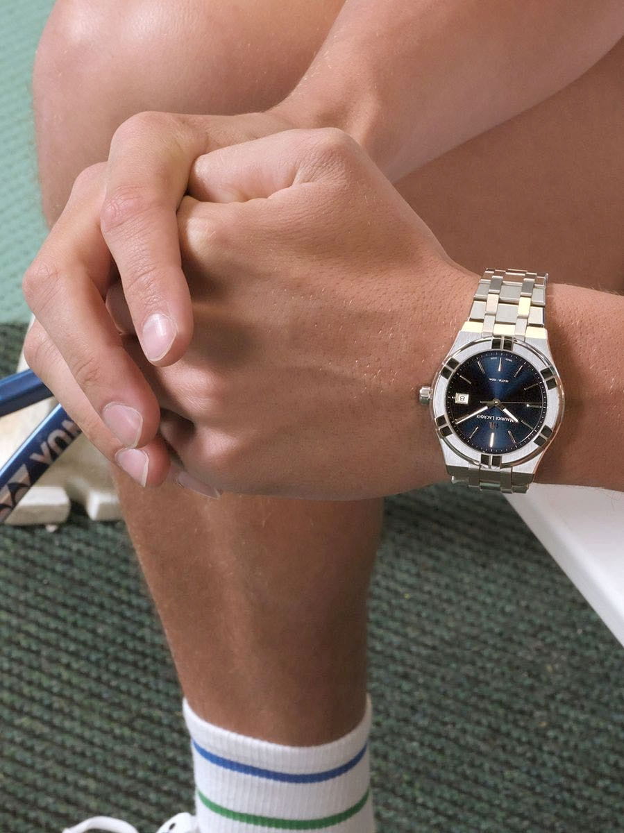 Мужские швейцарские кварцевые часы Maurice Lacroix Aikon Quartz AI1108-SS002-430-1. Сапфировое стеклоСапфировое стеклоПрочный и надёжный материал из кристалла сапфира синтетического происхождения, характеризующийся особой твёрдостью и устойчивостью к царапинам и повреждениям. устойчивое к появлению царапин, обладающее высокой прозрачностью. Синий циферблат. Стрелки с люминесцентным покрытиемЛюминесцентное покрытиеПозволяет считывать показания времени в темноте. Производители наносят на стрелки, часовые индексы, безель или поверхность циферблата светонакопительный состав, дающий холодное свечение.. Класс водозащиты: 100 метров, позволит плавать, нырять и заниматься другими водными видами спорта. Окошко даты находится в положении 3 часов. Корпус и браслет часов изготовлены из стали. Браслет с застёжкой «бабочка» с кнопкамиЗастёжка "бабочка"Такой вид застёжки дополняется предохранителями, помогающими избежать случайного раскрытия браслета. Обладают изящным исполнением. .