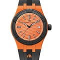 Мужские швейцарские кварцевые часы Maurice Lacroix Aikon Quartz AI2008-50050-300-0. Сапфировое стеклоСапфировое стеклоПрочный и надёжный материал из кристалла сапфира синтетического происхождения, характеризующийся особой твёрдостью и устойчивостью к царапинам и повреждениям. устойчивое к появлению царапин, обладающее высокой прозрачностью. Оранжевый циферблат. Стрелки и метки с люминесцентным покрытиемЛюминесцентное покрытиеПозволяет считывать показания времени в темноте. Производители наносят на стрелки, часовые индексы, безель или поверхность циферблата светонакопительный состав, дающий холодное свечение.. Класс водозащиты: 100 метров, позволит плавать, нырять и заниматься другими водными видами спорта. Окошко даты находится в положении 3 часов. Циферблат с тематическим гильошированием "Vagues du Jura". Корпус выполнен из переработанного пластика, ранее загрязнявшего Мировой океан. Каучуковый ремешок с классической застежкой.