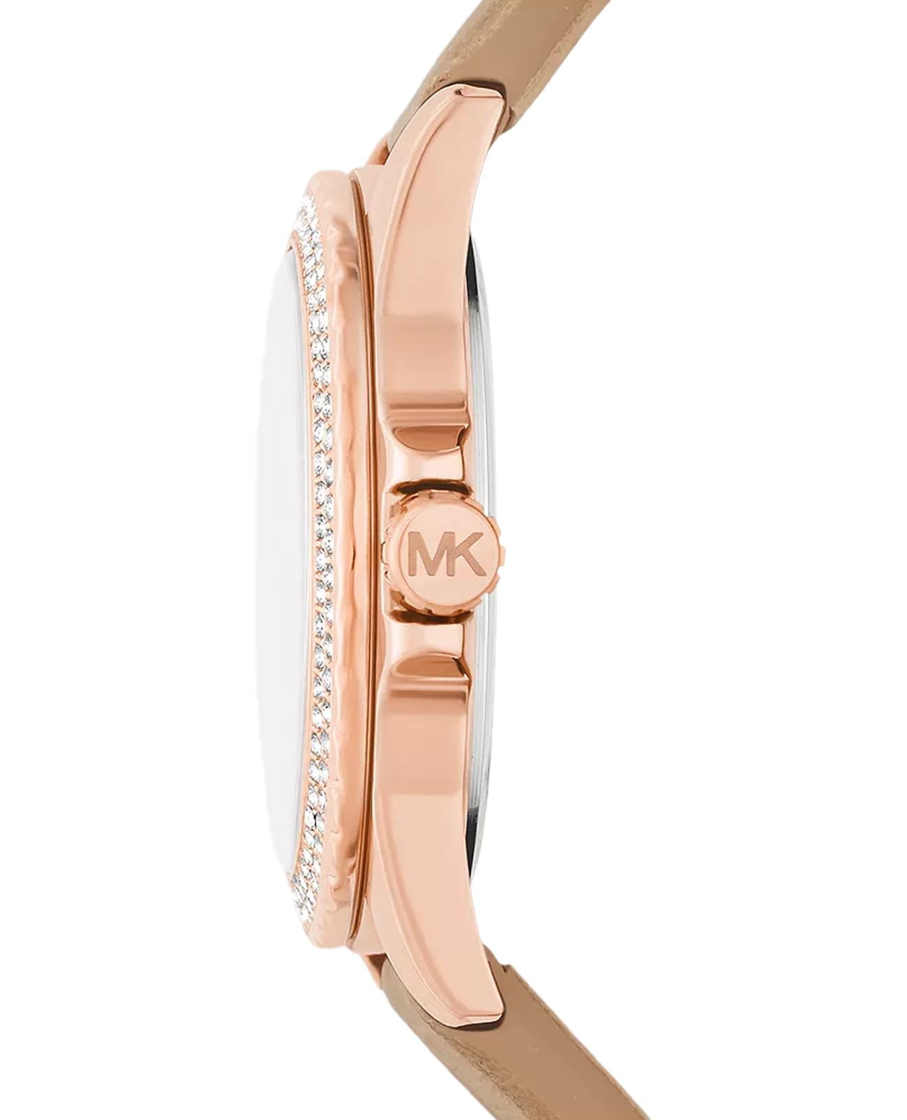 Женские американские часы с секундомеромСекундомерСекундоме́р — прибор, способный измерять интервалы времени с точностью до долей секунды. и с минеральным стекломМинеральное стеклоМинеральное стекло представляет собой искусственно выращенный минерал кварца. Такое стекло отличается особой устойчивостью к повреждениям и царапинам. Уступает по некоторым качествам сапфировому стеклу. Michael Kors Everest MK4719, кварцевый механизм с высокой точностью. Корпус часов изготовлен из нержавеющей стали с PVD-покрытиемPVDУльтратонкое покрытие наносится в технике вакуумного напыления, сочетает в себе нитрид титана особой прочности со слоем золота или оксида хрома. Несёт в себе декоративную или защитную функцию.. БезельБезельВнешний ободок, закрепляющий стекло. В спортивных часах так называется поворотное кольцо с делениями на циферблате, выполняет роль таймера – замеряет отрезки времени на шкале. Неподвижный безель – элемент декора. Однонаправленно вращающийся безель на дайверских часах позволяет фиксировать моменты погружения и выныривания на поверхность. и циферблат украшены кристаллами. Метки в виде штрихов и римских цифр. Секундная стрелка вынесена на малый циферблат. Метки с люминесцентным покрытиемЛюминесцентное покрытиеПозволяет считывать показания времени в темноте. Производители наносят на стрелки, часовые индексы, безель или поверхность циферблата светонакопительный состав, дающий холодное свечение.. Заводная головка с защитой. Класс водозащиты: 50 метров, позволит защитить корпус от случайных брызг или капель дождя. Кожаный ремешок на стандартной застёжке.