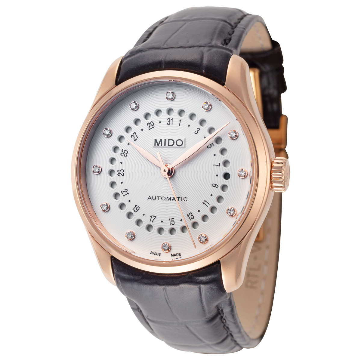 Мужские швейцарские механические часы с системой автоматического подзавода Mido Belluna M024.207.36.036.00, механический механизм (автоматический калибр) с высокой точностью. Сапфировое стеклоСапфировое стеклоПрочный и надёжный материал из кристалла сапфира синтетического происхождения, характеризующийся особой твёрдостью и устойчивостью к царапинам и повреждениям. устойчивое к появлению царапин, обладающее высокой прозрачностью. Класс водозащиты: 50 метров, позволит защитить корпус от случайных брызг или капель дождя. Корпус часов изготовлен из стали с PVD-покрытиемPVDУльтратонкое покрытие наносится в технике вакуумного напыления, сочетает в себе нитрид титана особой прочности со слоем золота или оксида хрома. Несёт в себе декоративную или защитную функцию.. БезельБезельВнешний ободок, закрепляющий стекло. В спортивных часах так называется поворотное кольцо с делениями на циферблате, выполняет роль таймера – замеряет отрезки времени на шкале. Неподвижный безель – элемент декора. Однонаправленно вращающийся безель на дайверских часах позволяет фиксировать моменты погружения и выныривания на поверхность. с PVD-покрытиемPVDУльтратонкое покрытие наносится в технике вакуумного напыления, сочетает в себе нитрид титана особой прочности со слоем золота или оксида хрома. Несёт в себе декоративную или защитную функцию.. Шикарная классика в стильном исполнении. Бриллианты вместо разметки. Циферблат выполнен с расходящимся гильоше волнами. Индикация даты выполнена в виде апертуры.