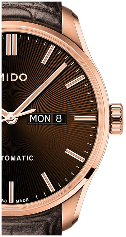 Дизайн модели - результат работы часовщиков, вдохновленных стеклянным куполом лондонского Альберт-холла. Мужские швейцарские механические часы с автоподзаводом Mido Belluna Sunray M024.630.36.291.00, механический механизм (автоматический калибр) с высокой точностью. Сапфировое стеклоСапфировое стеклоПрочный и надёжный материал из кристалла сапфира синтетического происхождения, характеризующийся особой твёрдостью и устойчивостью к царапинам и повреждениям. устойчивое к появлению царапин, обладающее высокой прозрачностью, двойным антибликовым покрытием. Класс водозащиты: 50 метров, позволит защитить корпус от случайных брызг или капель дождя. Корпус часов изготовлен из стали с PVD-покрытиемPVDУльтратонкое покрытие наносится в технике вакуумного напыления, сочетает в себе нитрид титана особой прочности со слоем золота или оксида хрома. Несёт в себе декоративную или защитную функцию.. Окошки дня недели и даты находятся в положении 3 часа. Кожаный ремешок на стандартной застёжке. Циферблат с гильоше «солнечные лучи», завинчивающаяся прозрачная задняя крышка.