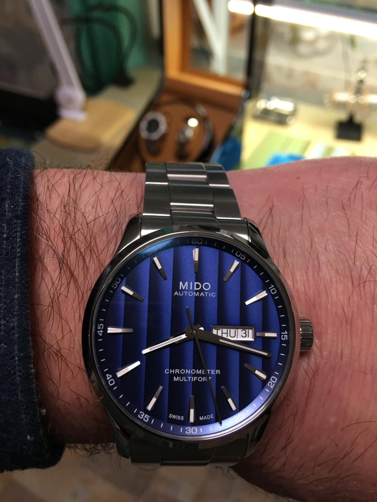 Часы MIDO Multifort Chronometer 1 (артикул M038.431.11.041.00) сочетают элегантный дизайн и высокую точность, сертифицированную COSCСертификат COSCОфициальный сертификат, подтверждающий то, что часы ходят с особо высокой точностью. Для получения документа часы подвергаются тестовым испытаниям, разработанным швейцарским институтом тестирования хронометров COSC. Допустимая норма для механических часов -4/+6 секунд в день, для кварцевых моделей +/- 0,07 секунд в день.. Корпус диаметром 42 мм выполнен из нержавеющей стали с водозащитой до 10 бар (100 метров). Прозрачная задняя крышка подчёркивает изысканный механизм. Синий циферблат с узором «Côtes de Genève» оснащён накладными часовыми метками и стрелками с покрытием Super-LumiNova®Люминесцентное покрытиеПозволяет считывать показания времени в темноте. Производители наносят на стрелки, часовые индексы, безель или поверхность циферблата светонакопительный состав, дающий холодное свечение.. Окошки даты и дня недели расположены в положении «3 часа». Циферблат защищён сапфировым стекломСапфировое стеклоПрочный и надёжный материал из кристалла сапфира синтетического происхождения, характеризующийся особой твёрдостью и устойчивостью к царапинам и повреждениям. с двусторонним антибликовым покрытием.