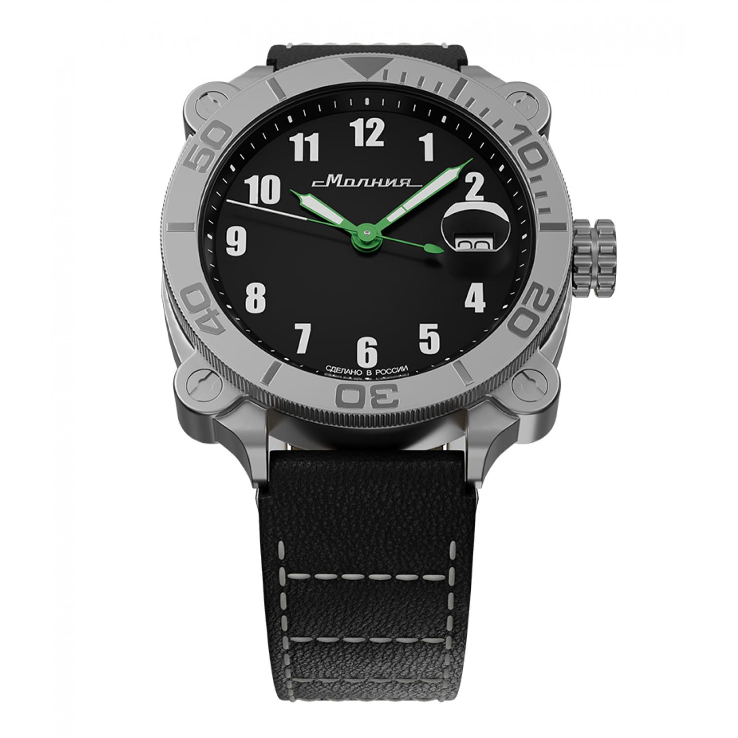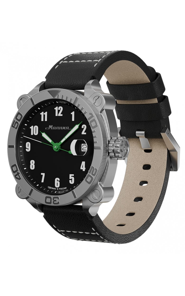 Мужские механические часы с автоподзаводом от бренда «МОЛНИЯ» — это стильный аксессуар, вдохновлённый дизайном приборной панели легендарного танка Т-72. Корпус диаметром 42 мм и толщиной 12 мм выполнен из нержавеющей стали 316L с матовой полировкой. БезельБезельВнешний ободок, закрепляющий стекло. В спортивных часах так называется поворотное кольцо с делениями на циферблате, выполняет роль таймера – замеряет отрезки времени на шкале. Неподвижный безель – элемент декора. Однонаправленно вращающийся безель на дайверских часах позволяет фиксировать моменты погружения и выныривания на поверхность. однонаправленный, вращающийся. Циферблат чёрного цвета оформлен арабскими цифрами и логотипом бренда. Окошко даты расположено в положении 3 часов и оснащено увеличительным стеклом. Стрелки и метки с люминесцентным покрытиемЛюминесцентное покрытиеПозволяет считывать показания времени в темноте. Производители наносят на стрелки, часовые индексы, безель или поверхность циферблата светонакопительный состав, дающий холодное свечение. Super-LumiNova. Циферблат защищён сапфировым стекломСапфировое стеклоПрочный и надёжный материал из кристалла сапфира синтетического происхождения, характеризующийся особой твёрдостью и устойчивостью к царапинам и повреждениям. с антибликовым покрытиемАнтибликовое покрытиеСлой оксида металла в 0,13-0,3 микрон, благодаря которому стекло часов не бликует и не отражает свет. Антибликовое покрытие уменьшает отражение света в 10 раз, обеспечивая отличную читаемость показателей циферблата.. Механизм — Русский автоматический калибр Восток 2416 запас хода до 42 часов. Заводная головка стилизована под гусеничную ленту, задняя крышка с гравировкой танка. Часы оснащены кожаным ремешком чёрного цвета с классической пряжкой и системой быстрой замены. Водонепроницаемость 100 м позволяет использовать часы для плавания и повседневного ношения. Идеальный выбор для тех, кто ценит инженерное наследие и мощный дизайн.