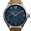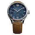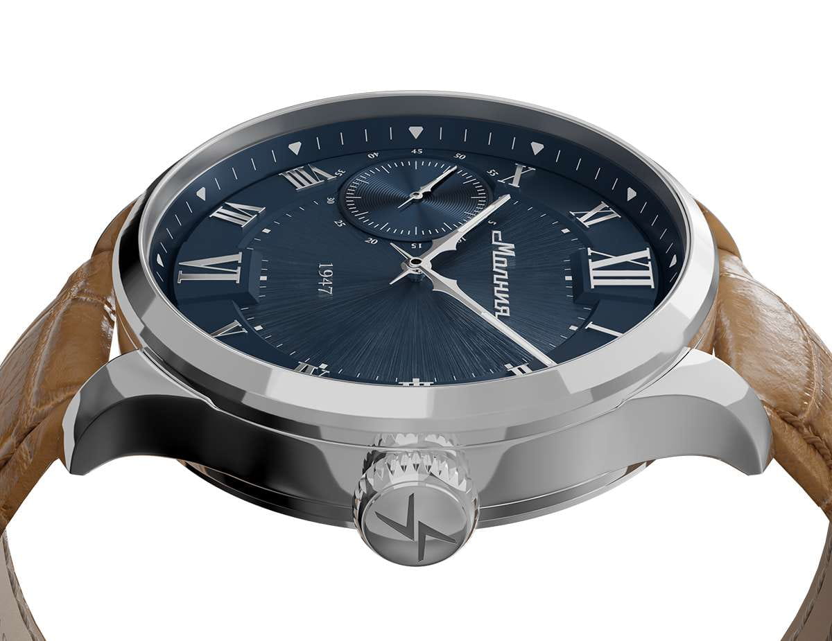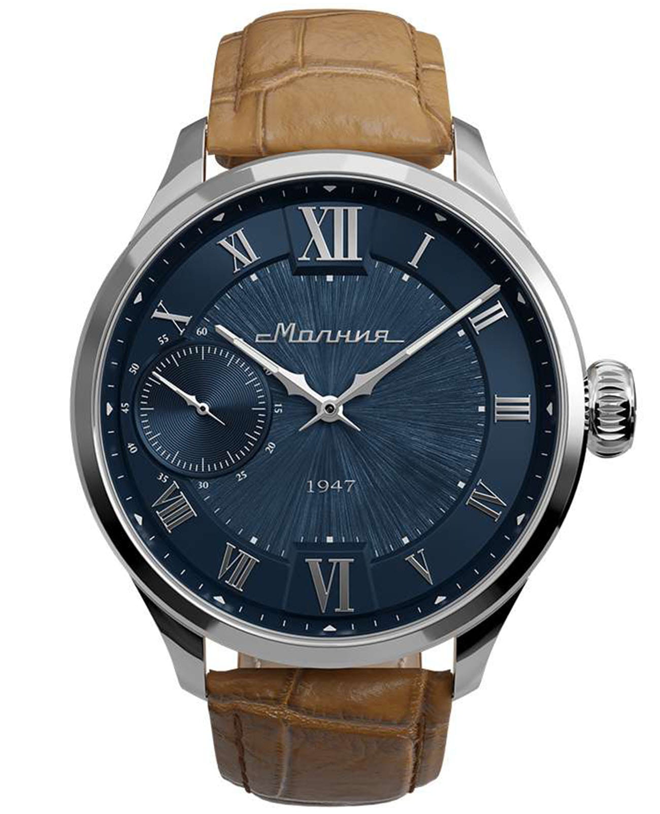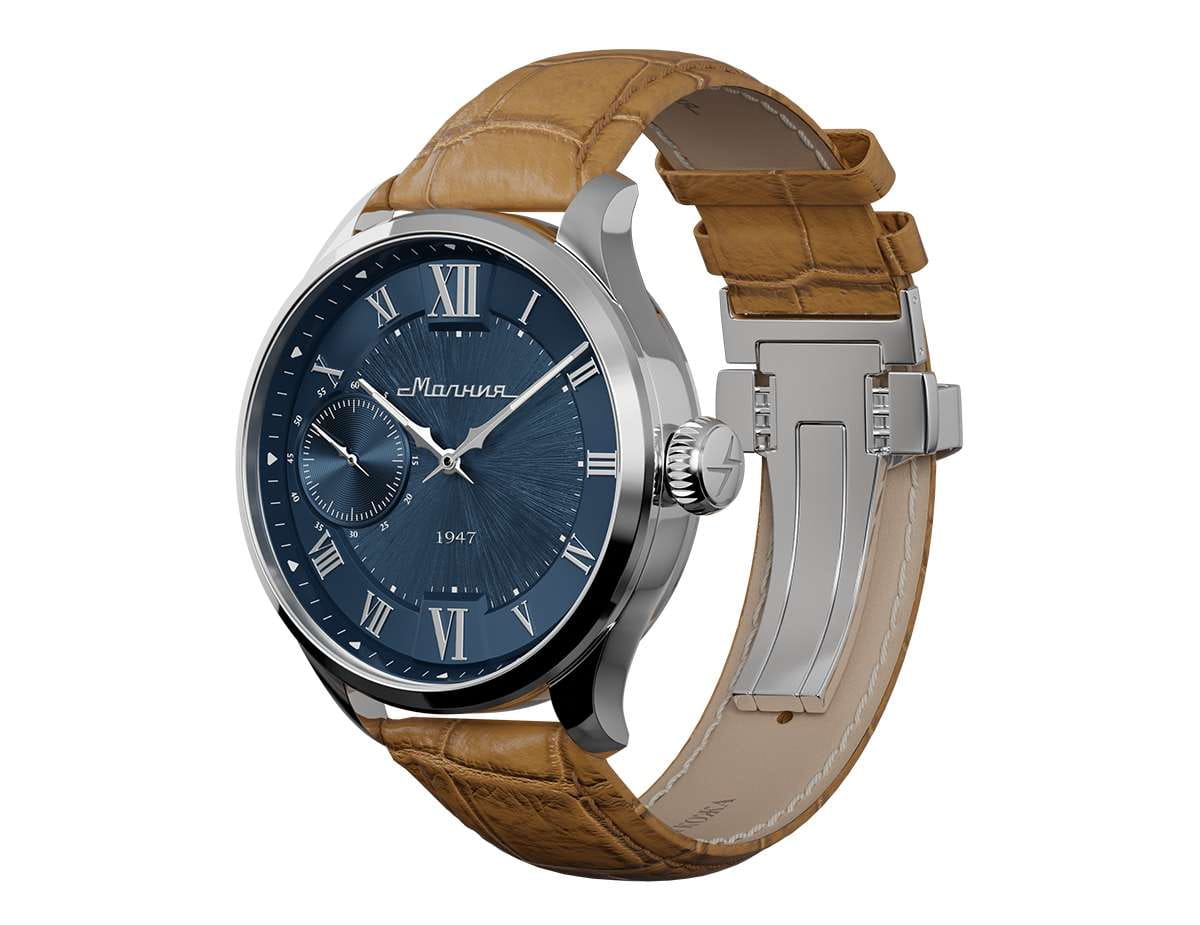 Мужские механические часы с ручным подзаводом — это аксессуар от легендарного бренда «МОЛНИЯ», созданный на Челябинском часовом заводе. Корпус диаметром 41 мм и толщиной 12 мм выполнен из нержавеющей стали 316L с зеркальной полировкой. БезельБезельВнешний ободок, закрепляющий стекло. В спортивных часах так называется поворотное кольцо с делениями на циферблате, выполняет роль таймера – замеряет отрезки времени на шкале. Неподвижный безель – элемент декора. Однонаправленно вращающийся безель на дайверских часах позволяет фиксировать моменты погружения и выныривания на поверхность. также выполнен из стали с зеркальной отделкой. Циферблат синего цвета оформлен римскими цифрами и стальными индексами. Малая секундная стрелка вынесена на позицию 9 часов. Циферблат защищён сапфировым стекломСапфировое стеклоПрочный и надёжный материал из кристалла сапфира синтетического происхождения, характеризующийся особой твёрдостью и устойчивостью к царапинам и повреждениям. толщиной 2,5 мм. Механизм — мануфактурный калибр 3603, собранный вручную, с запасом хода до 40 часов. Прозрачная задняя крышка позволяет наблюдать за работой механизма. Часы оснащены светло-коричневым кожаным ремешком шириной 20 мм с раскладной застёжкойРаскладная застёжкаТакой тип застёжки используется только на браслетах из металла. Она никогда не раскрывается полностью, происходит разделение на 2 и более частей. Раскладывающая застёжка снизит вероятность потери часов к минимуму. и системой быстрой замены. Водонепроницаемость 100 м позволяет использовать часы для плавания и повседневного ношения. Идеальный выбор для тех, кто ценит российское качество и традиции.
