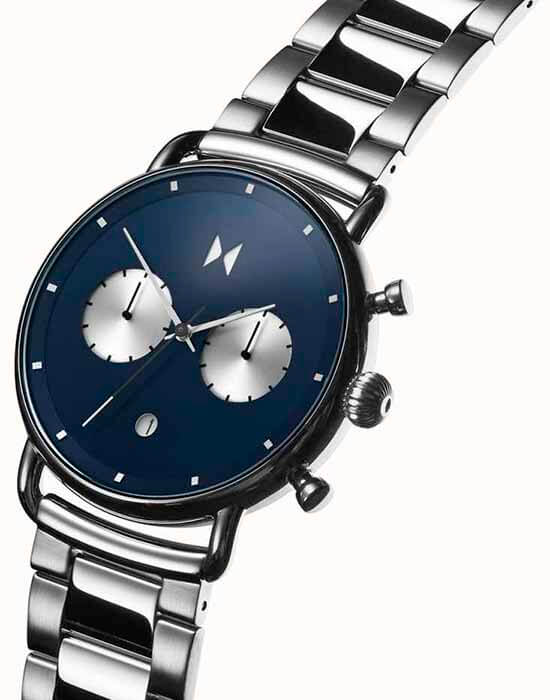 Мужские кварцевые часы-хронографХронографФункция позволяет измерять отрезки времени с особой точностью: часы, минуты, секунды. Верным признаком хронографа является наличие на циферблате 3 дополнительных окошек-счётчиков. с секундомеромСекундомерСекундоме́р — прибор, способный измерять интервалы времени с точностью до долей секунды. MVMT D-BT01-BLUS – лаконичная красота и изысканная элегантность. Оригинальная модель с классическим оформлением станет превосходным завершением образа, наделив его индивидуальным характером. Корпус выполнен из нержавеющей стали серебристого цвета, диаметром 47 мм и толщиной 13,5 мм, что обеспечивает долговечность и надежность. Закаленное минеральное стеклоМинеральное стеклоМинеральное стекло представляет собой искусственно выращенный минерал кварца. Такое стекло отличается особой устойчивостью к повреждениям и царапинам. Уступает по некоторым качествам сапфировому стеклу. защищает циферблат от царапин. Стальной браслет на раскладной застёжке с фиксаторомРаскладная застёжкаТакой тип застёжки используется только на браслетах из металла. Она никогда не раскрывается полностью, происходит разделение на 2 и более частей. Раскладывающая застёжка снизит вероятность потери часов к минимуму. обеспечивает комфортное ношение. Водозащита 100 метров позволит плавать, нырять и заниматься другими водными видами спорта. Рифленая заводная головка с защитой. Это аксессуар для мужчины, который ценит классический стиль и функциональность.