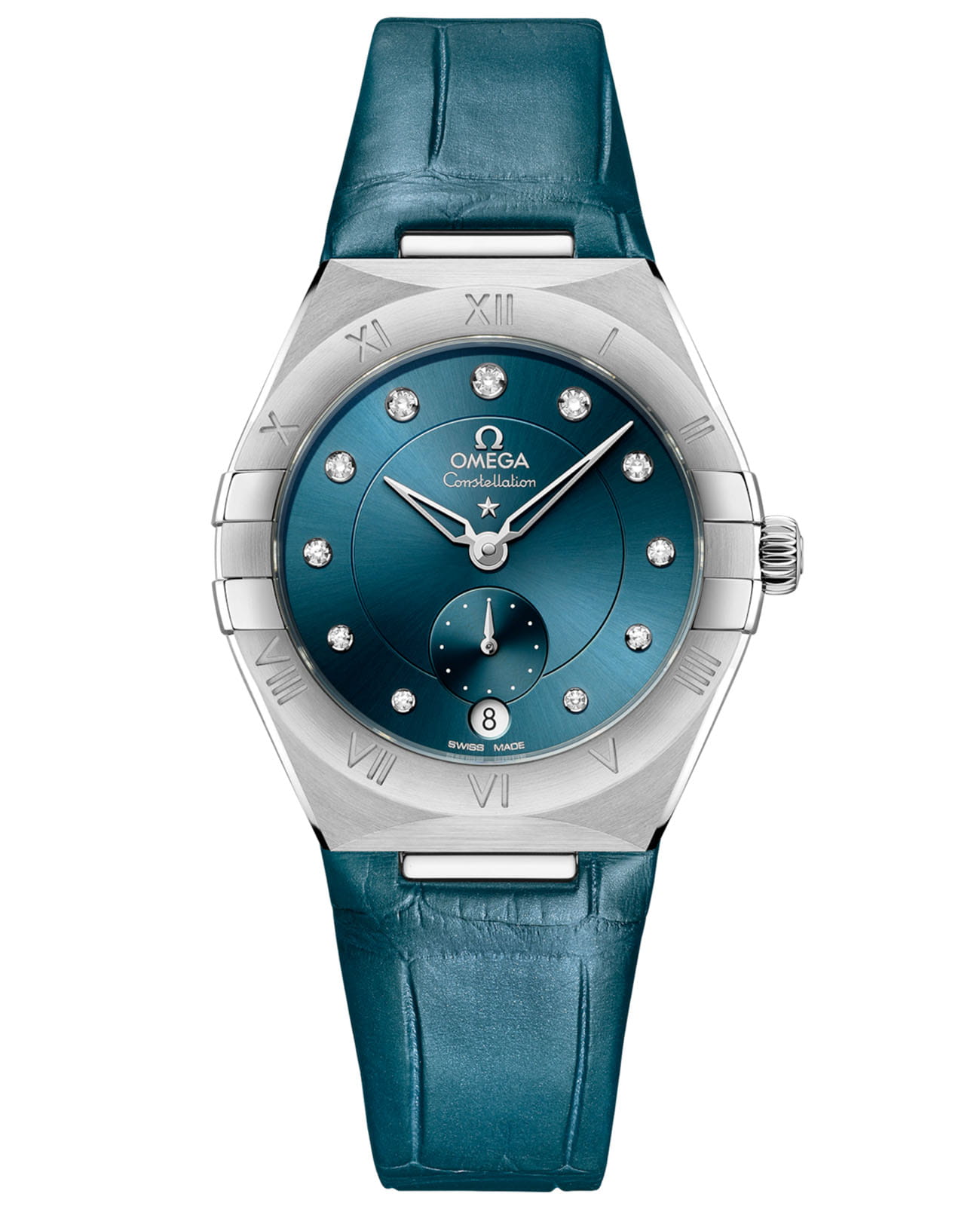 Драматичный и яркий дизайн часов OMEGA Constellation характеризуется знаменитыми гранями полумесяца, а также «когтями» на боковых сторонах корпуса. Эта 34-миллиметровая модель из нержавеющей стали оснащена безелемБезельВнешний ободок, закрепляющий стекло. В спортивных часах так называется поворотное кольцо с делениями на циферблате, выполняет роль таймера – замеряет отрезки времени на шкале. Неподвижный безель – элемент декора. Однонаправленно вращающийся безель на дайверских часах позволяет фиксировать моменты погружения и выныривания на поверхность. с выгравированными римскими цифрами, циферблатом павлиньего синего цвета с солнечной отделкой и круглым окошком даты в положении «6 часов». Инкрементные бриллиантовые часовые индексы представлены в держателях из белого золота 18 карат18-каратное золотоОбозначение по каратной системе пробирования, оно показывает, сколько драгоценного металла содержится в изделии. 18 карат - в составе 75% чистого золота, соответствует 750 пробе.