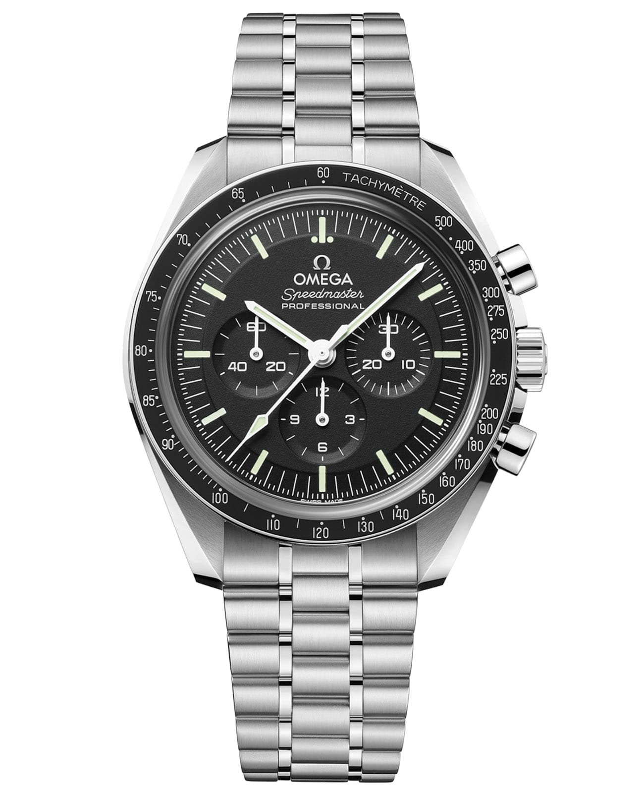Speedmaster Moonwatch – культовые часы, заслужившие мировое признание. Шесть миссий на Луну сделали их символом новаторского духа OMEGA. Moonwatch представлены с пятизвенным браслетом с матовой отделкой и 42-миллиметровым корпусом из нержавеющей стали Сапфировое стеклоСапфировое стеклоПрочный и надёжный материал из кристалла сапфира синтетического происхождения, характеризующийся особой твёрдостью и устойчивостью к царапинам и повреждениям. установлено с лицевой и задней стороны корпуса. Дизайн повторяет черты Speedmaster 4-го поколения - первых часов на Луне. Асимметричный корпус сочетается с черным многоуровневым циферблатом и характерной точкой у отметки 90 на безелеБезельВнешний ободок, закрепляющий стекло. В спортивных часах так называется поворотное кольцо с делениями на циферблате, выполняет роль таймера – замеряет отрезки времени на шкале. Неподвижный безель – элемент декора. Однонаправленно вращающийся безель на дайверских часах позволяет фиксировать моменты погружения и выныривания на поверхность. из анодированного алюминия. В основе - механизм OMEGA Co-Axial Master Chronometer 3861, управляющий счетчиком малой секундной стрелки, 30-минутным и 12-часовым счетчиками, а также центральной хронографнойХронографФункция позволяет измерять отрезки времени с особой точностью: часы, минуты, секунды. Верным признаком хронографа является наличие на циферблате 3 дополнительных окошек-счётчиков. стрелкой.