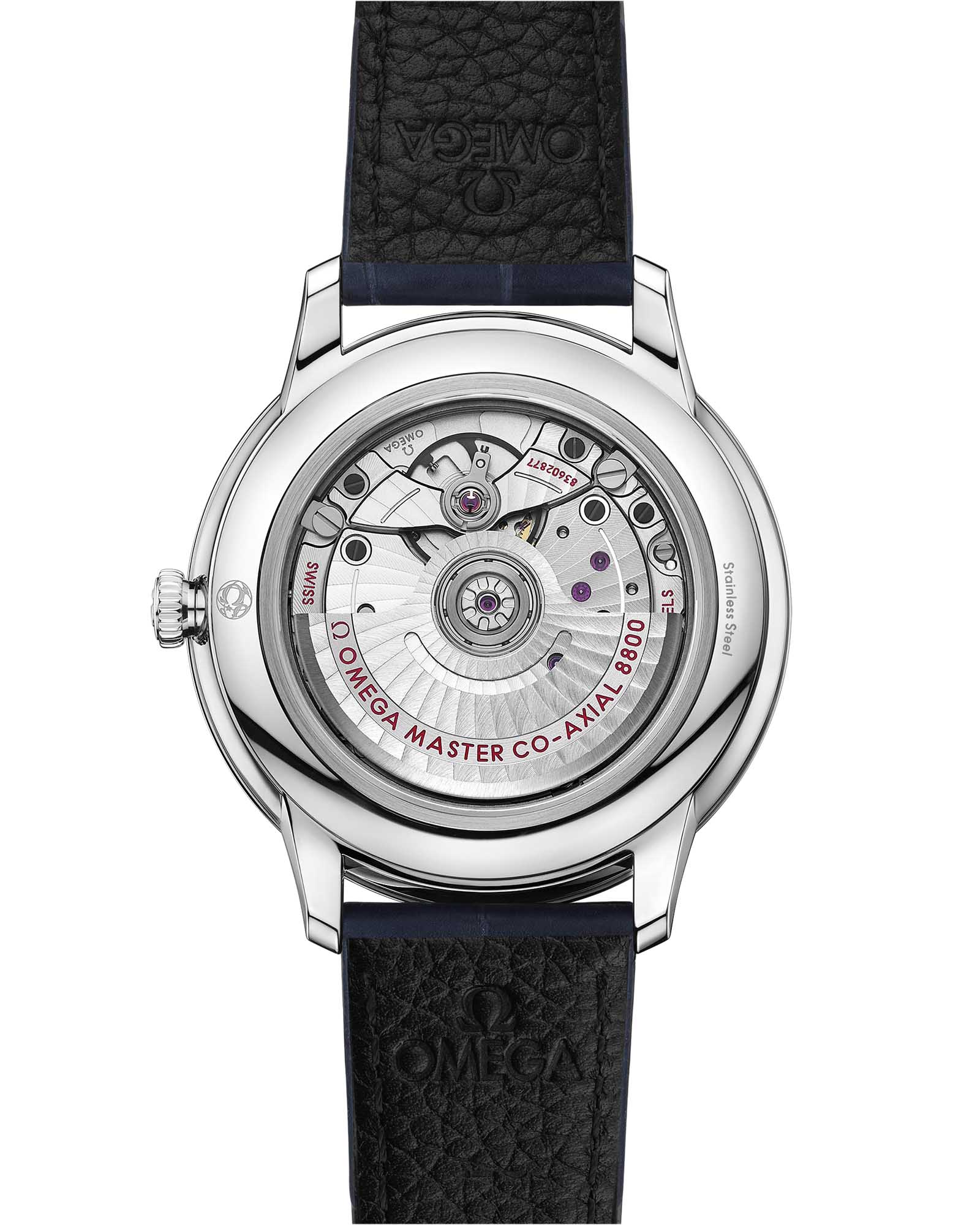 Коллекция OMEGA De Ville Prestige, не теряющая актуальности с 1994 года, предстает в третьем поколении. Часы остаются символом классического дизайна и изысканной элегантности. Модели, привлекающие внимание широкой гаммой узоров, отделок и цветов, идеально подойдут для людей с разным образом жизни и характером. Часы в корпусе диаметром 40 мм из нержавеющей стали имеют выпуклый циферблат с PVD-покрытиемPVDУльтратонкое покрытие наносится в технике вакуумного напыления, сочетает в себе нитрид титана особой прочности со слоем золота или оксида хрома. Несёт в себе декоративную или защитную функцию. темно-синего цвета, украшенный рельефным произвольным вертикальным узором с радиальным сатинированием. На циферблате расположены стрелки с родиевым покрытием, а также чередующиеся римские цифры и индексы в форме кабошона. Изделие с лаконичным дизайном дополнено окошком даты в положении «6 часов» и минутной шкалой в стиле «железная дорога» на внешнем секторе. Часы с сертификатом Master Chronometer представлены с кожаным ремешком темно-синего цвета. Модель оснащена калибром OMEGA Master Co-Axial 8800, который виден сквозь устойчивое к царапинам сапфировое стеклоСапфировое стеклоПрочный и надёжный материал из кристалла сапфира синтетического происхождения, характеризующийся особой твёрдостью и устойчивостью к царапинам и повреждениям. задней крышки корпуса.