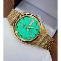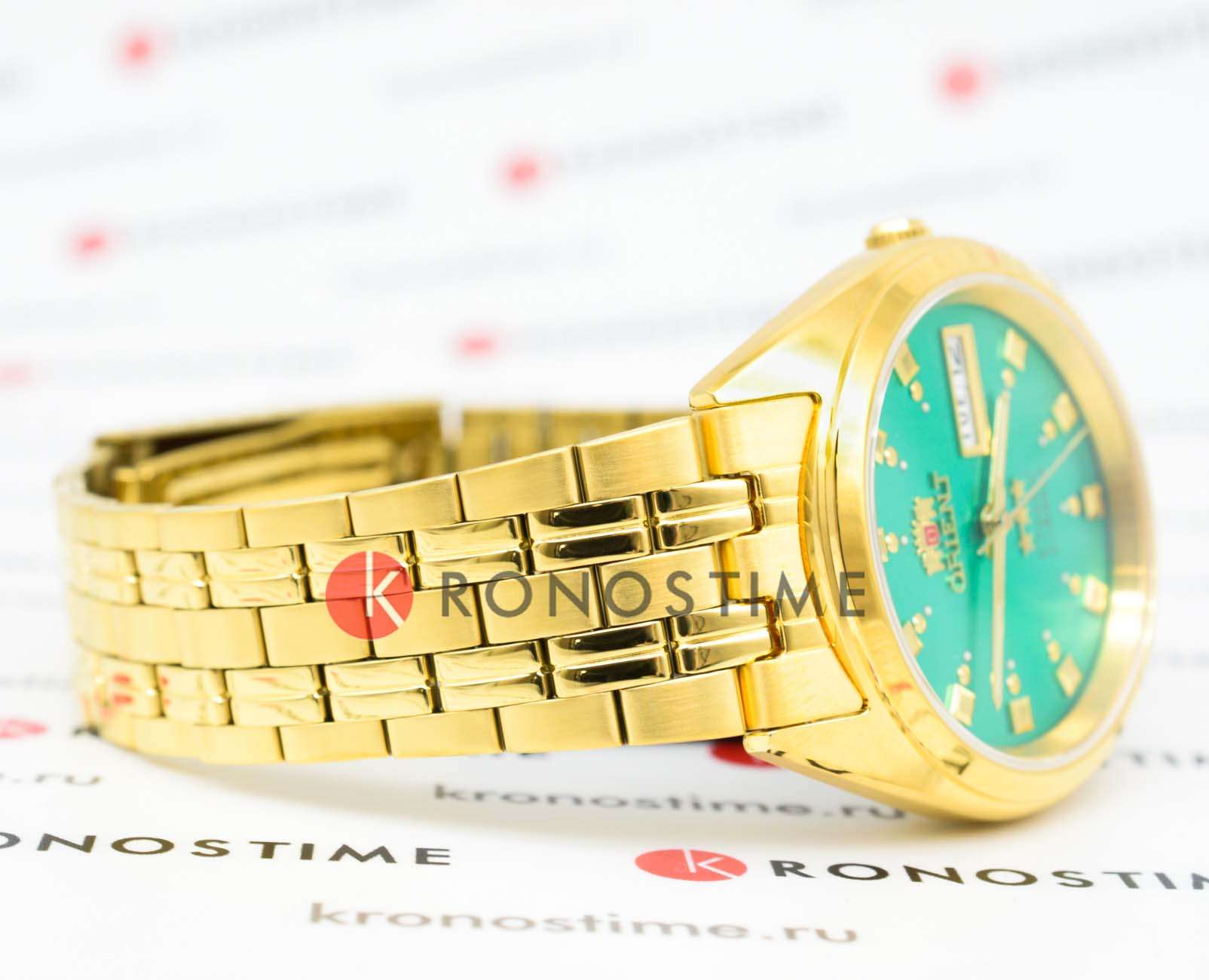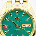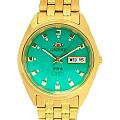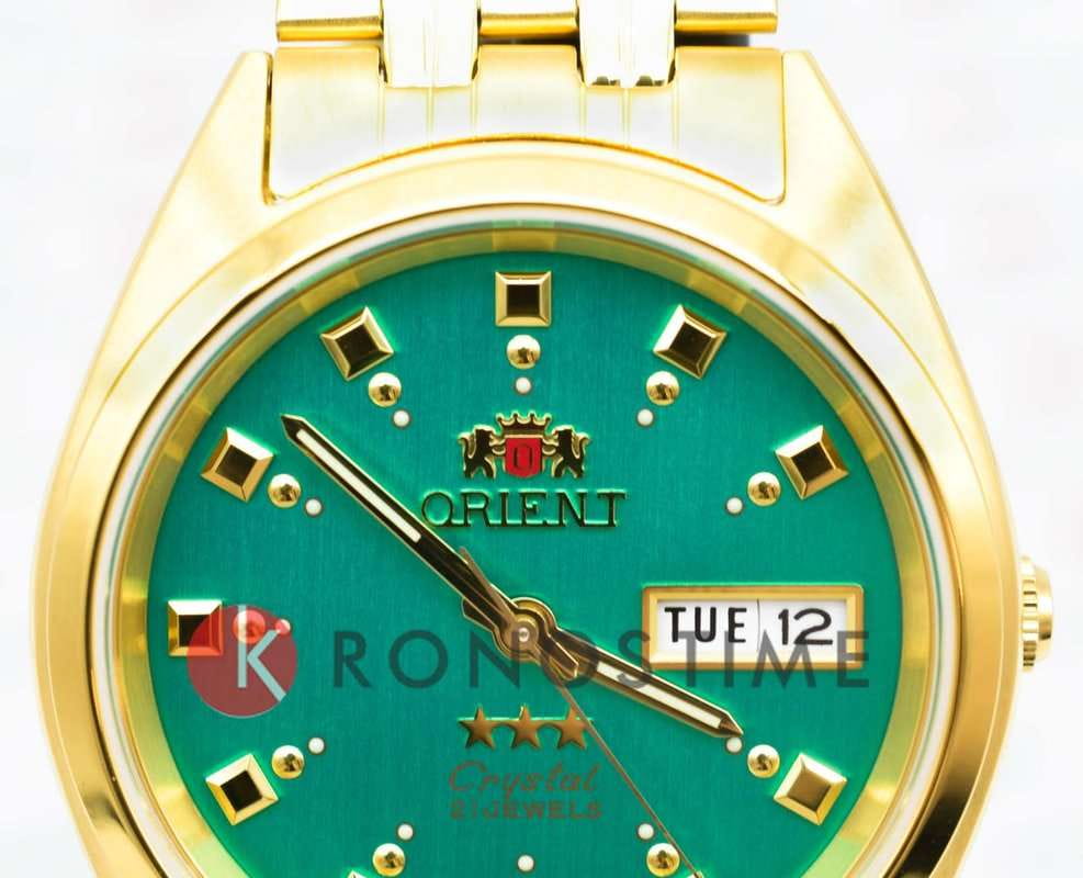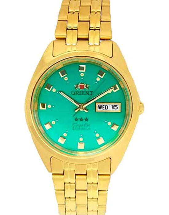 Модель Orient AB00001N из серии Three Stars — это классические японские автоматические часы, сочетающие надёжность и винтажную эстетику.  Корпус диаметром 37 мм и браслет выполнены из нержавеющей стали с полированным золотистым покрытием.  Зелёный циферблат с солнечной шлифовкой дополнен стрелками и метками, покрытыми люминесцентным покрытиемЛюминесцентное покрытиеПозволяет считывать показания времени в темноте. Производители наносят на стрелки, часовые индексы, безель или поверхность циферблата светонакопительный состав, дающий холодное свечение., обеспечивая отличную читаемость в любых условиях.