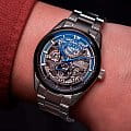 Отличительной особенностью данной модели является скелетонизированный циферблат, который открывает взгляду изящный внутренний механизм. БезельБезельВнешний ободок, закрепляющий стекло. В спортивных часах так называется поворотное кольцо с делениями на циферблате, выполняет роль таймера – замеряет отрезки времени на шкале. Неподвижный безель – элемент декора. Однонаправленно вращающийся безель на дайверских часах позволяет фиксировать моменты погружения и выныривания на поверхность. часов имеет PVD-покрытиеPVDУльтратонкое покрытие наносится в технике вакуумного напыления, сочетает в себе нитрид титана особой прочности со слоем золота или оксида хрома. Несёт в себе декоративную или защитную функцию., что придаёт ему дополнительный шарм и повышает износостойкость. Внутри механизма содержится 22 камня, а частота колебаний составляет 21 600 полуколебаний в час. Часы оснащены ретроградным указателем запаса хода, который может достигать до 70 часов.