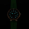, керамический безельБезельВнешний ободок, закрепляющий стекло. В спортивных часах так называется поворотное кольцо с делениями на циферблате, выполняет роль таймера – замеряет отрезки времени на шкале. Неподвижный безель – элемент декора. Однонаправленно вращающийся безель на дайверских часах позволяет фиксировать моменты погружения и выныривания на поверхность. с минутной шкалой. Сапфировое стеклоСапфировое стеклоПрочный и надёжный материал из кристалла сапфира синтетического происхождения, характеризующийся особой твёрдостью и устойчивостью к царапинам и повреждениям., выпуклое с обеих сторон, внутреннее антибликовое покрытие. Прозрачная задняя крышка из сапфирового стеклаСапфировое стеклоПрочный и надёжный материал из кристалла сапфира синтетического происхождения, характеризующийся особой твёрдостью и устойчивостью к царапинам и повреждениям.. Стрелки и метки с люминесцентным покрытиемЛюминесцентное покрытиеПозволяет считывать показания времени в темноте. Производители наносят на стрелки, часовые индексы, безель или поверхность циферблата светонакопительный состав, дающий холодное свечение.. Завинчивающаяся заводная головка. Каучуковый ремень.
