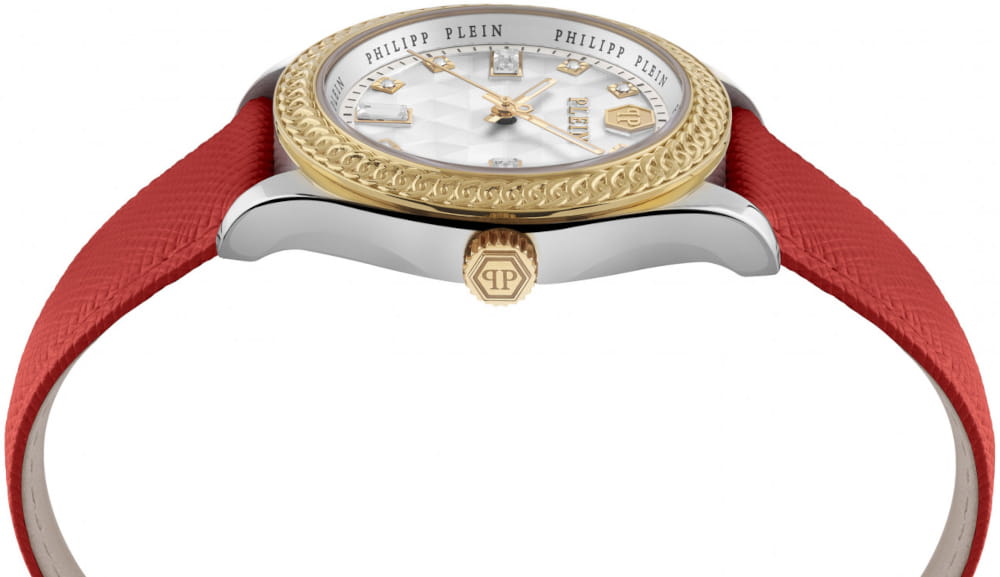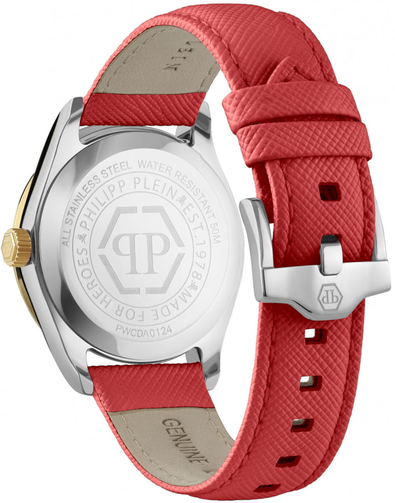 ​​Часы Philipp Plein PWCDA0124 из коллекции Queen сочетают элегантность и функциональность.​​ ​​Корпус диаметром 38 мм выполнен из нержавеющей стали с IP-покрытиеIP-покрытиеМетод ионного напыления. Демонстрирует повышенную устойчивость к истиранию, окислению и химическим веществам. Под воздействием высокого давления и температуры около 1500°C молекулы металла надёжно соединяются с частицами корпуса часов., придающим изделию роскошный вид.​​ ​​Циферблат украшен фирменным логотипом бренда в виде черепа на отметке 12 часов.​​ ​​