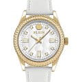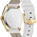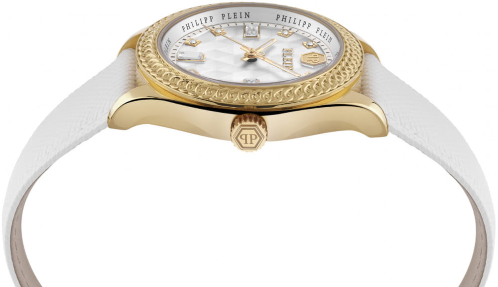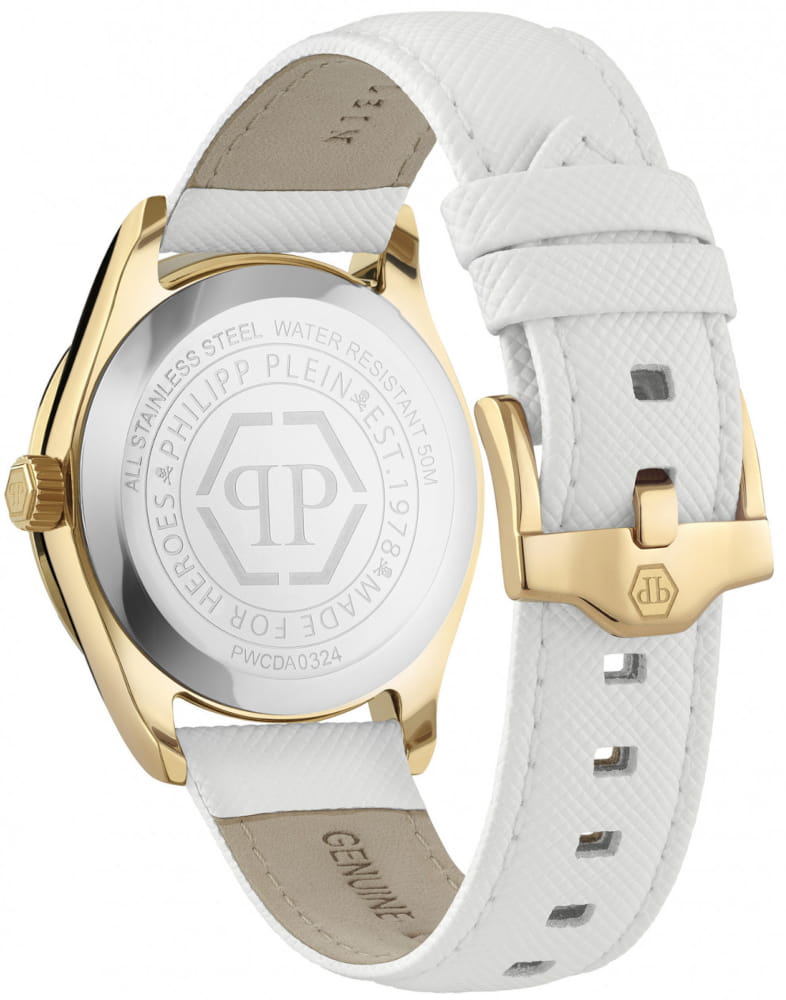 ​​Часы Philipp Plein PWCDA0324 из коллекции Queen сочетают элегантность и функциональность.​​ ​​Корпус диаметром 38 мм выполнен из нержавеющей стали с IP-покрытиеIP-покрытиеМетод ионного напыления. Демонстрирует повышенную устойчивость к истиранию, окислению и химическим веществам. Под воздействием высокого давления и температуры около 1500°C молекулы металла надёжно соединяются с частицами корпуса часов., придающим изделию роскошный вид.​​ ​​Циферблат украшен фирменным логотипом бренда в виде черепа на отметке 12 часов.​​ ​​