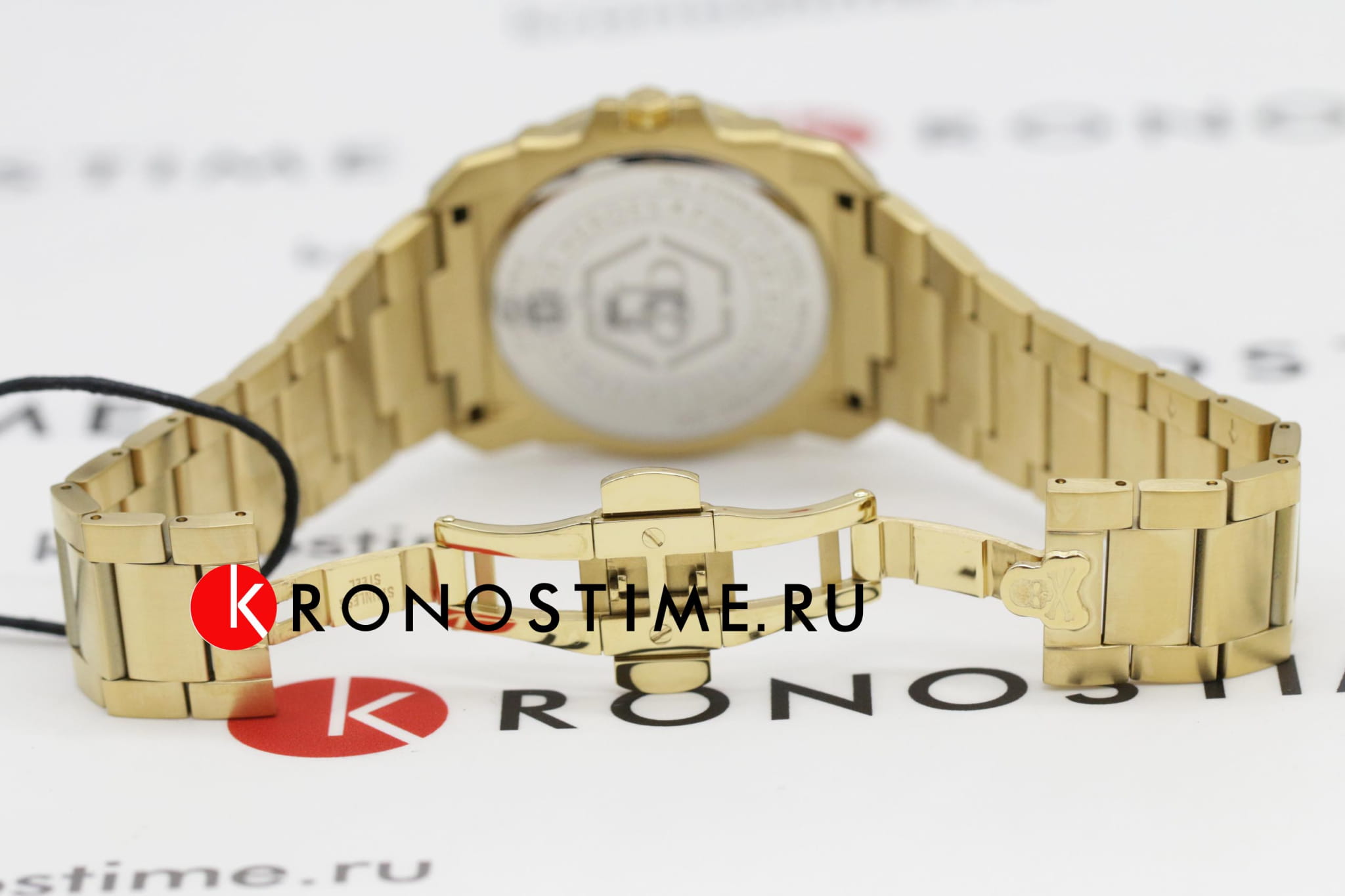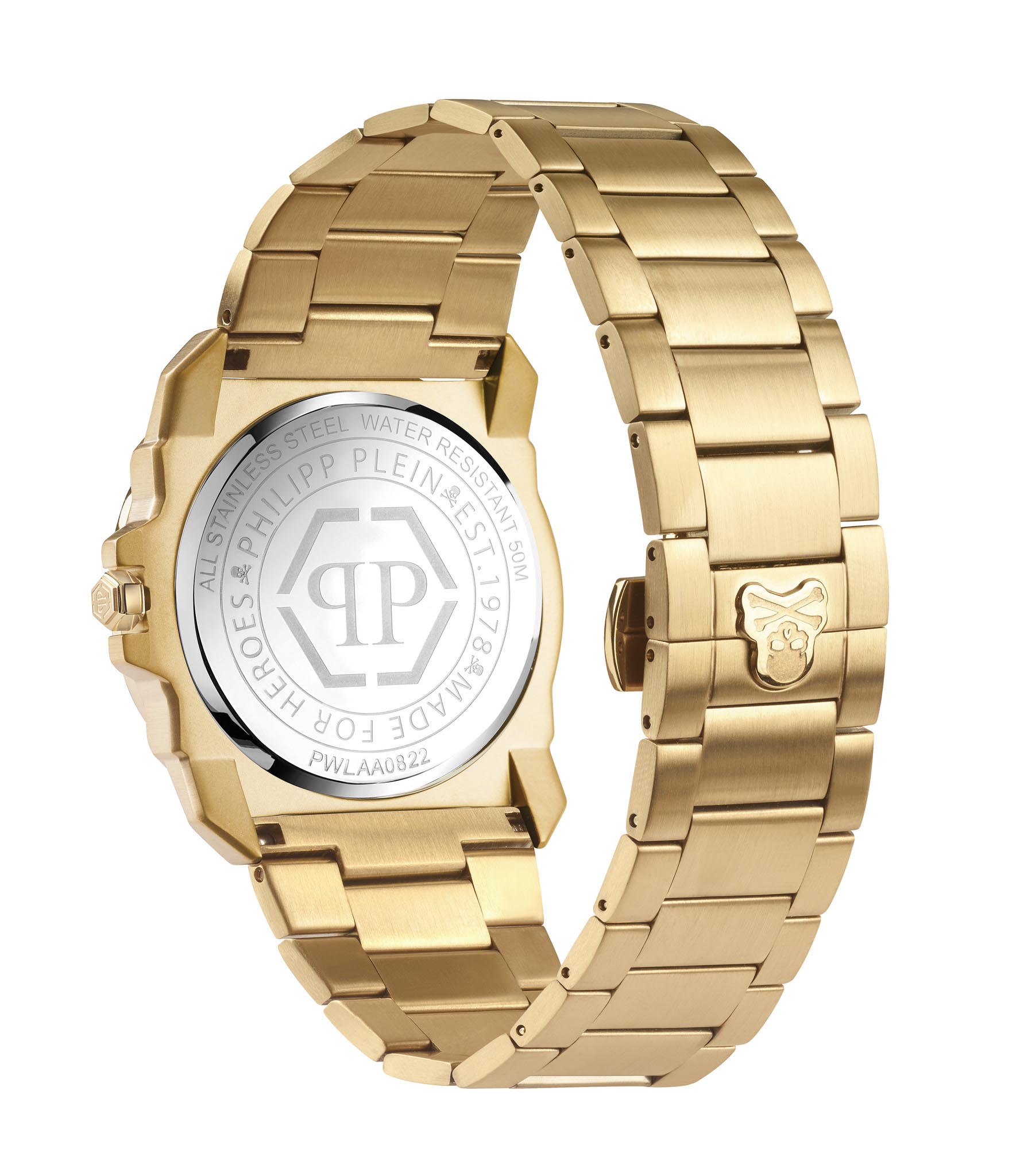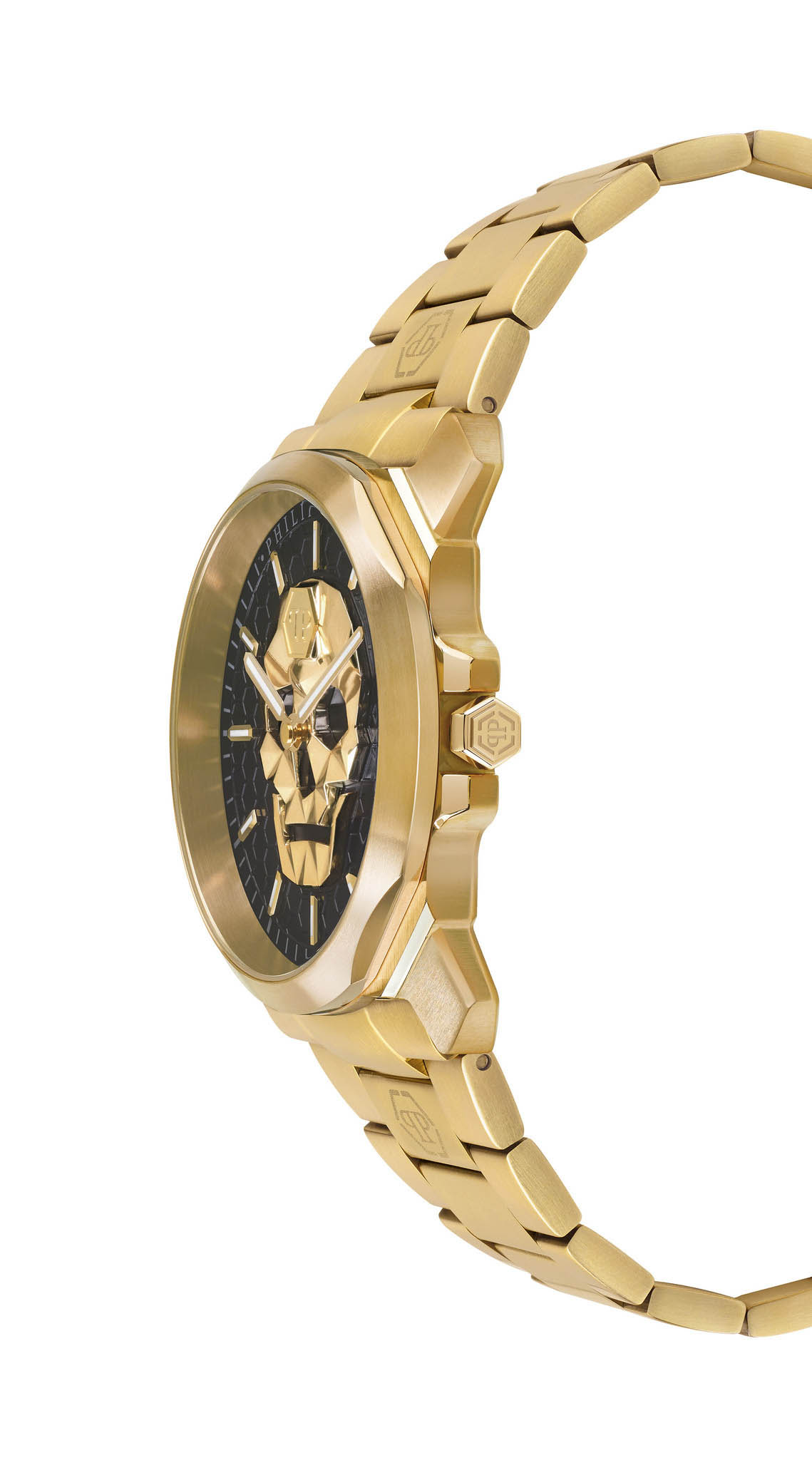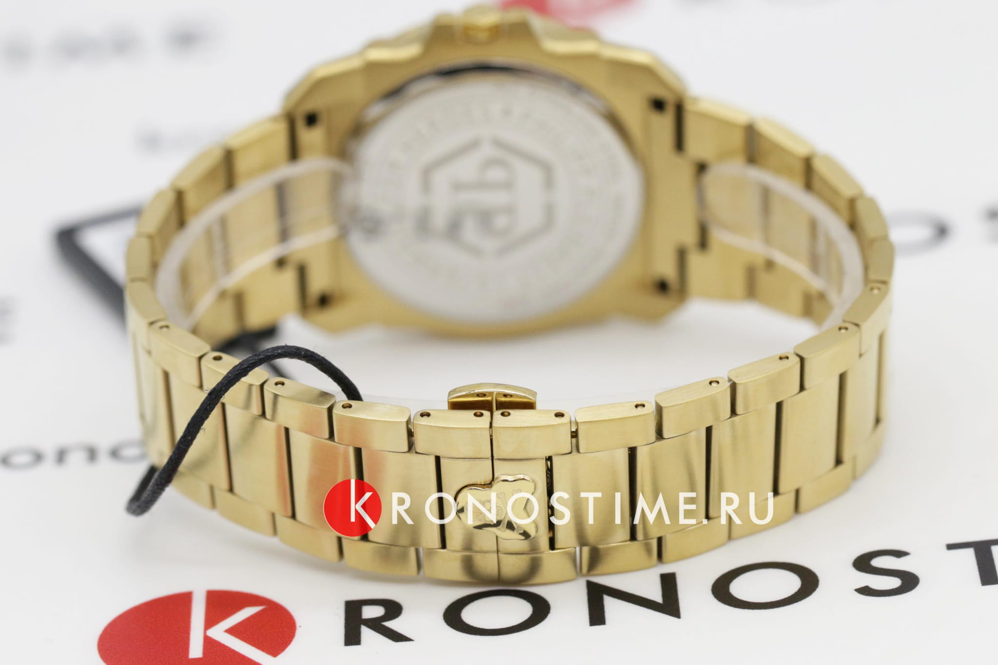 Мужские кварцевые часы с фирменным изображением черепа Philipp Plein The Skull King PWLAA0822, кварцевый механизм с высокой точностью. Класс водозащиты: 50 метров, позволит защитить корпус от случайных брызг или капель дождя. Корпус и браслет часов изготовлены из стали с IP-покрытиемIP-покрытиеМетод ионного напыления. Демонстрирует повышенную устойчивость к истиранию, окислению и химическим веществам. Под воздействием высокого давления и температуры около 1500°C молекулы металла надёжно соединяются с частицами корпуса часов. цвета желтое золото. Прочное минеральное стеклоМинеральное стеклоМинеральное стекло представляет собой искусственно выращенный минерал кварца. Такое стекло отличается особой устойчивостью к повреждениям и царапинам. Уступает по некоторым качествам сапфировому стеклу. устойчивое к мелким механическим повреждениям. Браслет дополняет застёжка-бабочка с кнопкамиЗастёжка "бабочка"Такой вид застёжки дополняется предохранителями, помогающими избежать случайного раскрытия браслета. Обладают изящным исполнением. .