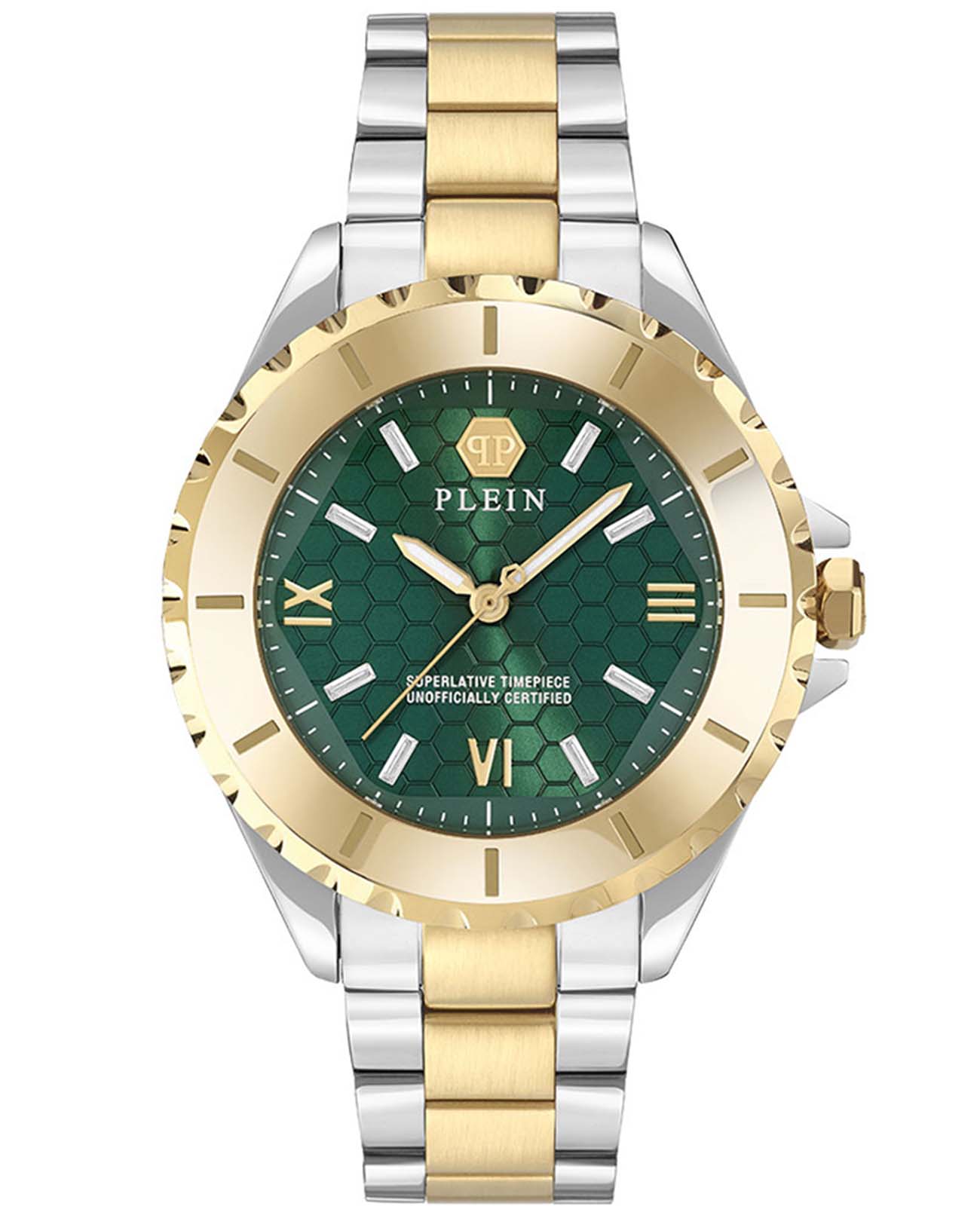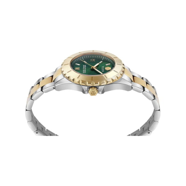 ​​Часы Philipp Plein  PWPOA0724 из коллекции Heaven сочетают элегантность и функциональность.​​ ​​Корпус диаметром 38 мм выполнен из нержавеющей стали, придающим изделию роскошный вид.​​ ​​Зеленый циферблат украшен фирменным логотипом бренда. ​​Часы оснащены кварцевым механизмом, обеспечивающим точность хода.​​ ​​Минеральное стеклоМинеральное стеклоМинеральное стекло представляет собой искусственно выращенный минерал кварца. Такое стекло отличается особой устойчивостью к повреждениям и царапинам. Уступает по некоторым качествам сапфировому стеклу. защищает циферблат от повреждений, а люминесцентное покрытиеЛюминесцентное покрытиеПозволяет считывать показания времени в темноте. Производители наносят на стрелки, часовые индексы, безель или поверхность циферблата светонакопительный состав, дающий холодное свечение. на стрелках обеспечивают удобное считывание времени в условиях недостаточной освещённости.​​ ​​Водозащита 50WR позволяет использовать часы в повседневной жизни, включая случайные контакты с водой.​​ ​​Стальной браслет на застёжке-бабочке с кнопкамиЗастёжка "бабочка"Такой вид застёжки дополняется предохранителями, помогающими избежать случайного раскрытия браслета. Обладают изящным исполнением. с частичным IP-покрытиемIP-покрытиеМетод ионного напыления. Демонстрирует повышенную устойчивость к истиранию, окислению и химическим веществам. Под воздействием высокого давления и температуры около 1500°C молекулы металла надёжно соединяются с частицами корпуса часов..​​ ​​Эти часы идеально подойдут для тех, кто ценит стиль и функциональность в одном аксессуаре.​​​​ БезельБезельВнешний ободок, закрепляющий стекло. В спортивных часах так называется поворотное кольцо с делениями на циферблате, выполняет роль таймера – замеряет отрезки времени на шкале. Неподвижный безель – элемент декора. Однонаправленно вращающийся безель на дайверских часах позволяет фиксировать моменты погружения и выныривания на поверхность. с IP-покрытиемIP-покрытиеМетод ионного напыления. Демонстрирует повышенную устойчивость к истиранию, окислению и химическим веществам. Под воздействием высокого давления и температуры около 1500°C молекулы металла надёжно соединяются с частицами корпуса часов..