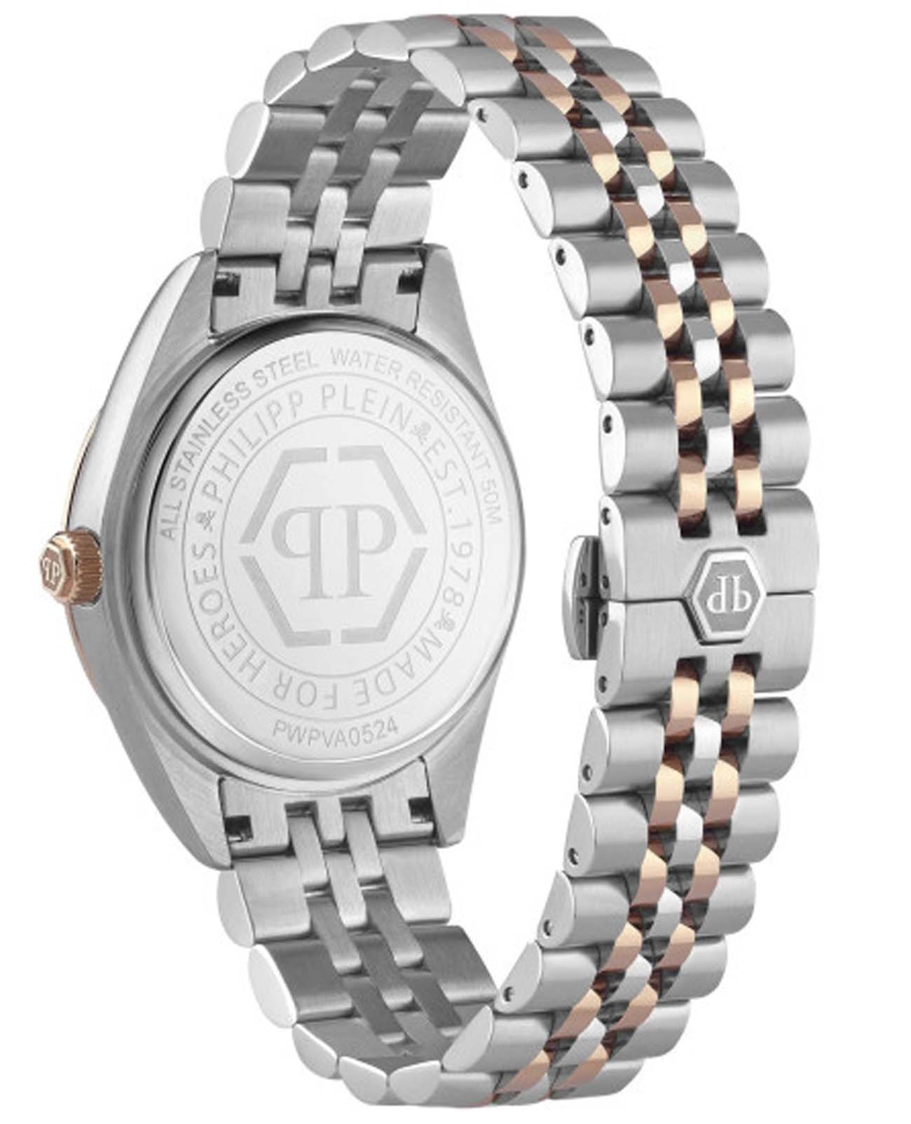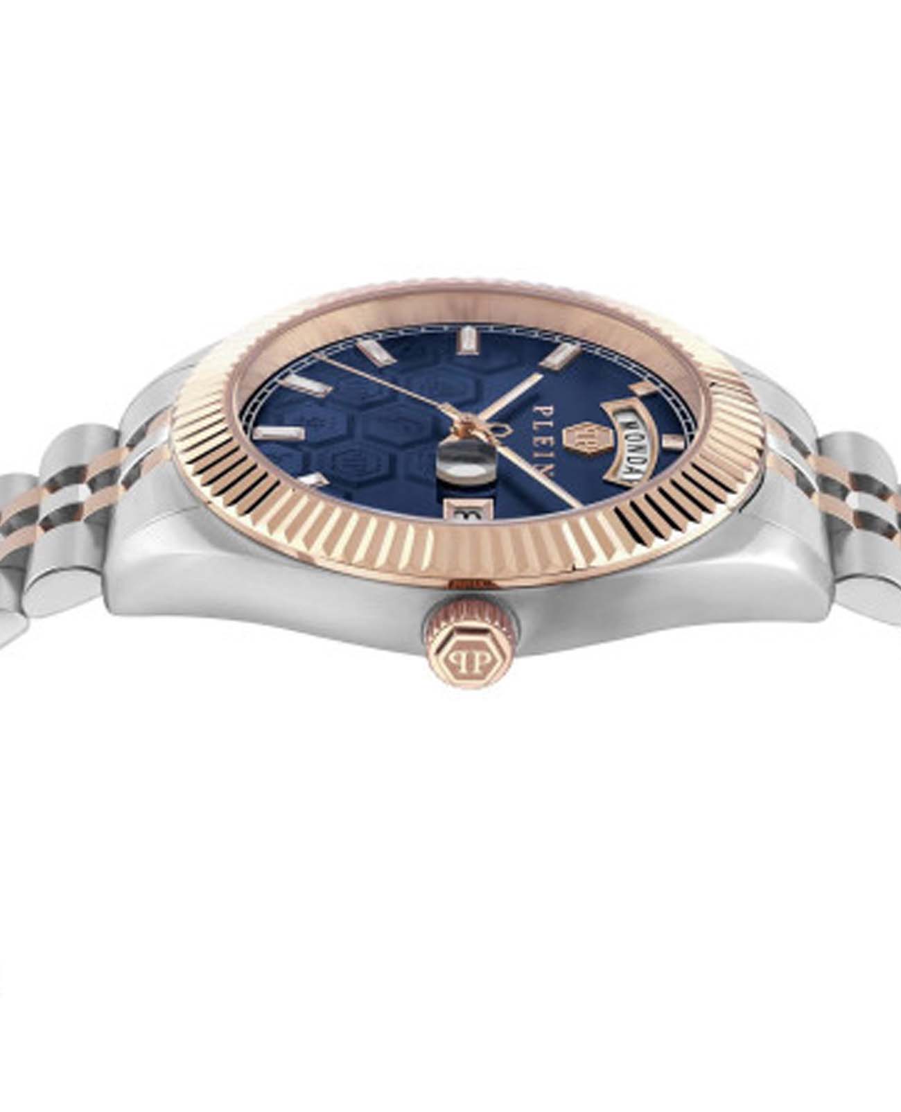 Мужские кварцевые часы Philipp Plein Date Superlative Gent PWPVA0524, кварцевый механизм с высокой точностью. Метки в виде штрихов. Минеральное стеклоМинеральное стеклоМинеральное стекло представляет собой искусственно выращенный минерал кварца. Такое стекло отличается особой устойчивостью к повреждениям и царапинам. Уступает по некоторым качествам сапфировому стеклу. устойчивое к мелким механическим повреждениям. Фирменная дизайнерская упаковка. БезельБезельВнешний ободок, закрепляющий стекло. В спортивных часах так называется поворотное кольцо с делениями на циферблате, выполняет роль таймера – замеряет отрезки времени на шкале. Неподвижный безель – элемент декора. Однонаправленно вращающийся безель на дайверских часах позволяет фиксировать моменты погружения и выныривания на поверхность. с IP-покрытиемIP-покрытиеМетод ионного напыления. Демонстрирует повышенную устойчивость к истиранию, окислению и химическим веществам. Под воздействием высокого давления и температуры около 1500°C молекулы металла надёжно соединяются с частицами корпуса часов.. Стрелки и метки с люминесцентным покрытиемЛюминесцентное покрытиеПозволяет считывать показания времени в темноте. Производители наносят на стрелки, часовые индексы, безель или поверхность циферблата светонакопительный состав, дающий холодное свечение.. Стальной браслет с частичным IP-покрытиемIP-покрытиеМетод ионного напыления. Демонстрирует повышенную устойчивость к истиранию, окислению и химическим веществам. Под воздействием высокого давления и температуры около 1500°C молекулы металла надёжно соединяются с частицами корпуса часов. на раскладной застёжкеРаскладная застёжкаТакой тип застёжки используется только на браслетах из металла. Она никогда не раскрывается полностью, происходит разделение на 2 и более частей. Раскладывающая застёжка снизит вероятность потери часов к минимуму.. Окошко дня недели находится в положении 12 часов.