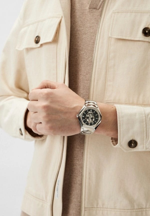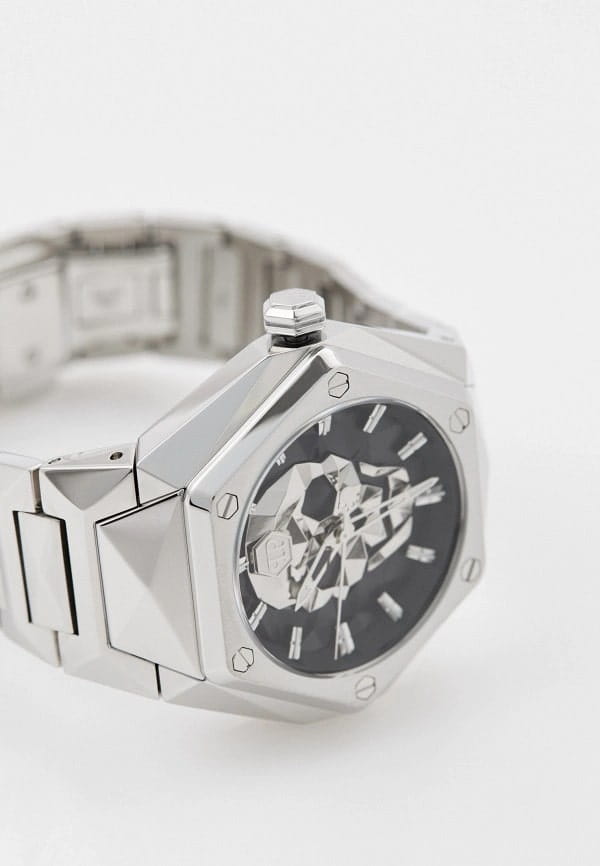 Philipp Plein The $kull Spikes PWPWA0624 — мужские кварцевые часы, сочетающие смелый дизайн и функциональность. Корпус диаметром 45 мм выполнен из нержавеющей стали что обеспечивает стильный внешний вид и долговечность. Минеральное стеклоМинеральное стеклоМинеральное стекло представляет собой искусственно выращенный минерал кварца. Такое стекло отличается особой устойчивостью к повреждениям и царапинам. Уступает по некоторым качествам сапфировому стеклу. защищает циферблат от царапин и повреждений. Чёрный циферблат с изображением черепа подчёркивает дерзкий дух бренда. Чёткие стрелки и индексы обеспечивают удобство считывания времени. Часы оснащены кварцевым механизмом, гарантирующим точность хода. Браслет выполнен из серебристой нержавеющей стали, что обеспечивает комфортное прилегание к запястью на застёжке-бабочке с кнопкамиЗастёжка "бабочка"Такой вид застёжки дополняется предохранителями, помогающими избежать случайного раскрытия браслета. Обладают изящным исполнением. и гарантирует надёжную фиксацию. Водозащита до 5 ATM (50 метров) делает часы подходящими для повседневного использования. Philipp Plein The $kull Spikes PWPWA0624 — это стильный аксессуар для мужчин, которые ценят уникальный дизайн и качество.