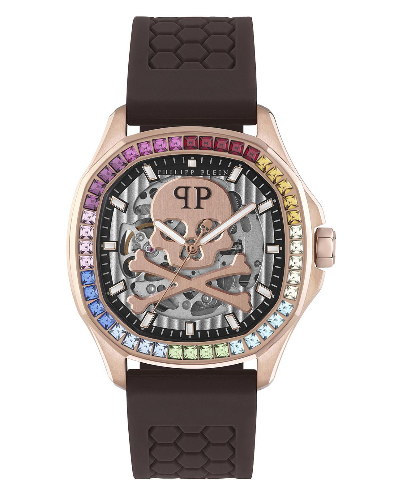 Яркие мужские часы с минеральным стекломМинеральное стеклоМинеральное стекло представляет собой искусственно выращенный минерал кварца. Такое стекло отличается особой устойчивостью к повреждениям и царапинам. Уступает по некоторым качествам сапфировому стеклу. Philipp Plein PWRAA0623, механический механизм. Класс водозащиты: 50 метров, позволит защитить корпус от случайных брызг или капель дождя. Корпус часов изготовлен из стали и украшен кристаллами. Стрелки и метки с люминесцентным покрытиемЛюминесцентное покрытиеПозволяет считывать показания времени в темноте. Производители наносят на стрелки, часовые индексы, безель или поверхность циферблата светонакопительный состав, дающий холодное свечение.. Скелетонизированные. Часы с механизмом, из которого удалён весь «лишний» металл, с прозрачными циферблатом и задней крышкой,