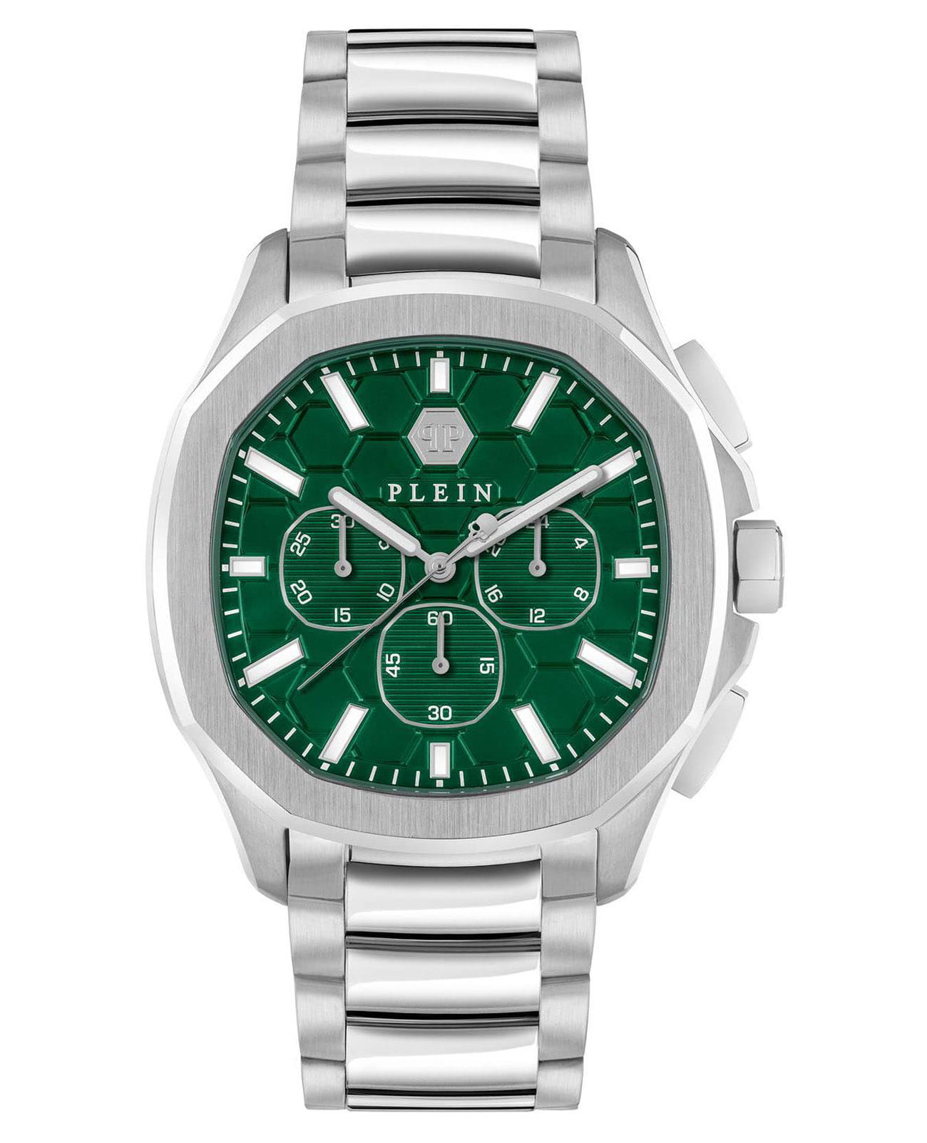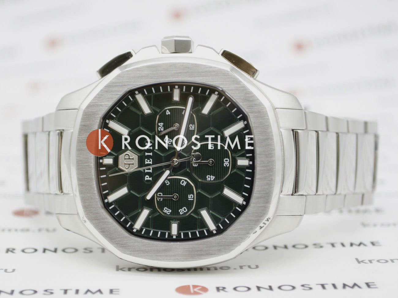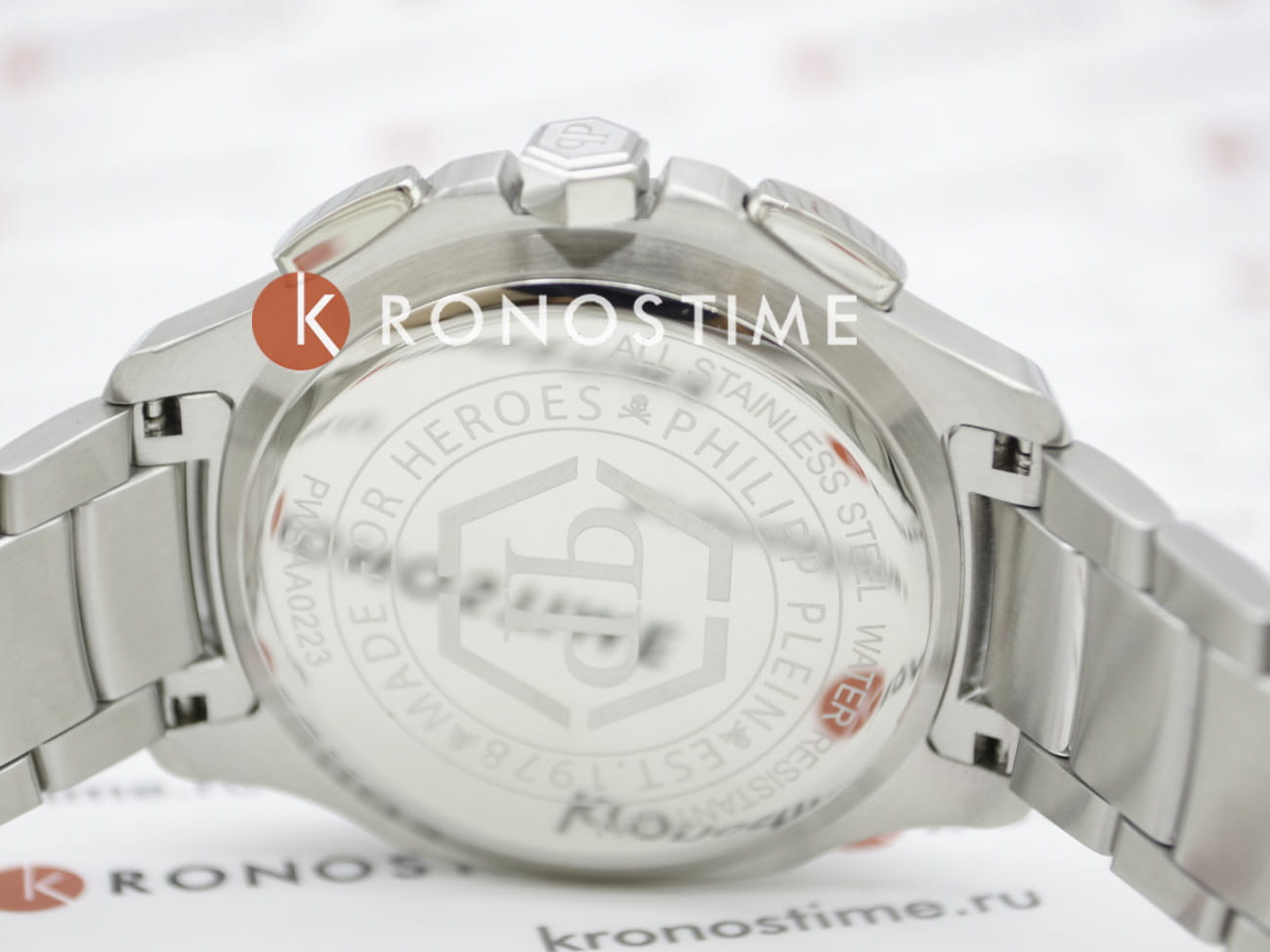Яркие мужские часы-хронографХронографФункция позволяет измерять отрезки времени с особой точностью: часы, минуты, секунды. Верным признаком хронографа является наличие на циферблате 3 дополнительных окошек-счётчиков. с секундомеромСекундомерСекундоме́р — прибор, способный измерять интервалы времени с точностью до долей секунды. Philipp Plein PWSAA0223, кварцевый механизм с высокой точностью. Класс водозащиты: 50 метров, позволит защитить корпус от случайных брызг или капель дождя. Корпус часов изготовлен из стали. Стрелки и метки с люминесцентным покрытиемЛюминесцентное покрытиеПозволяет считывать показания времени в темноте. Производители наносят на стрелки, часовые индексы, безель или поверхность циферблата светонакопительный состав, дающий холодное свечение.. Застёжка бабочка с кнопкамиЗастёжка "бабочка"Такой вид застёжки дополняется предохранителями, помогающими избежать случайного раскрытия браслета. Обладают изящным исполнением.