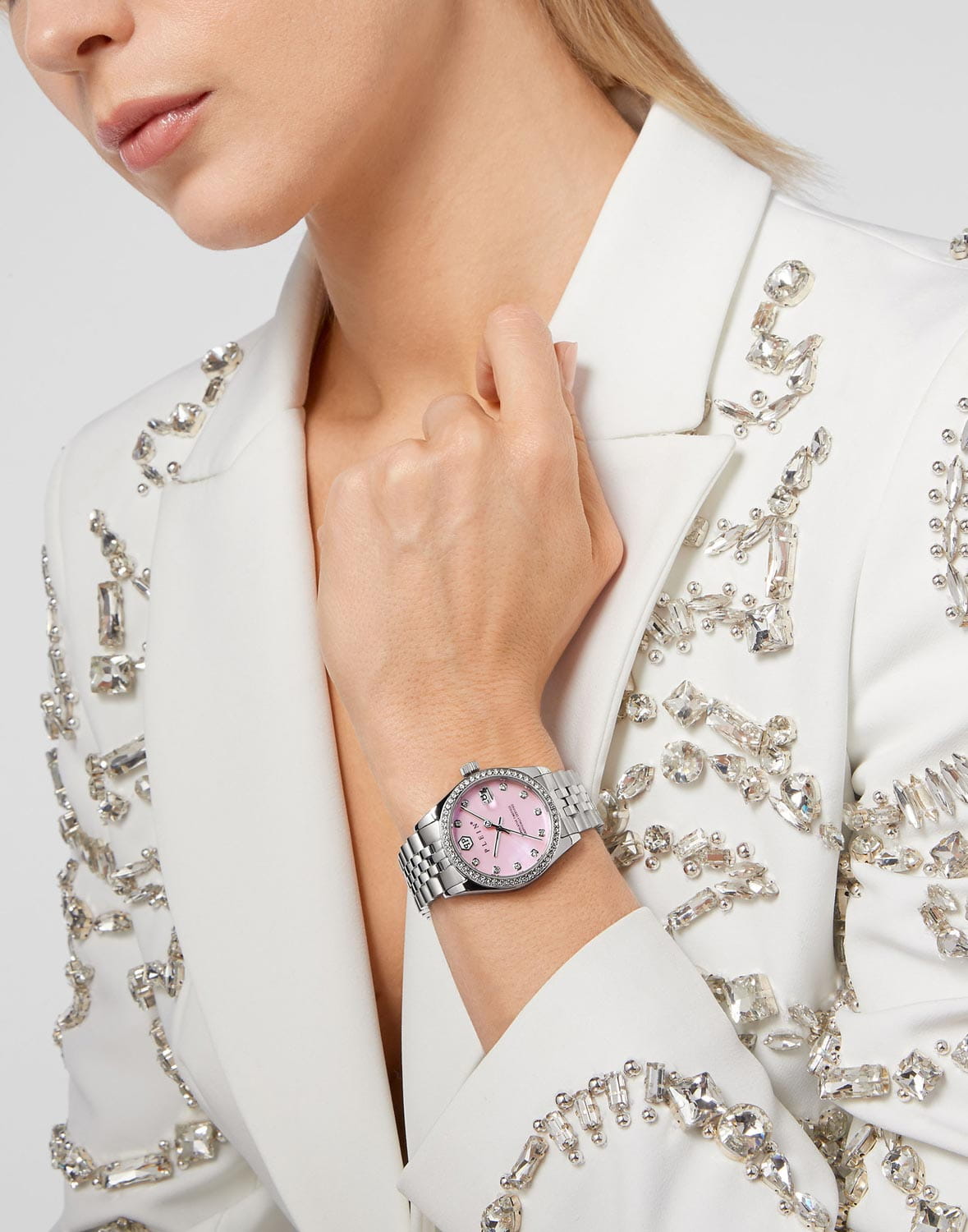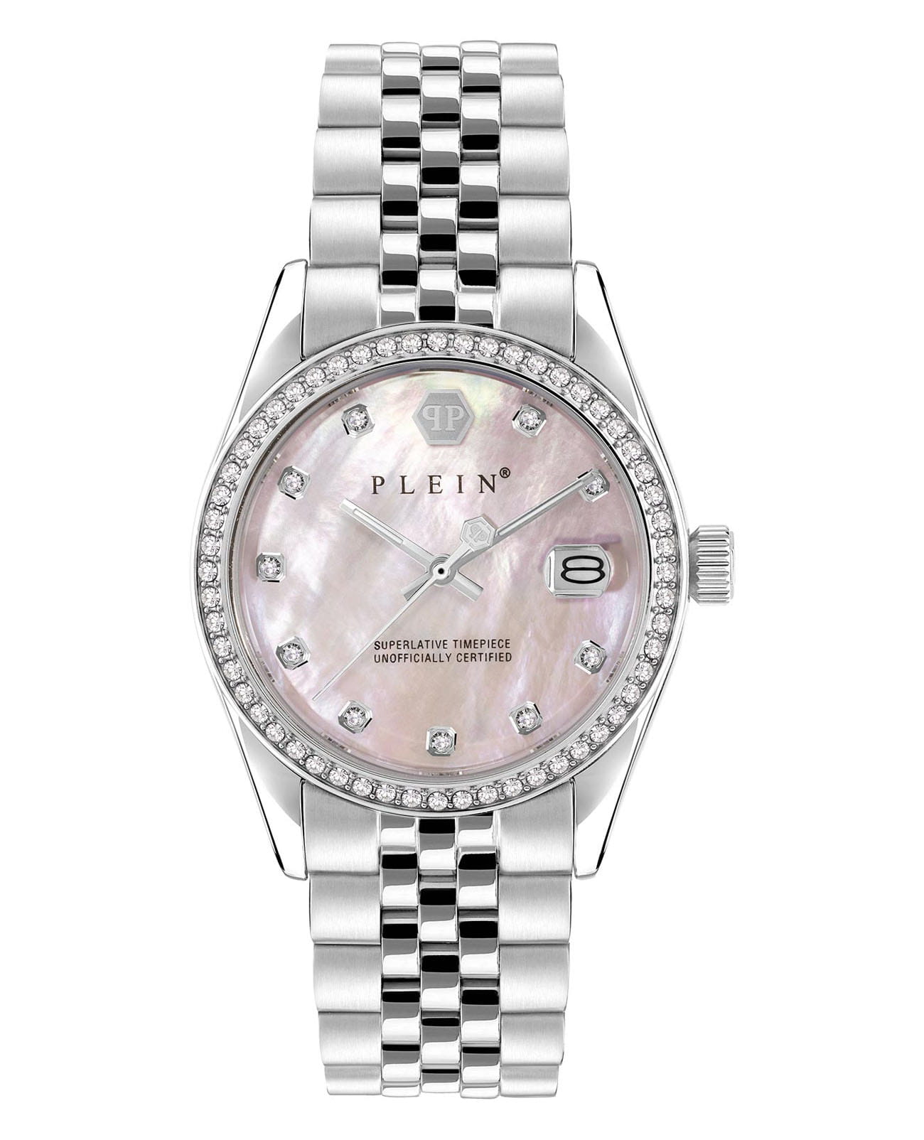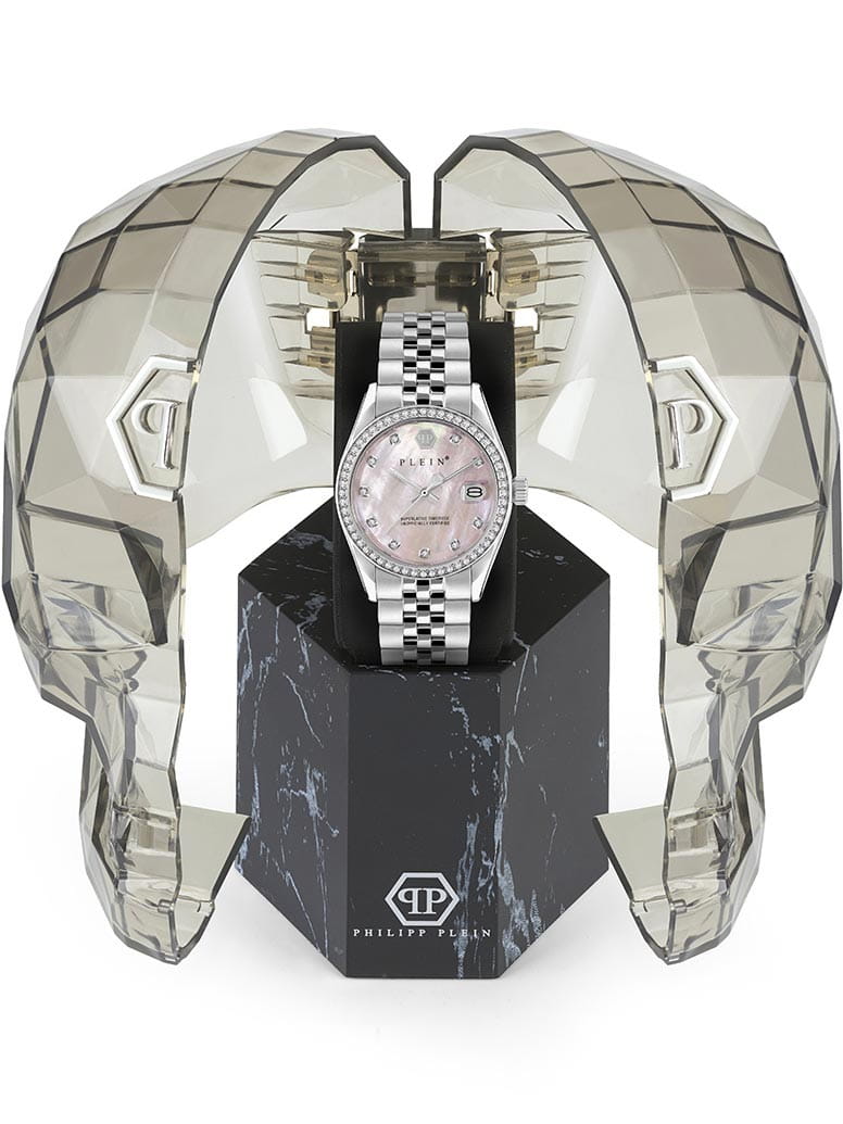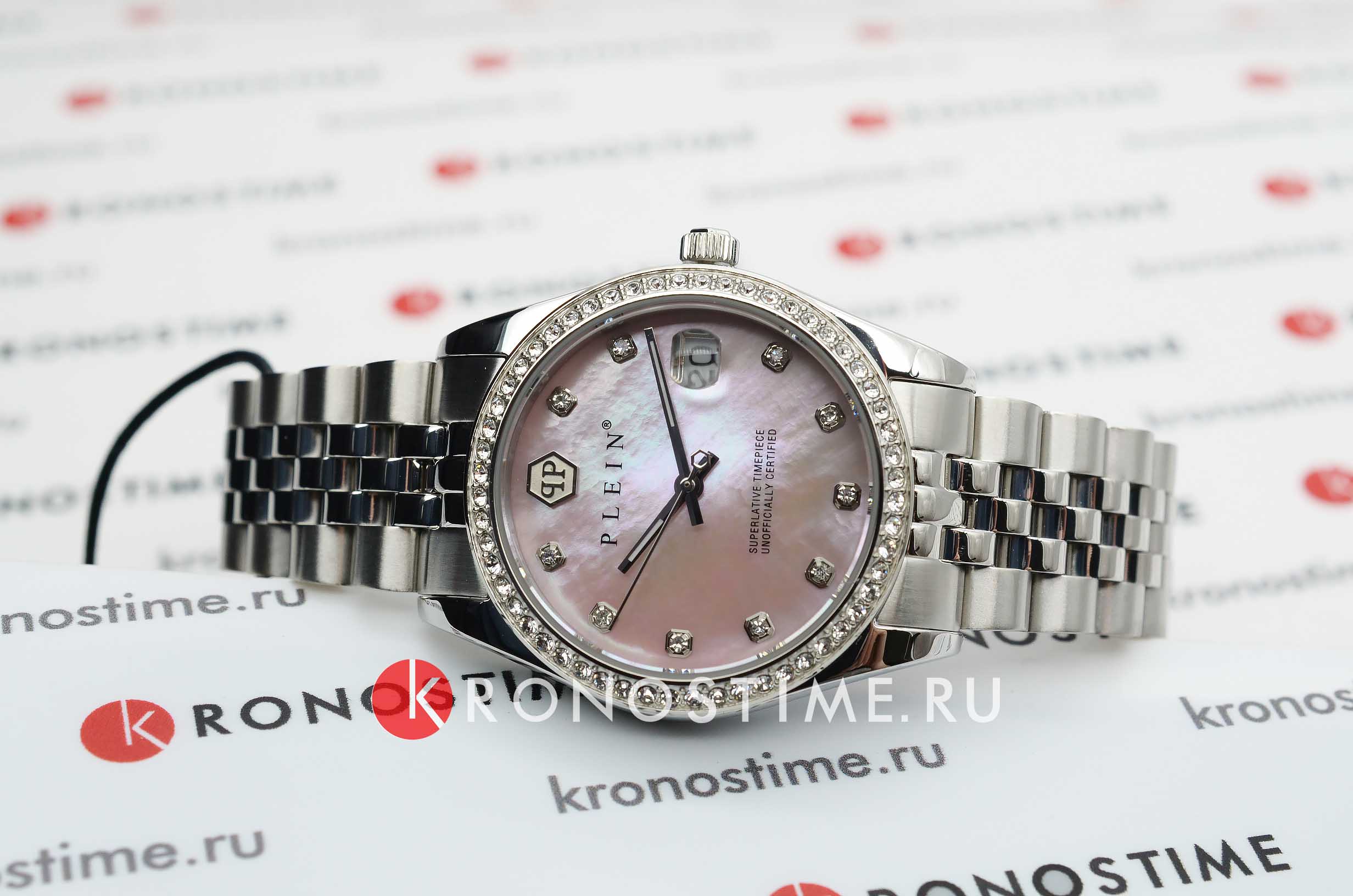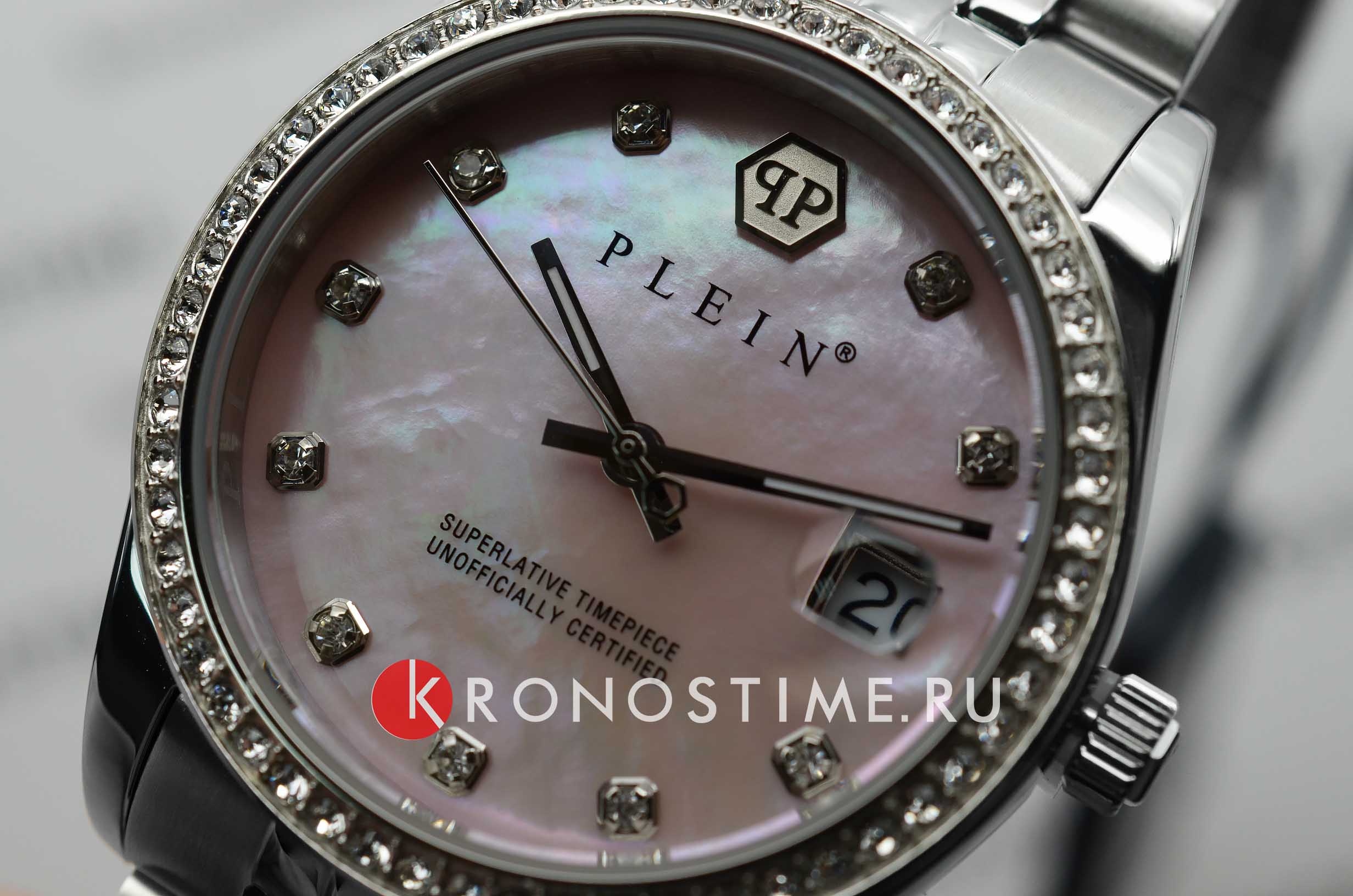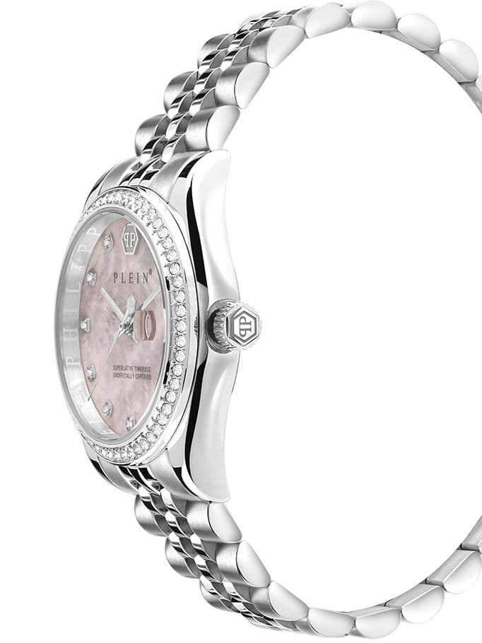 Яркие женские часы  Philipp Plein Date Superlative PWYAA0123 c с минеральным стекломМинеральное стеклоМинеральное стекло представляет собой искусственно выращенный минерал кварца. Такое стекло отличается особой устойчивостью к повреждениям и царапинам. Уступает по некоторым качествам сапфировому стеклу.. Особенные часы для особенных женщин! Ослепительный аксессуар, демонстрирующий роскошь и изысканность.Часы с круглым стальным корпусом. Перламутровый циферблат с метками в виде точек, украшенных кристаллами. Люминесцентное покрытиеЛюминесцентное покрытиеПозволяет считывать показания времени в темноте. Производители наносят на стрелки, часовые индексы, безель или поверхность циферблата светонакопительный состав, дающий холодное свечение. стрелок. Окошко даты с увеличительным стеклом находится в положении 3 часа. Рифленая заводная головка. Застёжка бабочка с кнопкамиЗастёжка "бабочка"Такой вид застёжки дополняется предохранителями, помогающими избежать случайного раскрытия браслета. Обладают изящным исполнением.