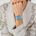Яркие женские часы Philipp Plein Date Superlative PWYAA0423 c с минеральным стекломМинеральное стеклоМинеральное стекло представляет собой искусственно выращенный минерал кварца. Такое стекло отличается особой устойчивостью к повреждениям и царапинам. Уступает по некоторым качествам сапфировому стеклу.. Особенные часы для особенных женщин! Ослепительный аксессуар, демонстрирующий роскошь и изысканность.Часы с круглым стальным корпусом. Перламутровый циферблат с метками в виде точек, украшенных кристаллами. Люминесцентное покрытиеЛюминесцентное покрытиеПозволяет считывать показания времени в темноте. Производители наносят на стрелки, часовые индексы, безель или поверхность циферблата светонакопительный состав, дающий холодное свечение. стрелок. Окошко даты с увеличительным стеклом находится в положении 3 часа. Рифленая заводная головка. Стальной браслет на застёжке бабочка с кнопкамиЗастёжка "бабочка"Такой вид застёжки дополняется предохранителями, помогающими избежать случайного раскрытия браслета. Обладают изящным исполнением.