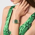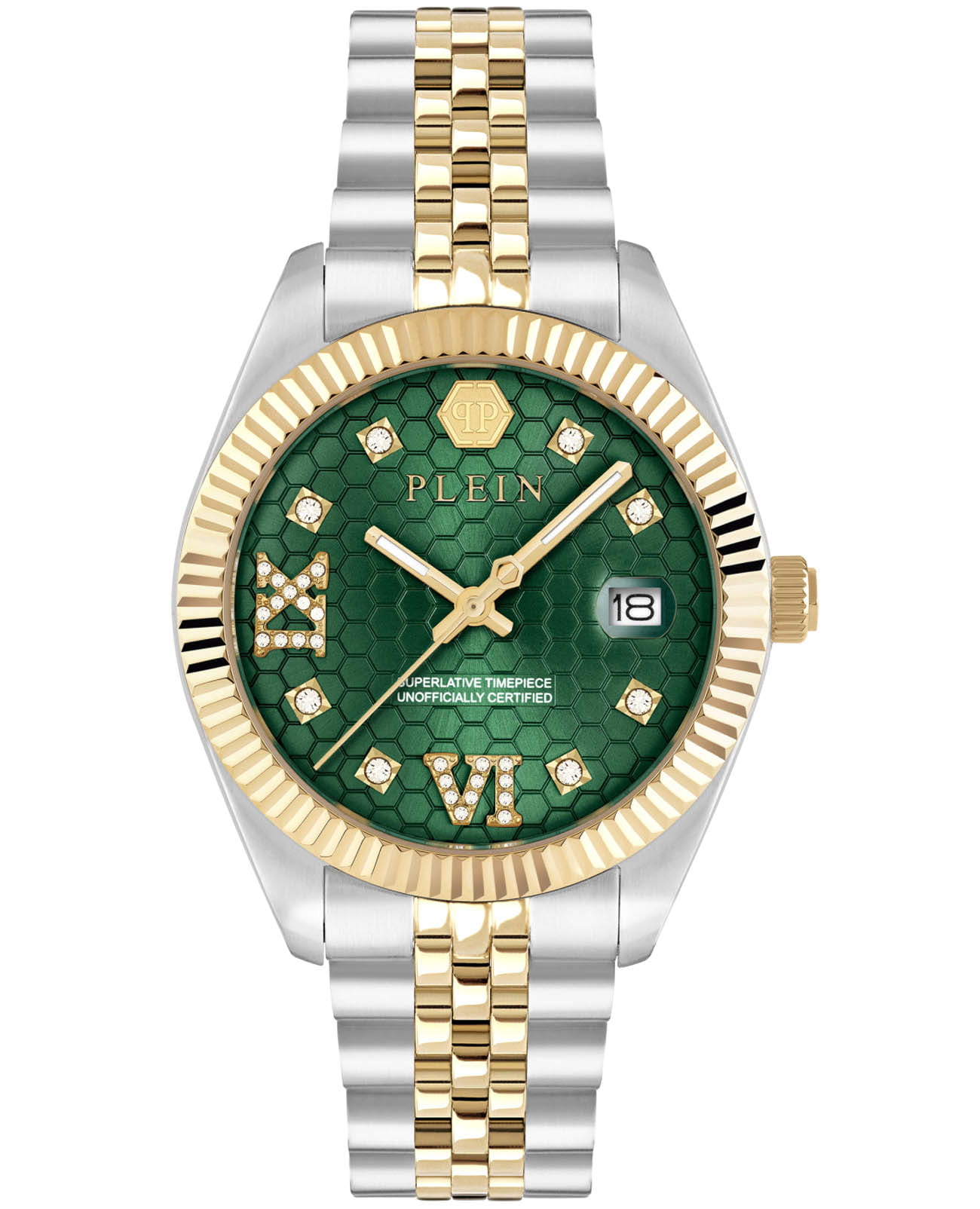 Женские кварцевые часы Philipp Plein Date Superlative PWYFA0225 — это стильное сочетание элегантности и современного дизайна. Изящный корпус выполнен из нержавеющей стали, диаметром 34 мм, что придаст образу женственности и романтизма. Изысканный циферблат с метками в виде точек придает модели особый блеск. Циферблат защищен минеральным стекломМинеральное стеклоМинеральное стекло представляет собой искусственно выращенный минерал кварца. Такое стекло отличается особой устойчивостью к повреждениям и царапинам. Уступает по некоторым качествам сапфировому стеклу., обеспечивающий устойчивость к царапинам и украшен кристаллами. Стрелки с люминесцентным покрытиемЛюминесцентное покрытиеПозволяет считывать показания времени в темноте. Производители наносят на стрелки, часовые индексы, безель или поверхность циферблата светонакопительный состав, дающий холодное свечение.. БезельБезельВнешний ободок, закрепляющий стекло. В спортивных часах так называется поворотное кольцо с делениями на циферблате, выполняет роль таймера – замеряет отрезки времени на шкале. Неподвижный безель – элемент декора. Однонаправленно вращающийся безель на дайверских часах позволяет фиксировать моменты погружения и выныривания на поверхность. с PVD-покрытиемPVDУльтратонкое покрытие наносится в технике вакуумного напыления, сочетает в себе нитрид титана особой прочности со слоем золота или оксида хрома. Несёт в себе декоративную или защитную функцию. золотистого цвета. Часы оснащены надежным кварцевым механизмом. Окошко даты находится в положении 3 часа. Стальной браслет с частичным PVD-покрытиемPVDУльтратонкое покрытие наносится в технике вакуумного напыления, сочетает в себе нитрид титана особой прочности со слоем золота или оксида хрома. Несёт в себе декоративную или защитную функцию. на застёжке-бабочкеЗастёжка "бабочка"Такой вид застёжки дополняется предохранителями, помогающими избежать случайного раскрытия браслета. Обладают изящным исполнением. , гарантирует комфортное и безопасное ношение. Класс водозащиты: 50 метров позволит защитить корпус от случайных брызг или капель дождя. Phlipp Plein — отличный выбор для тех, кто ценит яркость и качество.