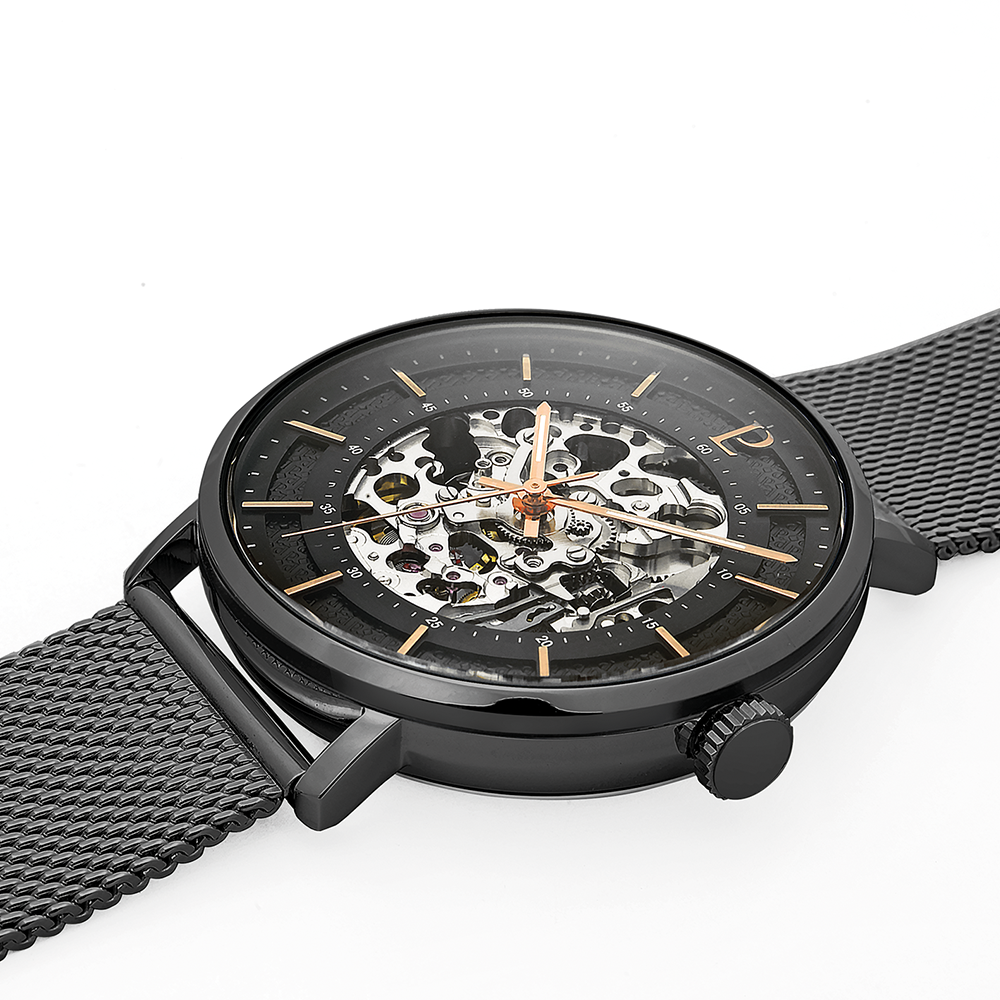 Мужские механические часы с автоподзаводом Pierre Lannier Gaius 324C439. Минеральное стеклоМинеральное стеклоМинеральное стекло представляет собой искусственно выращенный минерал кварца. Такое стекло отличается особой устойчивостью к повреждениям и царапинам. Уступает по некоторым качествам сапфировому стеклу. устойчивое к мелким механическим повреждениям. Центральные часовая, минутная и секундная стрелки. Корпус и браслет выполнен из нержавеющей стали с IP-покрытиемIP-покрытиеМетод ионного напыления. Демонстрирует повышенную устойчивость к истиранию, окислению и химическим веществам. Под воздействием высокого давления и температуры около 1500°C молекулы металла надёжно соединяются с частицами корпуса часов.. Водостойкость: 50 метров, позволит защитить корпус от случайных брызг или капель дождя. Браслет миланского плетения с раскладной застёжкойРаскладная застёжкаТакой тип застёжки используется только на браслетах из металла. Она никогда не раскрывается полностью, происходит разделение на 2 и более частей. Раскладывающая застёжка снизит вероятность потери часов к минимуму.. Стрелки с люминесцентным покрытиемЛюминесцентное покрытиеПозволяет считывать показания времени в темноте. Производители наносят на стрелки, часовые индексы, безель или поверхность циферблата светонакопительный состав, дающий холодное свечение.. Прозрачная задняя крышка.
