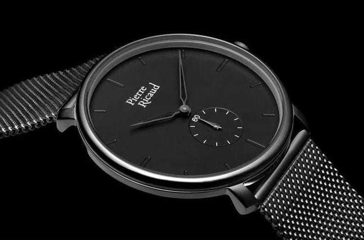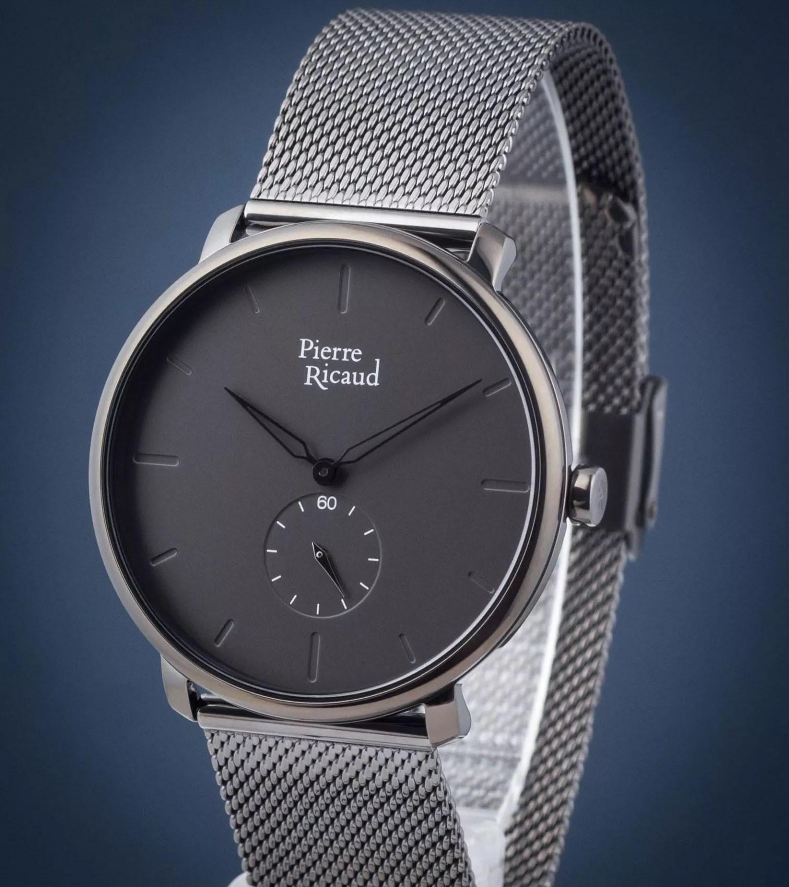 Мужские часы с минеральным стекломМинеральное стеклоМинеральное стекло представляет собой искусственно выращенный минерал кварца. Такое стекло отличается особой устойчивостью к повреждениям и царапинам. Уступает по некоторым качествам сапфировому стеклу. Pierre Ricaud P97168.S116Q, кварцевый механизм с высокой точностью. Класс водозащиты: 30 метров, позволит защитить корпус от случайных брызг или капель дождя. Корпус часов изготовлен из стали с IP-покрытиемIP-покрытиеМетод ионного напыления. Демонстрирует повышенную устойчивость к истиранию, окислению и химическим веществам. Под воздействием высокого давления и температуры около 1500°C молекулы металла надёжно соединяются с частицами корпуса часов.. Стальной браслет на раскладной застёжкеРаскладная застёжкаТакой тип застёжки используется только на браслетах из металла. Она никогда не раскрывается полностью, происходит разделение на 2 и более частей. Раскладывающая застёжка снизит вероятность потери часов к минимуму. с IP-покрытиемIP-покрытиеМетод ионного напыления. Демонстрирует повышенную устойчивость к истиранию, окислению и химическим веществам. Под воздействием высокого давления и температуры около 1500°C молекулы металла надёжно соединяются с частицами корпуса часов.. Вынесенная секундная стрелка.