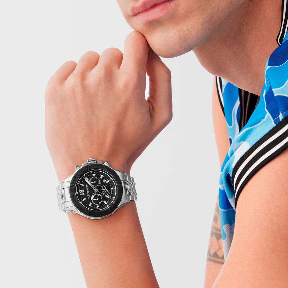 Дерзкий аксессуар со смелым, бунтарским дизайном будет с вами в любом приключении. Мужские кварцевые часы-хронографХронографФункция позволяет измерять отрезки времени с особой точностью: часы, минуты, секунды. Верным признаком хронографа является наличие на циферблате 3 дополнительных окошек-счётчиков. Plein Sport PS6BA0624. Корпус часов изготовлен из стали. Циферблат дополнен паттерном ''след когтей''. Рифленая заводная головка с защитой. Класс водозащиты: 50 метров, позволит защитить корпус от случайных брызг или капель дождя. БезельБезельВнешний ободок, закрепляющий стекло. В спортивных часах так называется поворотное кольцо с делениями на циферблате, выполняет роль таймера – замеряет отрезки времени на шкале. Неподвижный безель – элемент декора. Однонаправленно вращающийся безель на дайверских часах позволяет фиксировать моменты погружения и выныривания на поверхность. с IP-покрытиемIP-покрытиеМетод ионного напыления. Демонстрирует повышенную устойчивость к истиранию, окислению и химическим веществам. Под воздействием высокого давления и температуры около 1500°C молекулы металла надёжно соединяются с частицами корпуса часов..