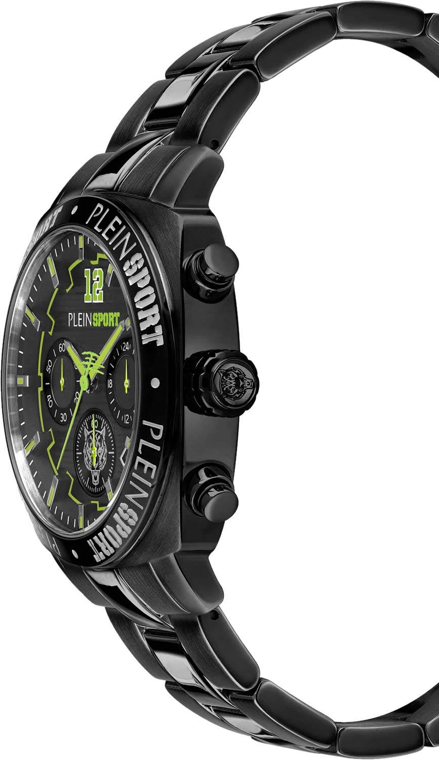 Немецкие мужские кварцевые часы-хронографХронографФункция позволяет измерять отрезки времени с особой точностью: часы, минуты, секунды. Верным признаком хронографа является наличие на циферблате 3 дополнительных окошек-счётчиков. с секундомеромСекундомерСекундоме́р — прибор, способный измерять интервалы времени с точностью до долей секунды. Plein Sport Wildcat PSGBA1523, кварцевый механизм с высокой точностью. Класс водозащиты: 50 метров, позволит защитить корпус от случайных брызг или капель дождя. Корпус часов изготовлен из стали с IP-покрытиемIP-покрытиеМетод ионного напыления. Демонстрирует повышенную устойчивость к истиранию, окислению и химическим веществам. Под воздействием высокого давления и температуры около 1500°C молекулы металла надёжно соединяются с частицами корпуса часов.. Стрелки и метки с люминесцентным покрытиемЛюминесцентное покрытиеПозволяет считывать показания времени в темноте. Производители наносят на стрелки, часовые индексы, безель или поверхность циферблата светонакопительный состав, дающий холодное свечение.. Стальной браслет на раскладной застёжкеРаскладная застёжкаТакой тип застёжки используется только на браслетах из металла. Она никогда не раскрывается полностью, происходит разделение на 2 и более частей. Раскладывающая застёжка снизит вероятность потери часов к минимуму. с IP-покрытиемIP-покрытиеМетод ионного напыления. Демонстрирует повышенную устойчивость к истиранию, окислению и химическим веществам. Под воздействием высокого давления и температуры около 1500°C молекулы металла надёжно соединяются с частицами корпуса часов.. Окошко даты находится в положении между 4 и 5 часов.