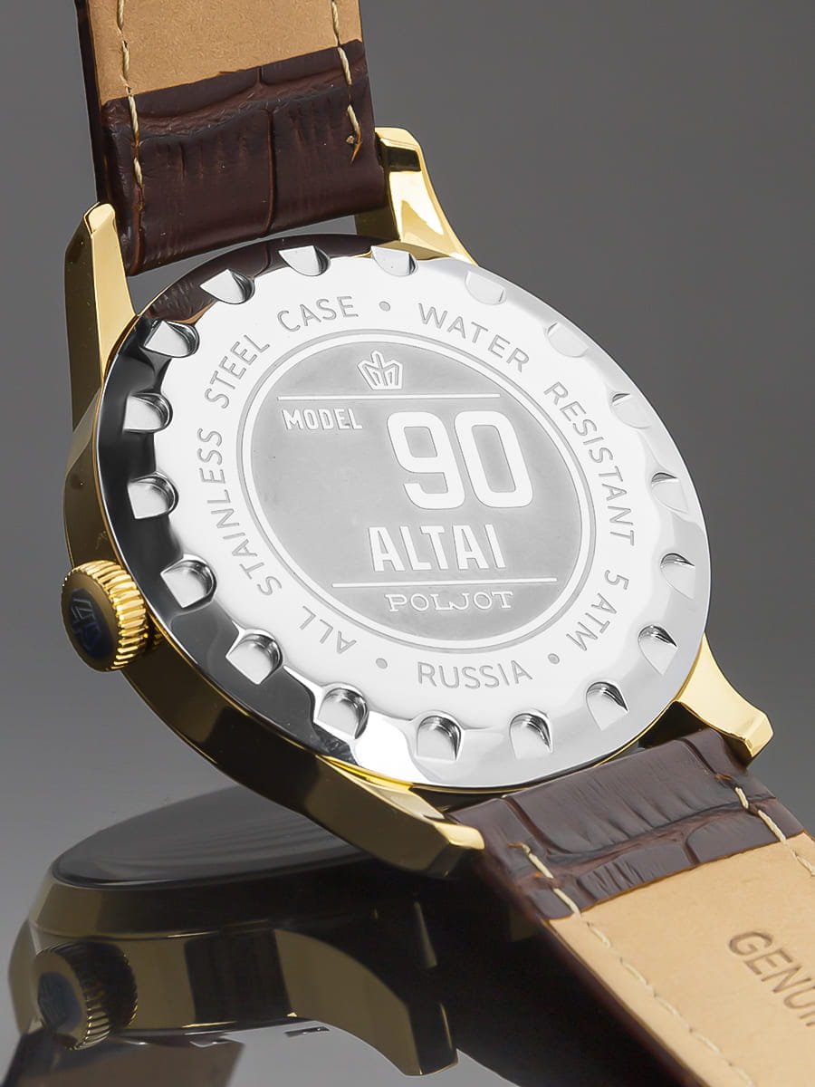 Poljot 8215.906222 — классические механические мужские часы с автоподзаводом, сочетающие сдержанный дизайн и надёжность российского часового производства. Корпус из нержавеющей стали с PVD-покрытиемPVDУльтратонкое покрытие наносится в технике вакуумного напыления, сочетает в себе нитрид титана особой прочности со слоем золота или оксида хрома. Несёт в себе декоративную или защитную функцию. подчёркивает строгость и универсальность модели, а циферблат с крупными арабскими цифрами и аккуратным окном даты на позиции «3 часов» обеспечивает превосходную читаемость. Стрелки и метки с люминесцентным покрытиемЛюминесцентное покрытиеПозволяет считывать показания времени в темноте. Производители наносят на стрелки, часовые индексы, безель или поверхность циферблата светонакопительный состав, дающий холодное свечение.. Механизм с автоподзаводом гарантирует стабильную работу и плавный ход стрелок. Прочное минеральное стеклоМинеральное стеклоМинеральное стекло представляет собой искусственно выращенный минерал кварца. Такое стекло отличается особой устойчивостью к повреждениям и царапинам. Уступает по некоторым качествам сапфировому стеклу. защищает циферблат от царапин, а ремешок из натуральной кожи придаёт часам современное и элегантное звучание. Poljot — это воплощение надёжности, классики и уверенного стиля, созданное для мужчин, предпочитающих традиционную механику и безупречный внешний вид.