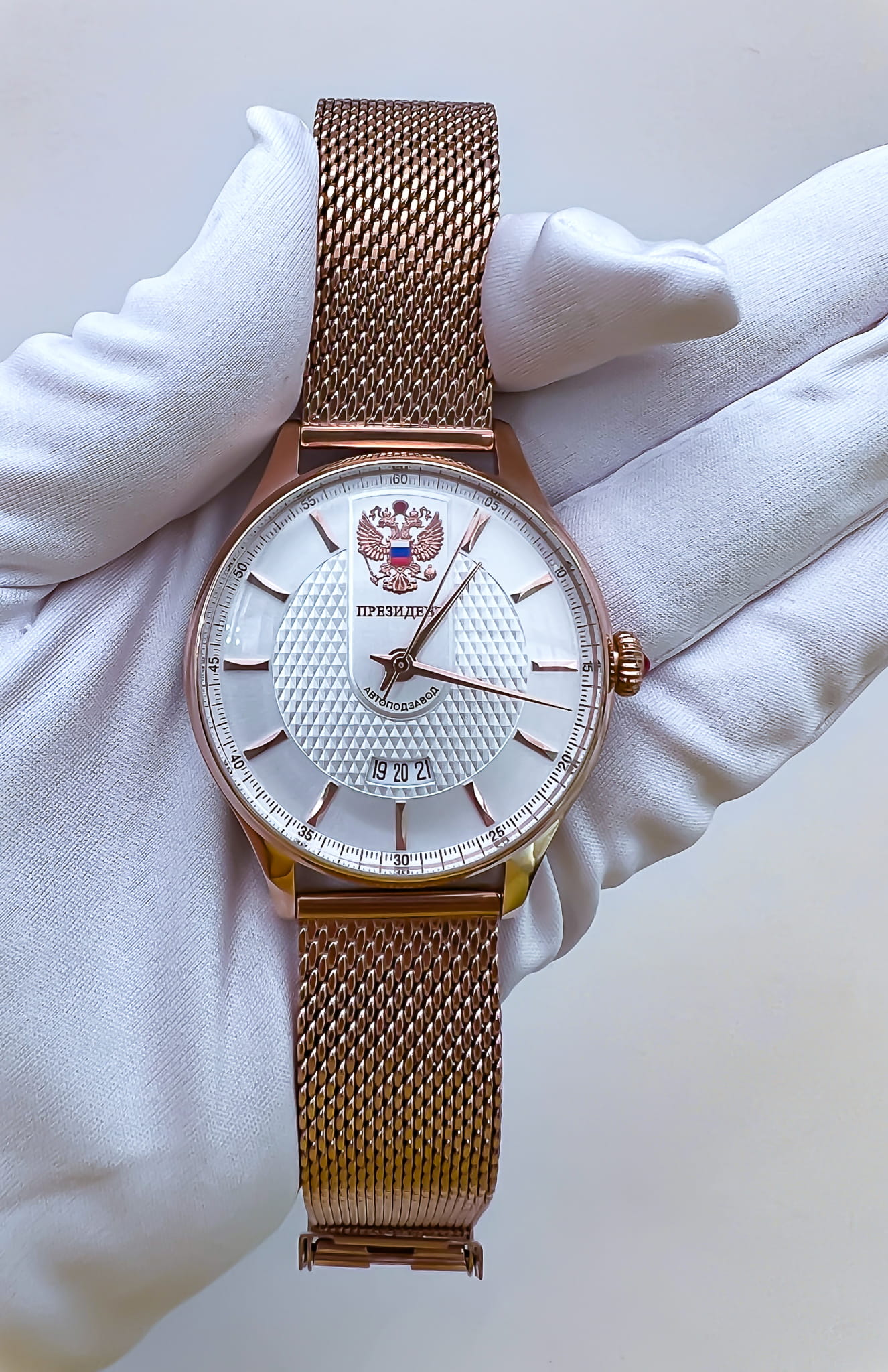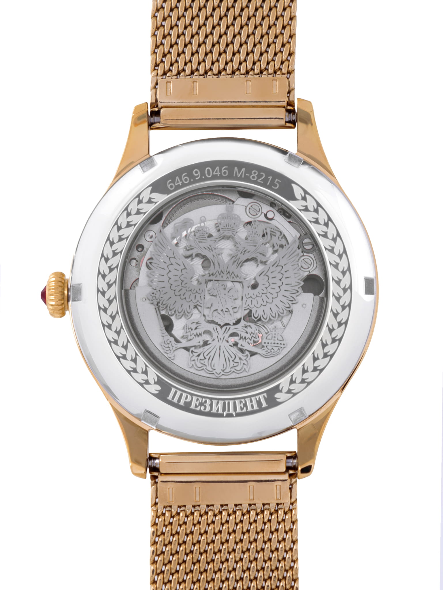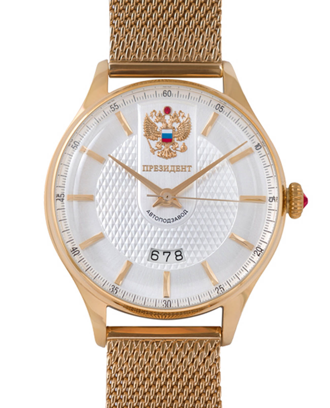 Часы «Президент» модели 6469046 — это мужские механические наручные часы с автоподзаводом, сочетающие изысканный дизайн и высокую функциональность. Механизм: японский механизм Miyota 8215 с автоподзаводом, обеспечивающий точность и долговечность. Функции: часы, минуты, секунды, дата. Корпус: из нержавеющей стали с PVD-покрытиемPVDУльтратонкое покрытие наносится в технике вакуумного напыления, сочетает в себе нитрид титана особой прочности со слоем золота или оксида хрома. Несёт в себе декоративную или защитную функцию., диаметром 42 мм. Циферблат: с изображением государственного герба России, подчёркивающий статусность модели. Стекло: минеральноеМинеральное стеклоМинеральное стекло представляет собой искусственно выращенный минерал кварца. Такое стекло отличается особой устойчивостью к повреждениям и царапинам. Уступает по некоторым качествам сапфировому стеклу., устойчивое к царапинам. Водонепроницаемость: 3 ATM (30 метров), защищает от случайных брызг и дождя. Стальной браслет миланского плетения на раскладном замкеРаскладной замокДанный вариант застежки используется только на часах с металлическим браслетом. Отличительная особенность такого крепления в том, что длина браслета становится универсальной и вы можете самостоятельно отрегулировать нужный вам размер – застежка просто двигается по браслету часов. с PVD-покрытиемPVDУльтратонкое покрытие наносится в технике вакуумного напыления, сочетает в себе нитрид титана особой прочности со слоем золота или оксида хрома. Несёт в себе декоративную или защитную функцию.. Эти часы идеально подойдут для деловых людей, ценящих стиль, надёжность и точность механического хода.