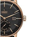 Тёмный циферблат с оригинальным узором и отдельным секундным счётчиком привлекает минималистичным оформлением. Наручные часы оснащены автоматическим калибром ETA C07.611 с резервом хода на 80 часов, высокая точность подтверждается официальным сертификатом COSCСертификат COSCОфициальный сертификат, подтверждающий то, что часы ходят с особо высокой точностью. Для получения документа часы подвергаются тестовым испытаниям, разработанным швейцарским институтом тестирования хронометров COSC. Допустимая норма для механических часов -4/+6 секунд в день, для кварцевых моделей +/- 0,07 секунд в день.. Скелетонизированная задняя крышка. Прочный корпус с PVD-покрытиемPVDУльтратонкое покрытие наносится в технике вакуумного напыления, сочетает в себе нитрид титана особой прочности со слоем золота или оксида хрома. Несёт в себе декоративную или защитную функцию.. Сапфировое стекло с антибликовой поверхностью. Ремешок из натуральной кожи. Диаметр корпуса: 41 мм.