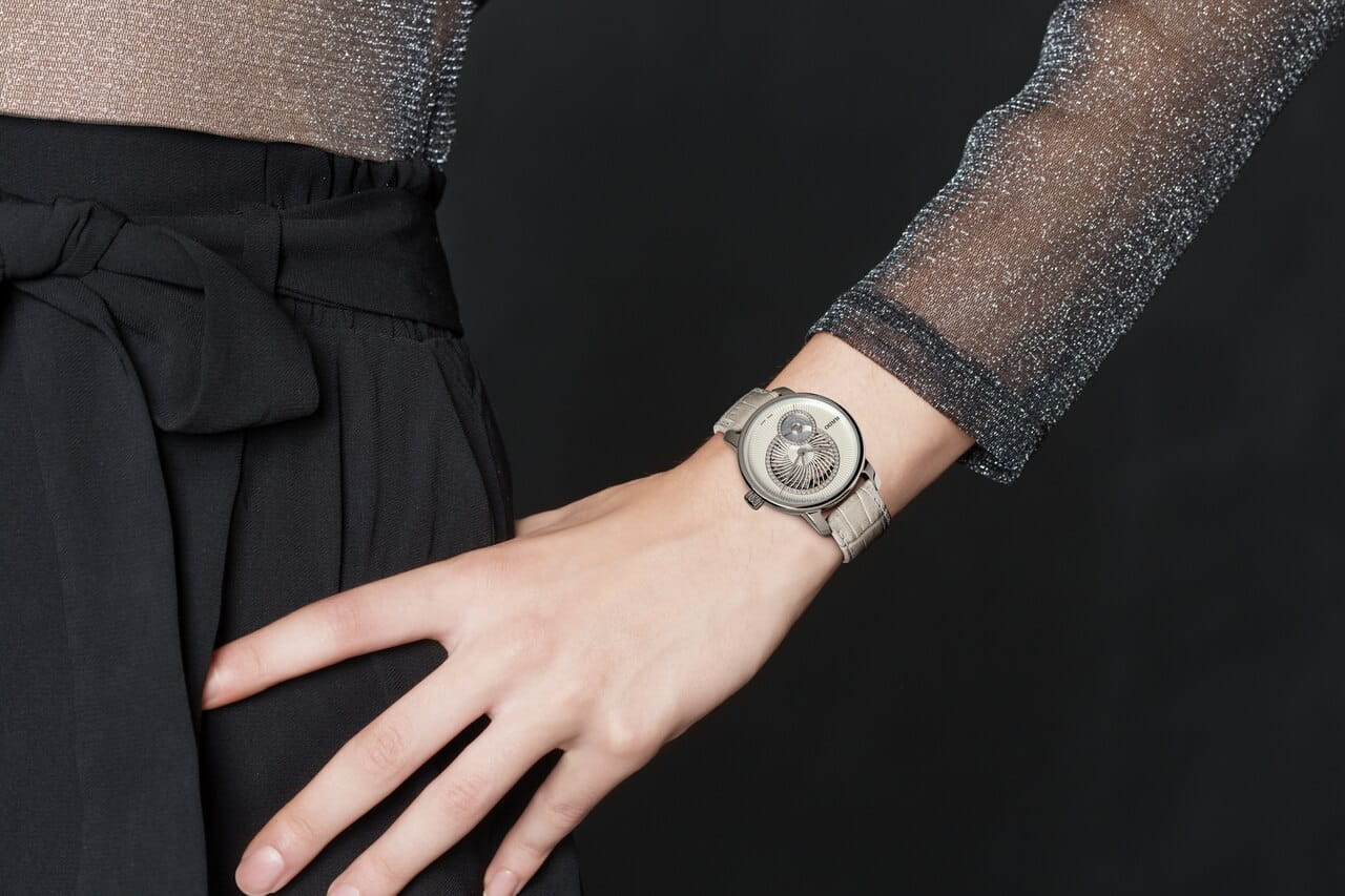 Дизайн модели является действительно роскошным - светлый циферблат дополнен двумя окружностями, декорированными сияющими драгоценными камнями. Перламутровое окошко украшено 32 бриллиантами в 0,113 карат, а скелетонизированное отверстие, сквозь которое просматривается движение деталей механизма, инкрустировано 39 бриллиантами в 0,035 карат. Часы оснащены автоматическим калибром ETA C07.631 с увеличенным резервом хода до 80 часов. Сапфировое стекло с антибликовой обработкой. Корпус из плазменной керамикиВысокотехнологичная плазменная керамикаИнновационный материал, технология запатентована. Выплавление керамики осуществляется в печи при 20 000 °C, белоснежный материал под воздействием ультравысокой температуры приобретает уникальный блеск, присущий металлам.. Прозрачная задняя крышка. Ремешок из натуральной кожи с системой быстрой установки. Водостойкость 50 метров. Диаметр корпуса: 35 мм.