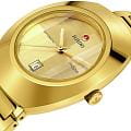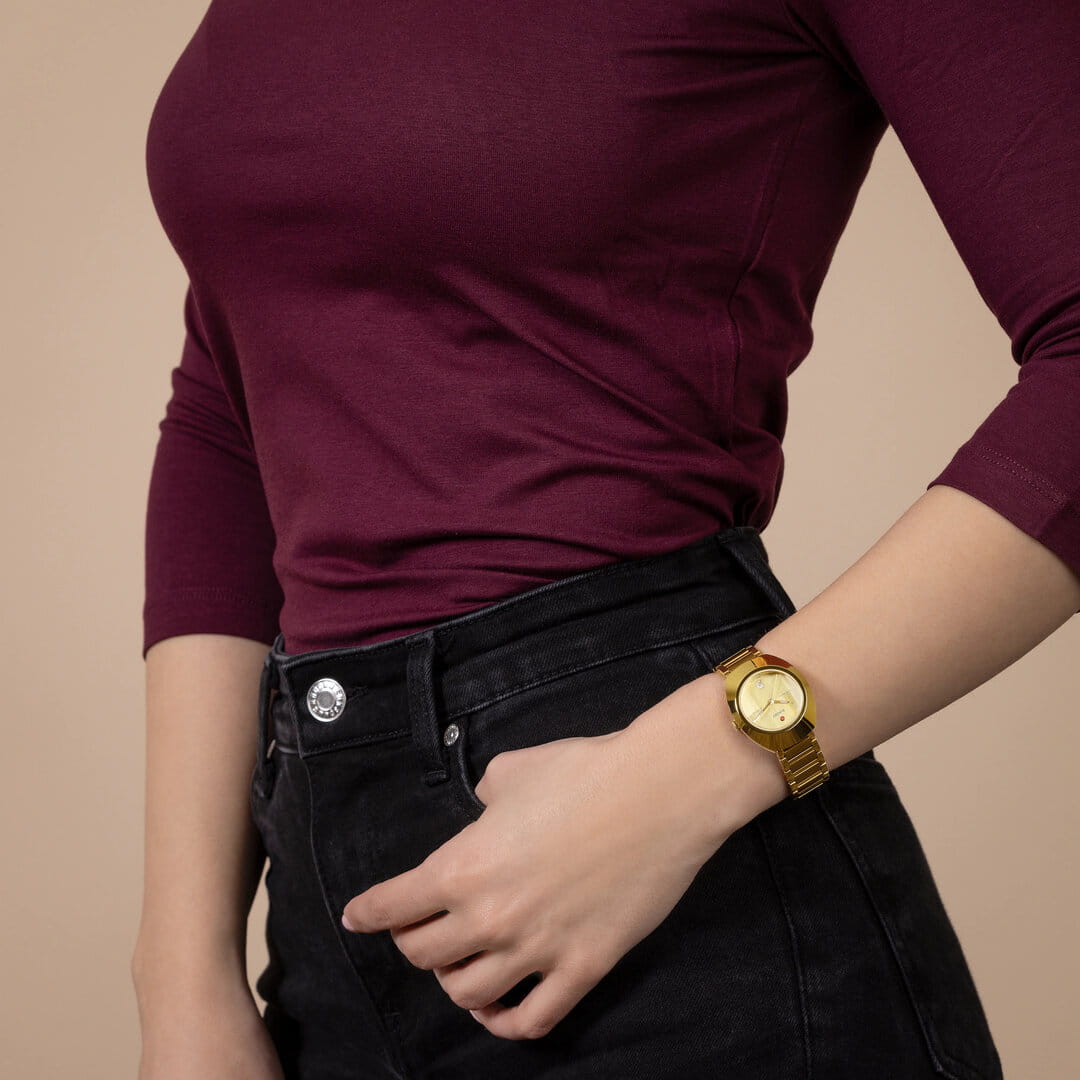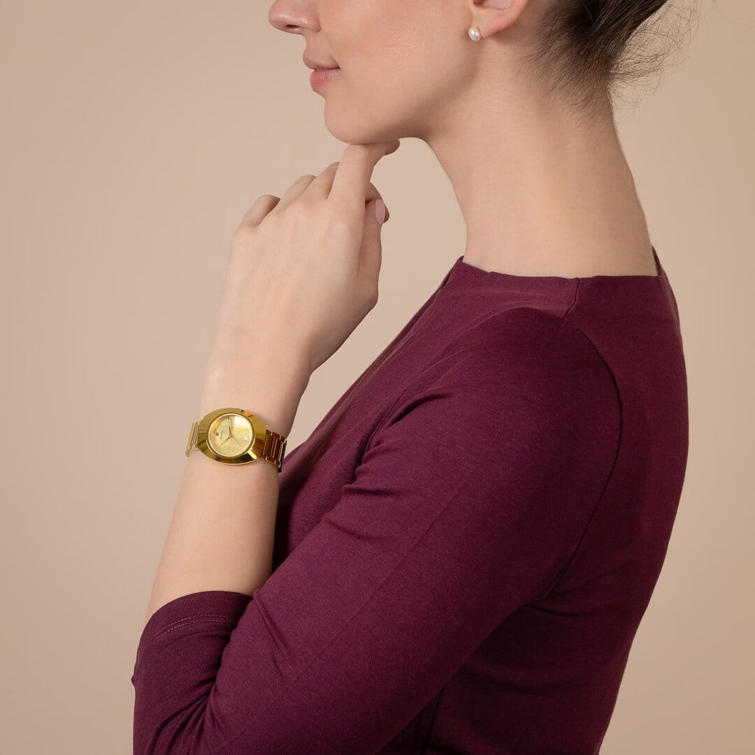 Женские механические часы с автоподзаводом Rado из коллекции Diastar Original — это элегантный аксессуар с классическим дизайном. Корпус овальной формы, диаметром 30 мм и толщиной 11 мм, выполнен из CeramosCeramosМатериал являет собой инновационное сочетание высокотехнологичной керамики и сплава металла. Он объединяет керамическую устойчивость к царапинам и металлический роскошный блеск. с PVD-покрытиемPVDУльтратонкое покрытие наносится в технике вакуумного напыления, сочетает в себе нитрид титана особой прочности со слоем золота или оксида хрома. Несёт в себе декоративную или защитную функцию. золотого цвета. Неподвижный безельБезельВнешний ободок, закрепляющий стекло. В спортивных часах так называется поворотное кольцо с делениями на циферблате, выполняет роль таймера – замеряет отрезки времени на шкале. Неподвижный безель – элемент декора. Однонаправленно вращающийся безель на дайверских часах позволяет фиксировать моменты погружения и выныривания на поверхность. также изготовлен из Ceramos. Циферблат жёлтого цвета оформлен без индексов, с золотистыми стрелками. Циферблат защищён сапфировым стекломСапфировое стеклоПрочный и надёжный материал из кристалла сапфира синтетического происхождения, характеризующийся особой твёрдостью и устойчивостью к царапинам и повреждениям. с антибликовым покрытиемАнтибликовое покрытиеСлой оксида металла в 0,13-0,3 микрон, благодаря которому стекло часов не бликует и не отражает свет. Антибликовое покрытие уменьшает отражение света в 10 раз, обеспечивая отличную читаемость показателей циферблата. на внутренней стороне. Стрелки с люминесцентным покрытиемЛюминесцентное покрытиеПозволяет считывать показания времени в темноте. Производители наносят на стрелки, часовые индексы, безель или поверхность циферблата светонакопительный состав, дающий холодное свечение. Super-Luminova®, обеспечивающим хорошую читаемость в темноте. Механизм — автоматический калибр R586 с запасом хода 48 часов, частотой 28 800 полуколебаний в час и 25 камнями. Окошко даты расположено в положении 6 часов. Часы оснащены стальным браслетом с застёжкой «бабочка» с кнопкамиЗастёжка "бабочка"Такой вид застёжки дополняется предохранителями, помогающими избежать случайного раскрытия браслета. Обладают изящным исполнением. . Водонепроницаемость 100 м позволяет использовать часы для плавания. Гарантия — 5 лет на механизм, 2 года на изделие. Идеальный выбор для тех, кто ценит стиль, точность и швейцарское качество.