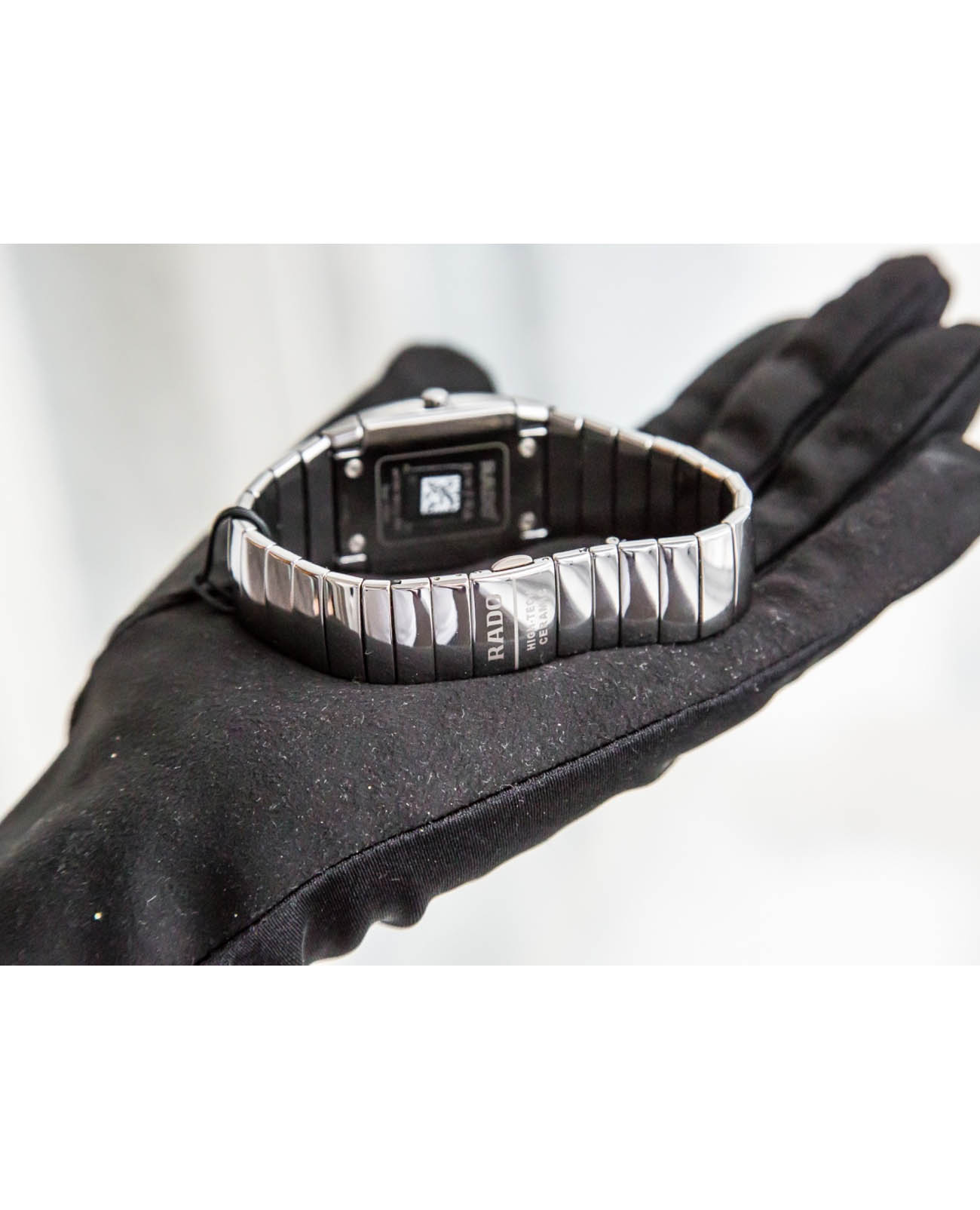 Швейцарские наручные часы с надёжным кварцевым механизмом Rado Sintra R13779702. Корпус и браслет часов изготовлены из материала CeramosCeramosМатериал являет собой инновационное сочетание высокотехнологичной керамики и сплава металла. Он объединяет керамическую устойчивость к царапинам и металлический роскошный блеск. . Сапфировое стеклоСапфировое стеклоПрочный и надёжный материал из кристалла сапфира синтетического происхождения, характеризующийся особой твёрдостью и устойчивостью к царапинам и повреждениям. устойчивое к мелким механическим повреждениям. Окошко даты находится в положении 6 часов. Циферблат инкрустирован бриллиантами. Класс водозащиты: 30 метров, позволит защитить корпус от случайных брызг или капель дождя. Браслет на раскладной застёжкеРаскладная застёжкаТакой тип застёжки используется только на браслетах из металла. Она никогда не раскрывается полностью, происходит разделение на 2 и более частей. Раскладывающая застёжка снизит вероятность потери часов к минимуму..