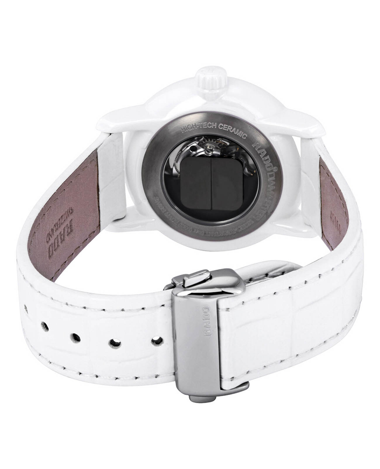 Женские швейцарские механические часы с автоподзаводом Rado Diamaster R14044925. Сапфировое стеклоСапфировое стеклоПрочный и надёжный материал из кристалла сапфира синтетического происхождения, характеризующийся особой твёрдостью и устойчивостью к царапинам и повреждениям. устойчивое к мелким механическим повреждениям. Корпус часов изготовлен из высокотехнологичной керамикиВысокотехнологичная керамикаИнновационный запатентованный Rado материал с гладкой или матовой поверхностью. Керамика за счёт кристаллической структуры обладает повышенной устойчивостью от возникновения царапин. Материал способен принимать температуру тела человека, обеспечивая невероятный комфорт при ношении.. Окошко даты находится в положении 6 часов. Класс водозащиты: 50 метров, позволит защитить корпус от случайных брызг или капель дождя. Кожаный ремешок с раскладной застёжкойРаскладная застёжкаТакой тип застёжки используется только на браслетах из металла. Она никогда не раскрывается полностью, происходит разделение на 2 и более частей. Раскладывающая застёжка снизит вероятность потери часов к минимуму..