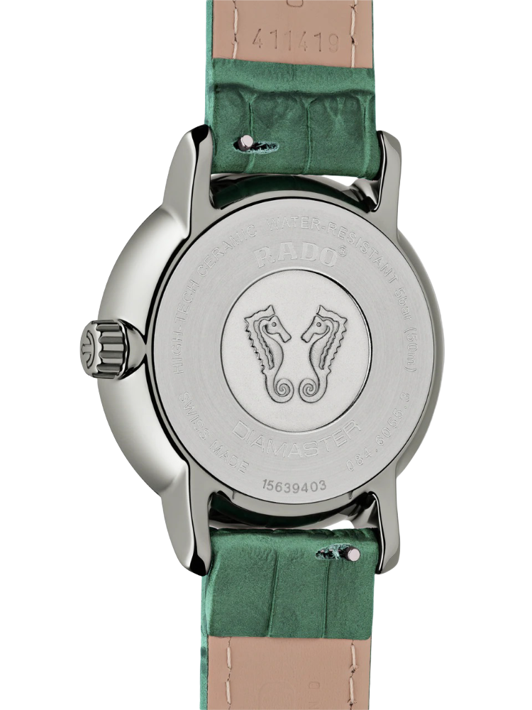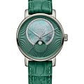 Аксессуар премиальной категории сразу бросается в глаза благодаря насыщенному изумрудному исполнению. Отдельную привлекательность представляет собой узорчатый циферблат с перламутровой вставкой, декорированный 21 бриллиантами в 0,060 карат. Корпус и безель сделаны из плазменной керамикиВысокотехнологичная плазменная керамикаИнновационный материал, технология запатентована. Выплавление керамики осуществляется в печи при 20 000 °C, белоснежный материал под воздействием ультравысокой температуры приобретает уникальный блеск, присущий металлам., что обеспечивает максимально комфортное ношение. Кварцевый механизм ETA F05.841. Сапфировое стекло с антибликовой поверхностью. Задняя крышка с гравировкой. Кожаный ремешок из натурального материала. Миниатюрное окошко отображает фазы луны. Диаметр корпуса: 35 мм.